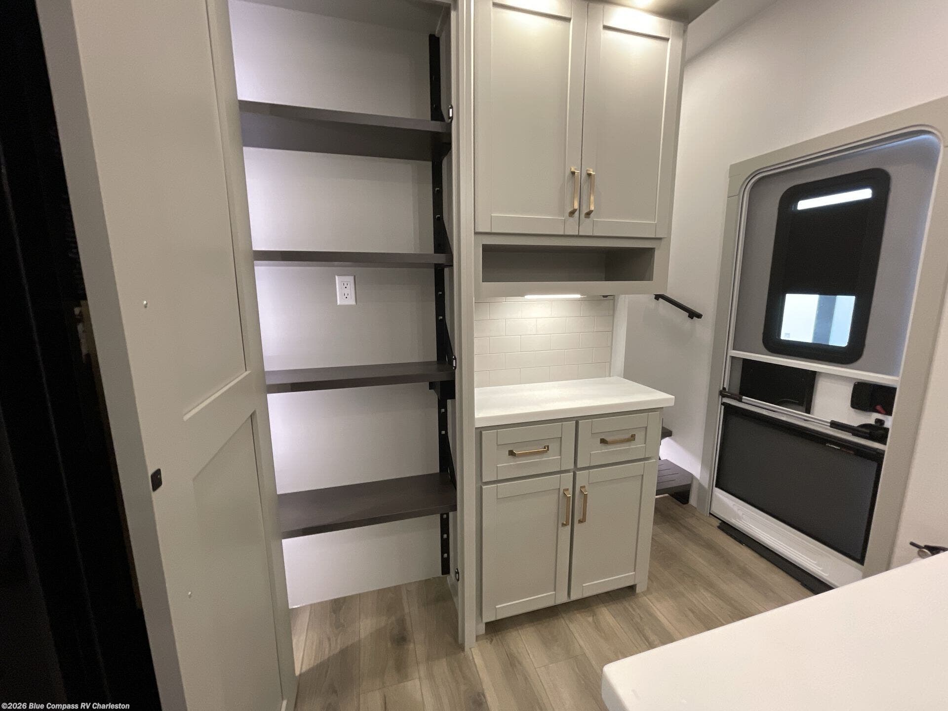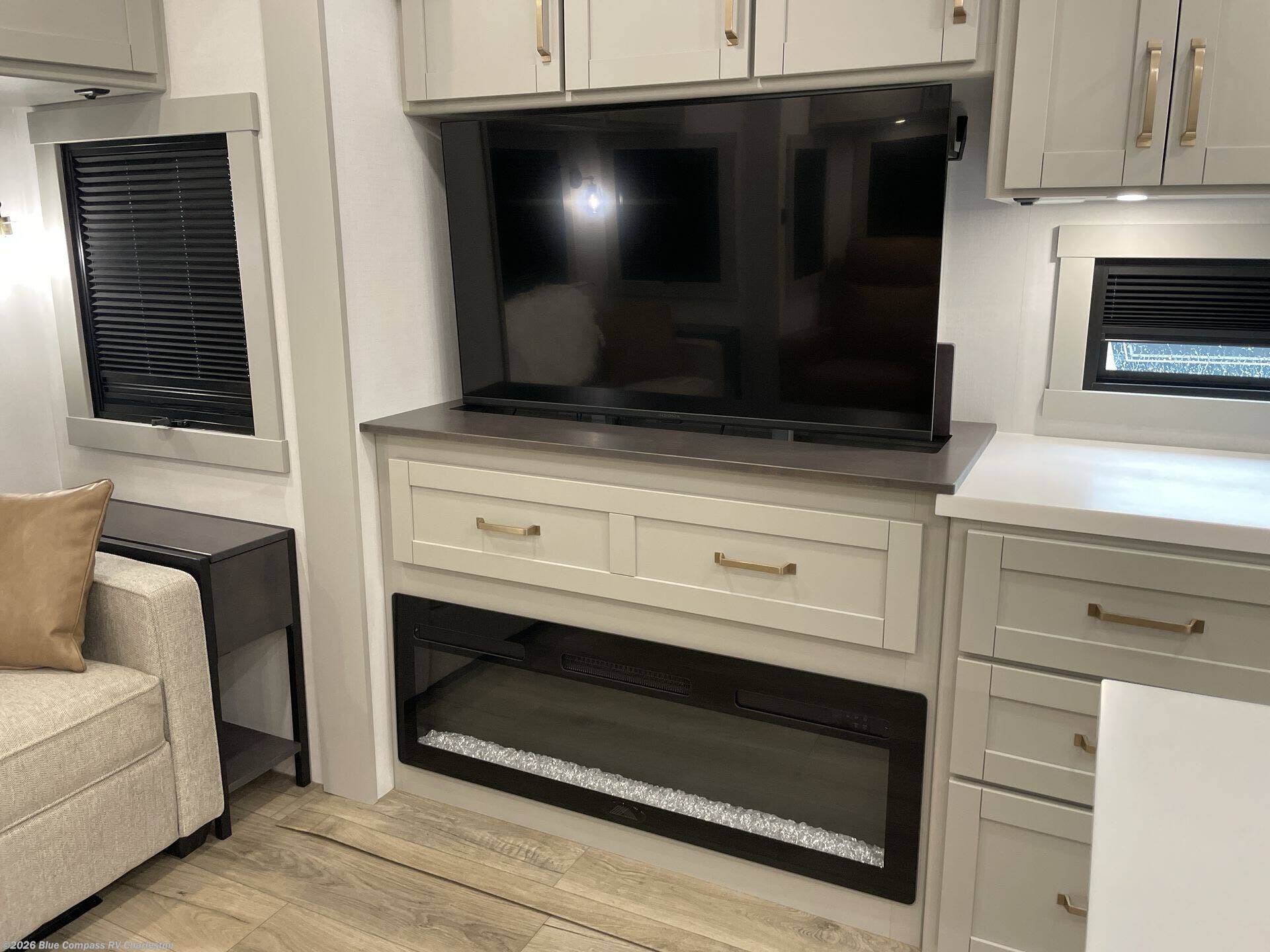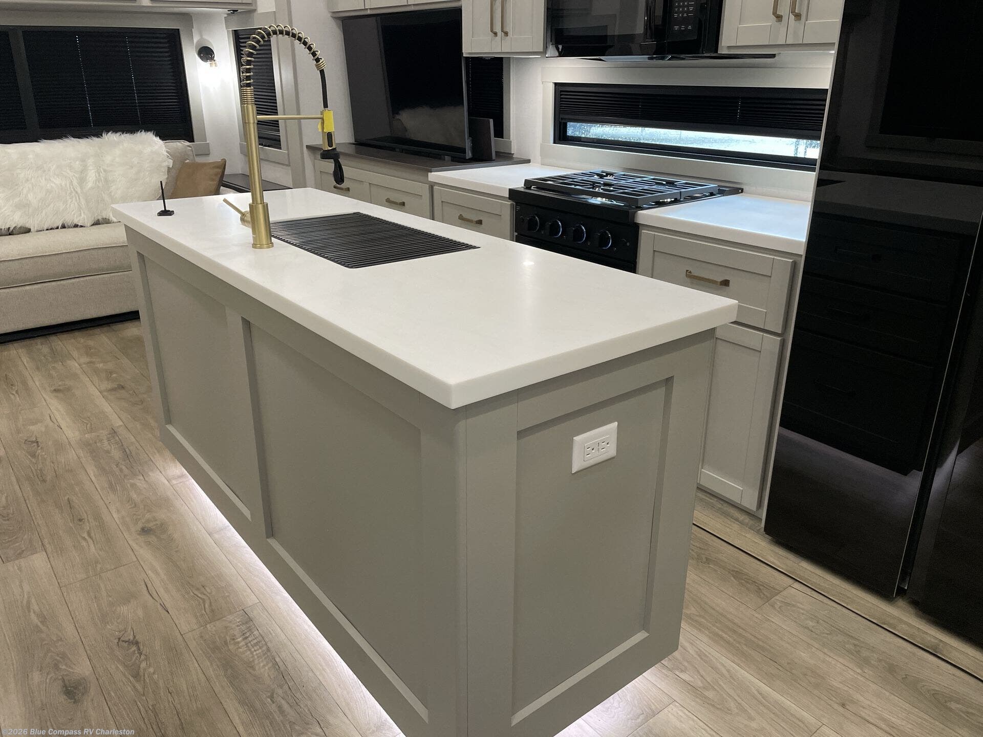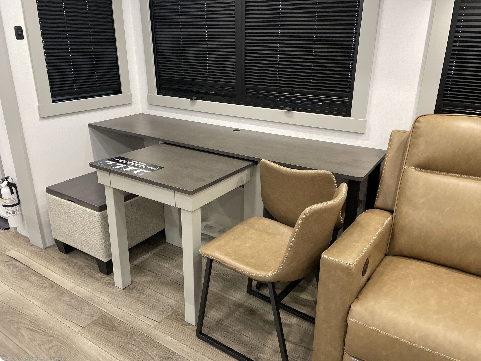 This unit is perfect for weekends at the campground or extended stays! There is ample seating with a sliding desk/dining table, 62" theater seating, and a 72" tri-fold sofa along the rear wall. You can easily relax and enjoy the telescoping TV with a cozy fireplace below. The kitchen offers all that you need to prepare and cook meals just like home with a 16-cu. ft. refrigerator for your perishables, a 30" residential microwave oven, and three burner range top and oven. You will love the kitchen island all outfitted with pull-out pet bowls and double pull-out trash bins with an integrated Stow & Go paper towel holder. There is also an 84" pantry with adjustable shelves for all of your canned and dry goods. Head up the steps to a find a full bath and a private bedroom with a king bed slide all the way up front. A sliding dresser top features hidden storage which is perfect for jewelry and other personal belongings. The front wardrobe features mirrored doors, and the corner closet has been prepped for a stackable washer and dryer if you choose to add that option.