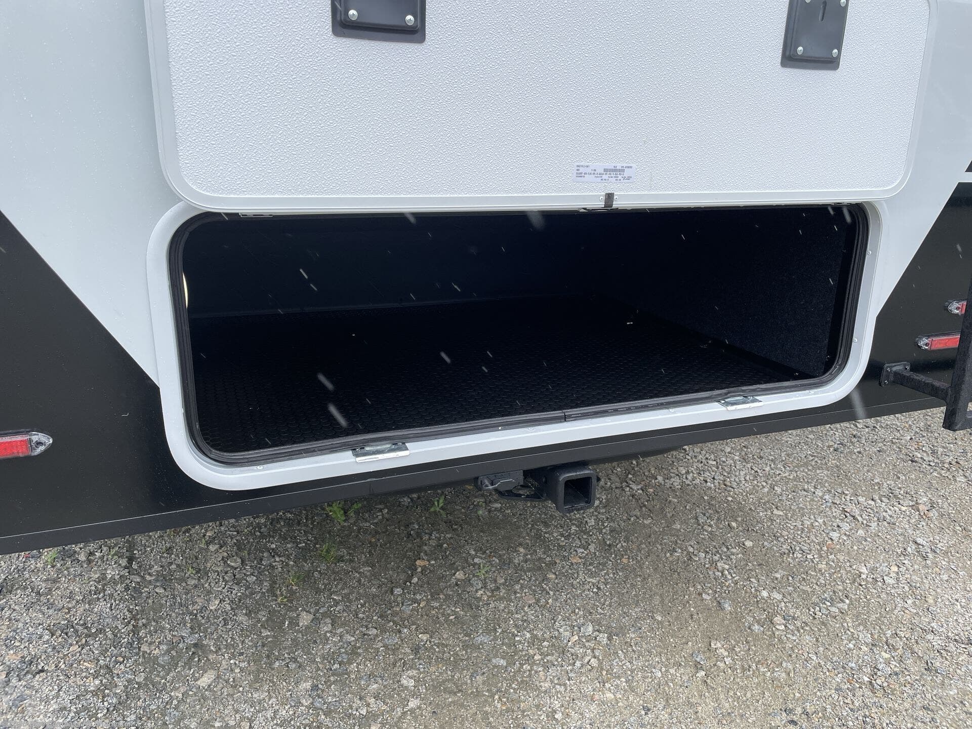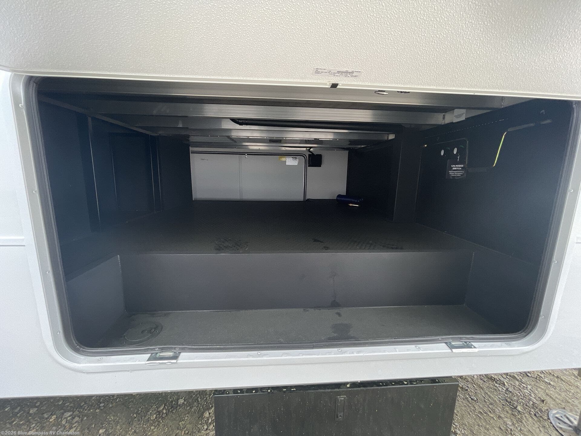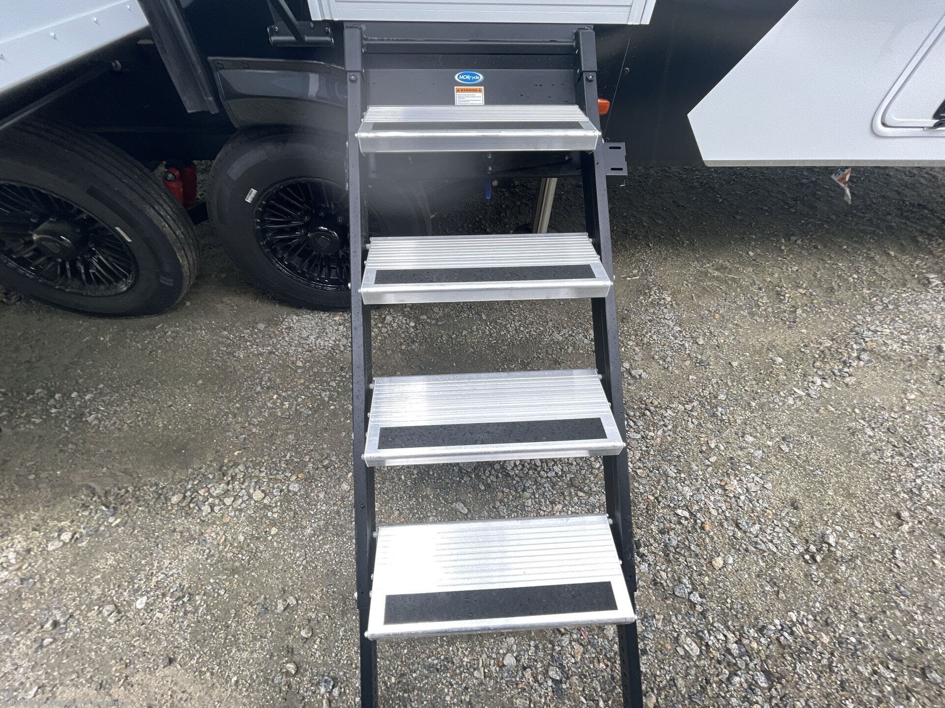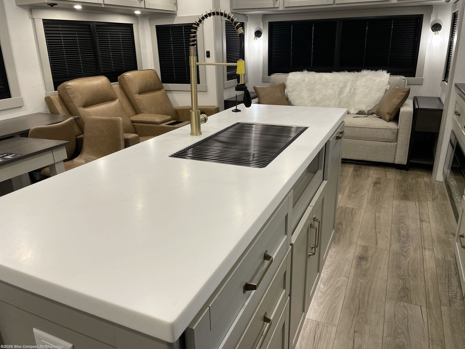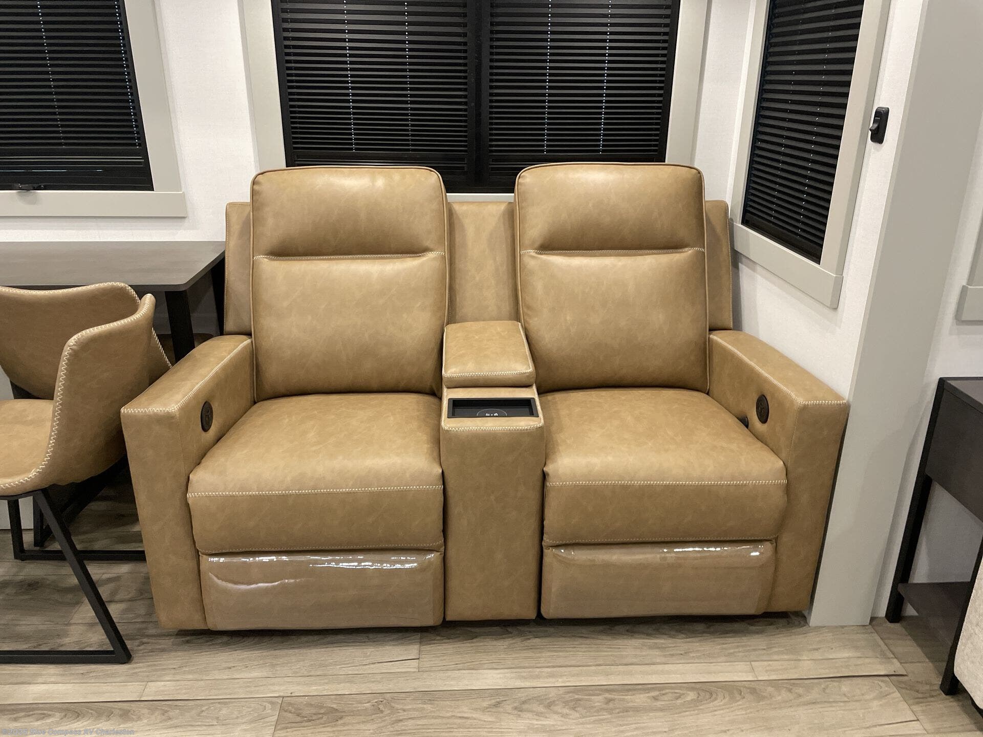 This unit is perfect for weekends at the campground or extended stays! There is ample seating with a sliding desk/dining table, 62" theater seating, and a 72" tri-fold sofa along the rear wall. You can easily relax and enjoy the telescoping TV with a cozy fireplace below. The kitchen offers all that you need to prepare and cook meals just like home with a 16-cu. ft. refrigerator for your perishables, a 30" residential microwave oven, and three burner range top and oven. You will love the kitchen island all outfitted with pull-out pet bowls and double pull-out trash bins with an integrated Stow & Go paper towel holder. There is also an 84" pantry with adjustable shelves for all of your canned and dry goods. Head up the steps to a find a full bath and a private bedroom with a king bed slide all the way up front. A sliding dresser top features hidden storage which is perfect for jewelry and other personal belongings. The front wardrobe features mirrored doors, and the corner closet has been prepped for a stackable washer and dryer if you choose to add that option.