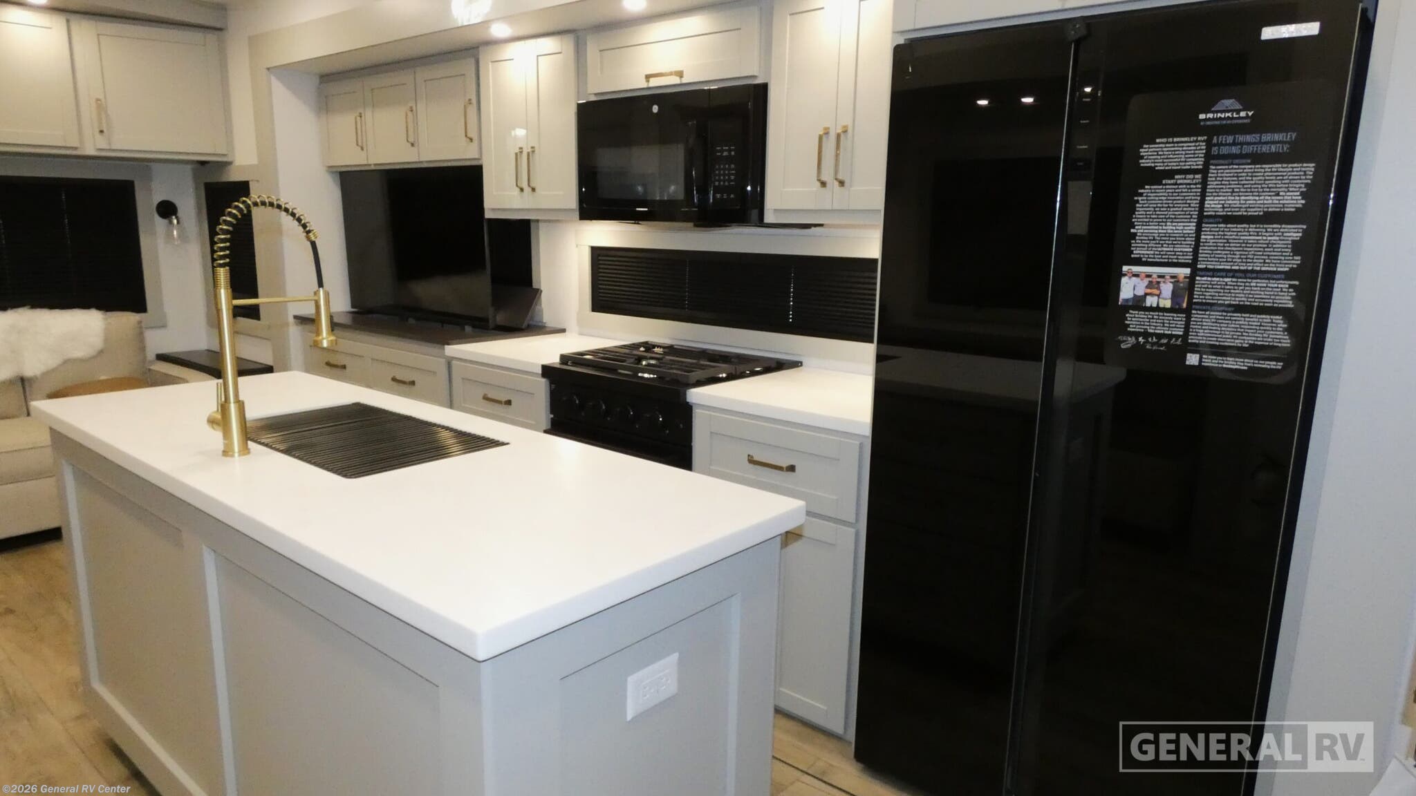 Brinkley Model Z fifth wheel 3600 highlights: Theater Seating Televator and Fireplace Integrated Pet Bowls Double Pull Out Trash Bins 16 Cu. Ft. Refrigerator Dual Bath Sinks This unit is perfect for weekends at the campground or extended stays! There is ample seating with a sliding desk/dining table, 62" theater seating, and a 72" tri-fold sofa along the rear wall. You can easily relax and enjoy the telescoping TV with a cozy fireplace below. The kitchen offers all that you need to prepare and cook meals just like home with a 16-cu. ft. refrigerator for your perishables, a 30" residential microwave oven, and three burner range top and oven. You will love the kitchen island all outfitted with pull-out pet bowls and double pull-out trash bins with an integrated Stow & Go paper towel holder. There is also an 84" pantry with adjustable shelves for all of your canned and dry goods. Head up the steps to a find a full bath and a private bedroom with a king bed slide all the way up front. A sliding dresser top features hidden storage which is perfect for jewelry and other personal belongings. The front wardrobe features mirrored doors, and the corner closet has been prepped for a stackable washer and dryer. The Brinkley mid-profile Model Z fifth wheels bring you clean lines and an upscale look with plenty of style and exciting new features like the industry first brass plumbing connections. These units also feature an automotive grade front cap, plenty of exterior storage, dual exterior hot and cold showers, and wide stance leveling jacks for easy set up. Residential frameless windows provide a clean look and beautiful views, and ample electrical outlets and 6 USB/USB-C outlets allow all of your electronics and appliances to easily be used and charged.