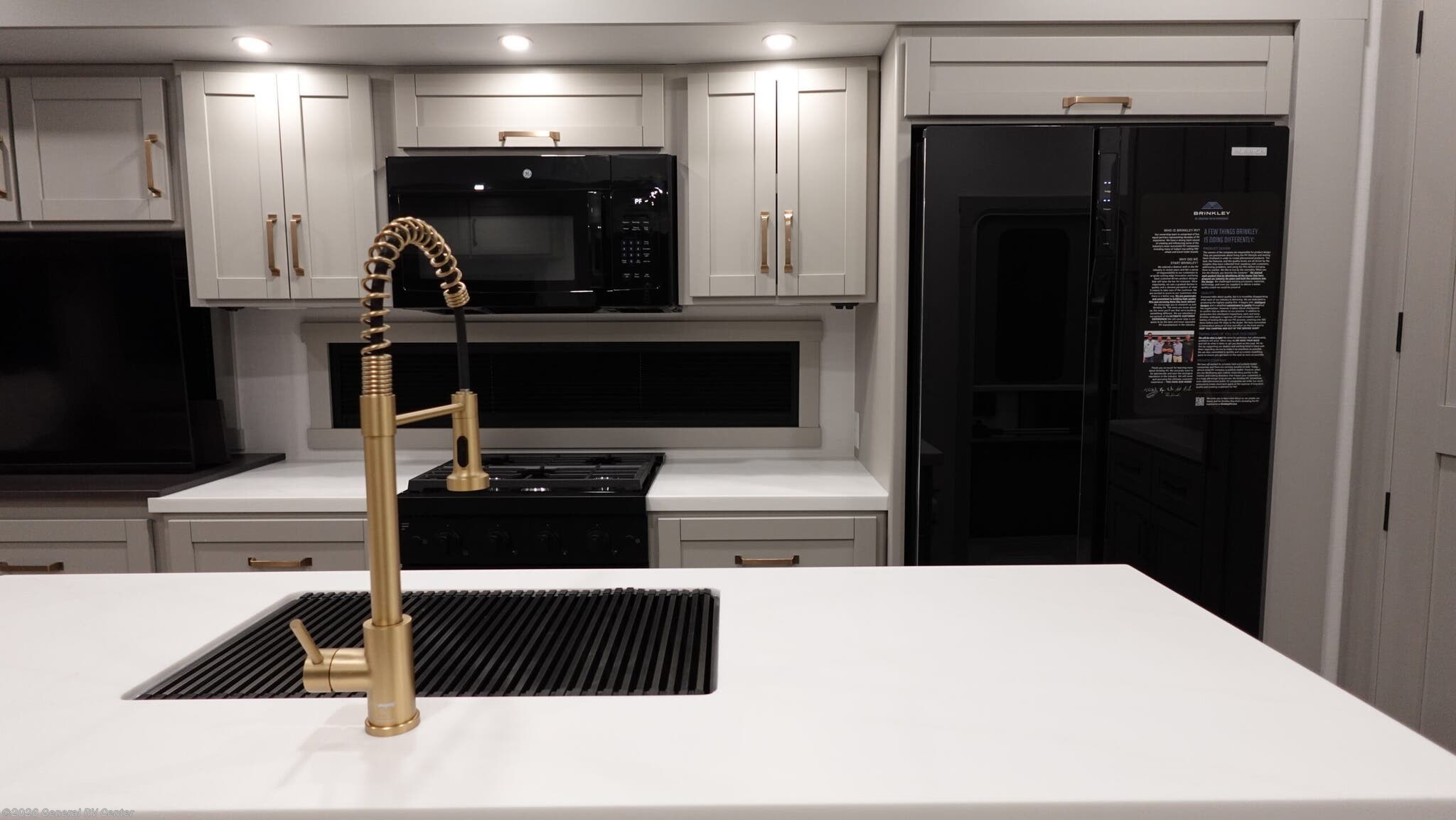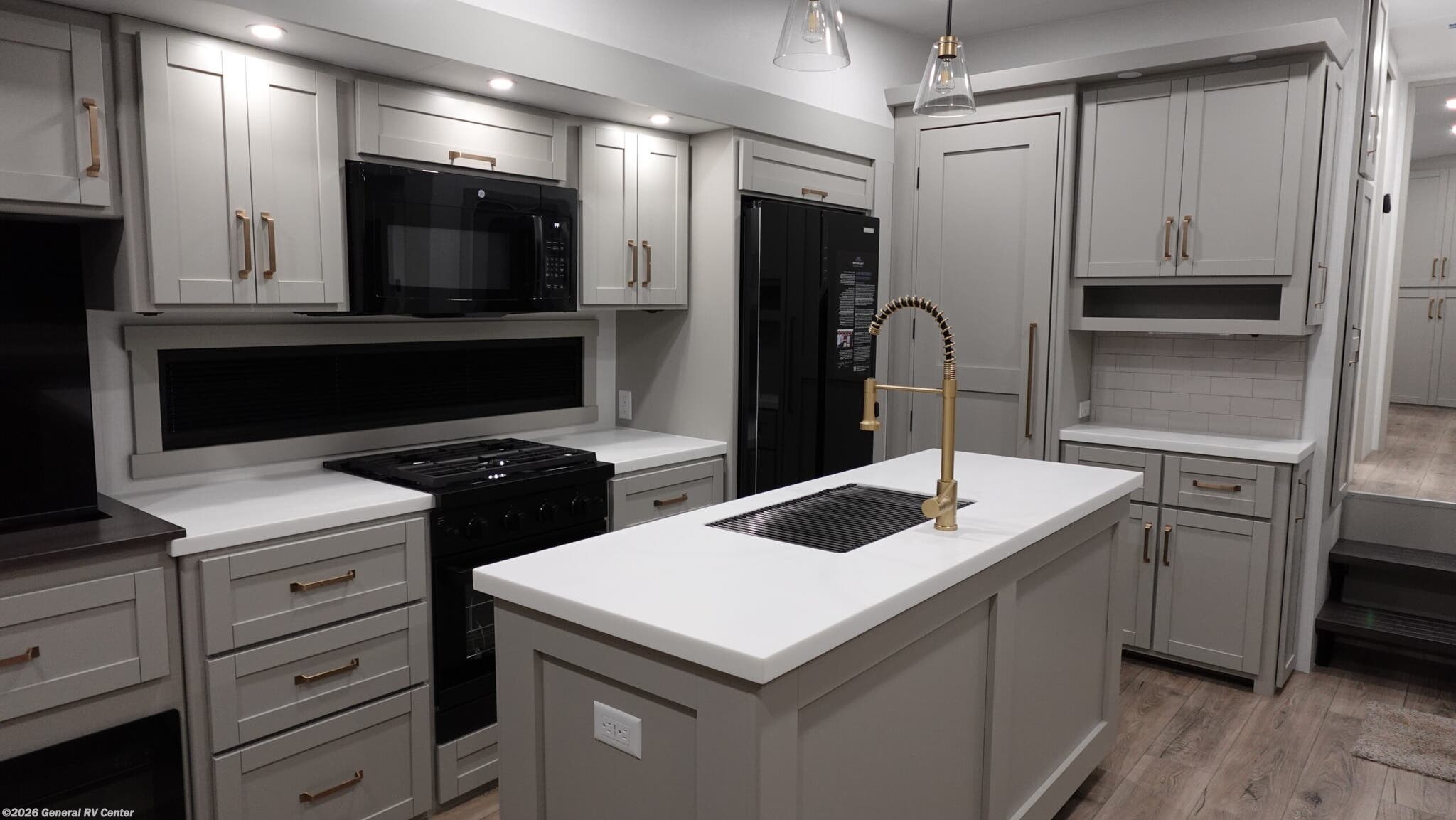Brinkley Model Z fifth wheel 3600 highlights: Theater Seating Televator and Fireplace Integrated Pet Bowls Double Pull Out Trash Bins 16 Cu. Ft. Refrigerator Dual Bath Sinks This unit is perfect for weekends at the campground or extended stays! There is ample seating with a sliding desk/dining table, 62" theater seating, and a 72" tri-fold sofa along the rear wall. You can easily relax and enjoy the telescoping TV with a cozy fireplace below. The kitchen offers all that you need to prepare and cook meals just like home with a 16-cu. ft. refrigerator for your perishables, a 30" residential microwave oven, and three burner range top and oven. You will love the kitchen island all outfitted with pull-out pet bowls and double pull-out trash bins with an integrated Stow & Go paper towel holder. There is also an 84" pantry with adjustable shelves for all of your canned and dry goods. Head up the steps to a find a full bath and a private bedroom with a king bed slide all the way up front. A sliding dresser top features hidden storage which is perfect for jewelry and other personal belongings. The front wardrobe features mirrored doors, and the corner closet has been prepped for a stackable washer and dryer. The Brinkley mid-profile Model Z fifth wheels bring you clean lines and an upscale look with plenty of style and exciting new features like the industry first brass plumbing connections. These units also feature an automotive grade front cap, plenty of exterior storage, dual exterior hot and cold showers, and wide stance leveling jacks for easy set up. Residential frameless windows provide a clean look and beautiful views, and ample electrical outlets and 6 USB/USB-C outlets allow all of your electronics and appliances to easily be used and charged.