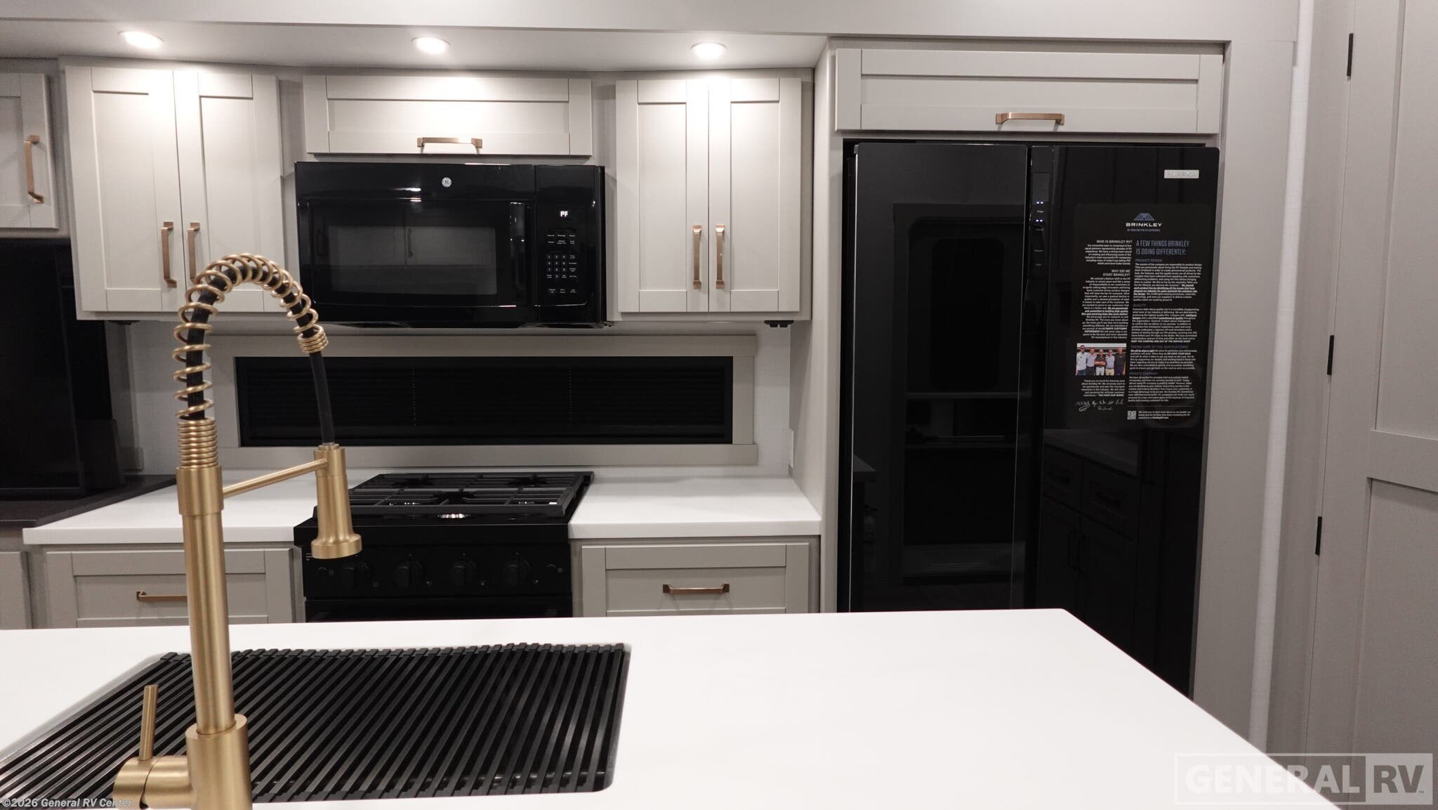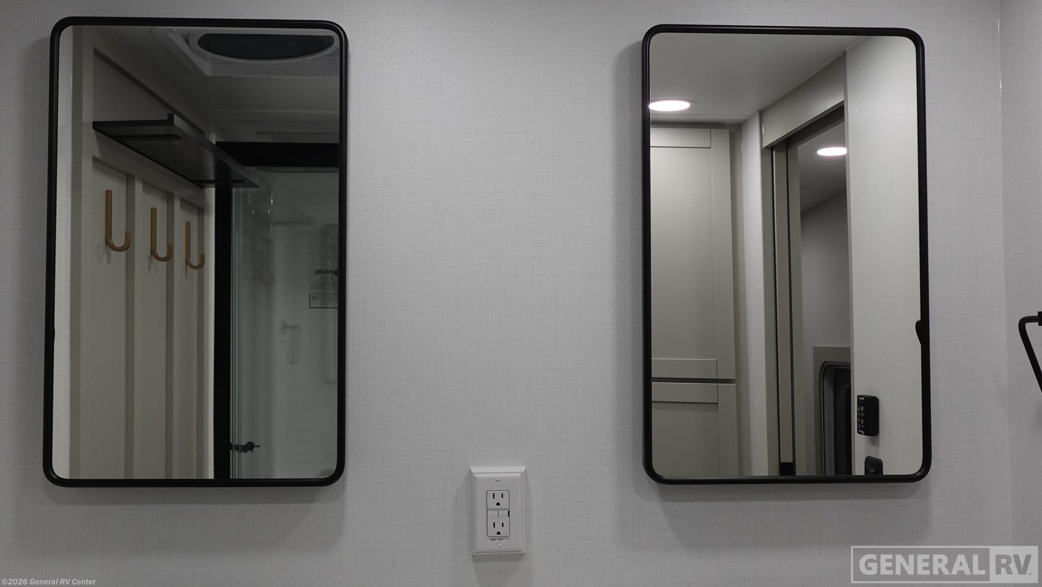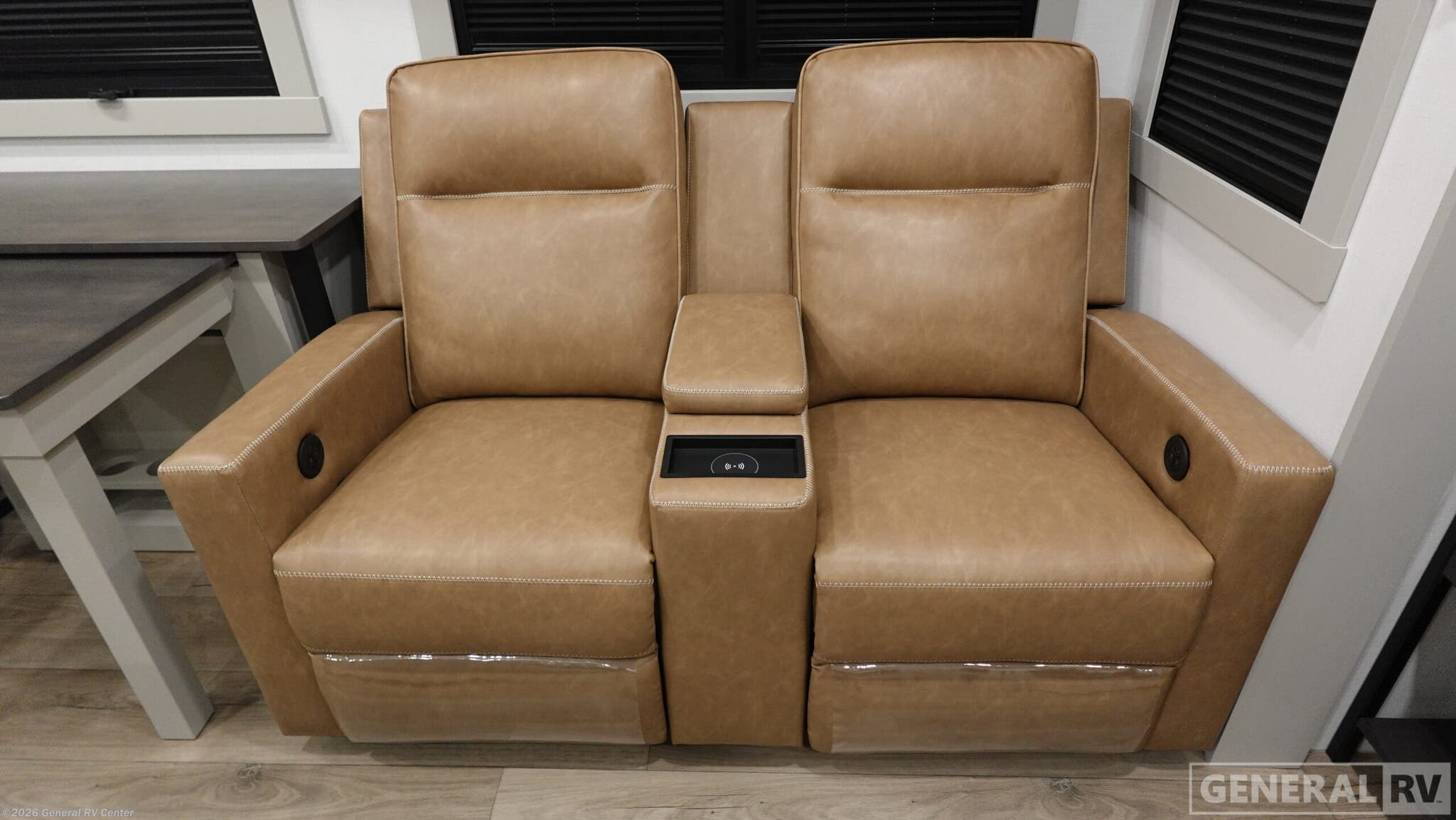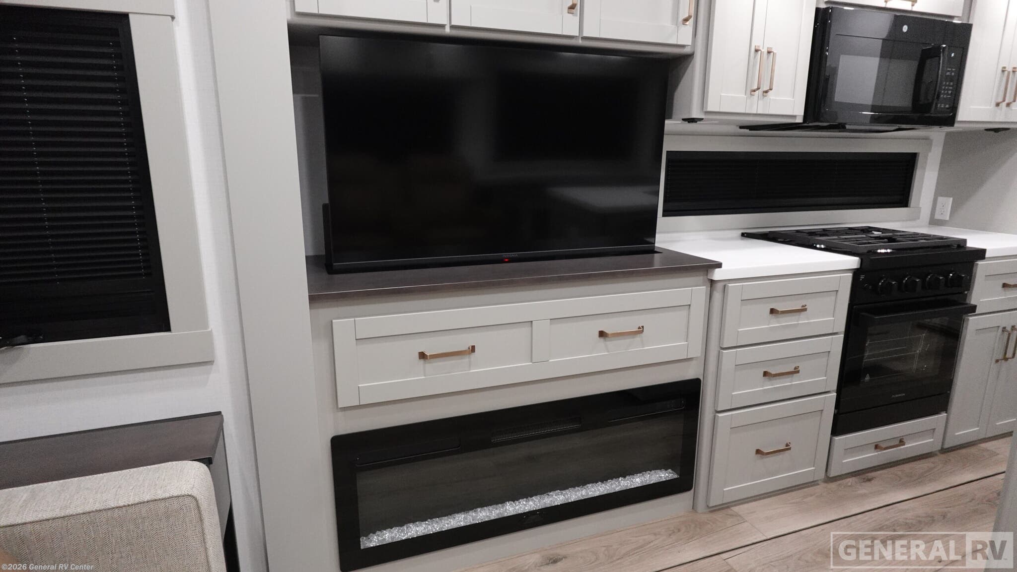 The Brinkley Model Z 3600 for 2026 is a masterpiece of modern engineering and design, crafted to elevate your travel experiences to new heights. At 38 feet in length, this RV offers a spacious and luxurious environment, perfect for families or groups, comfortably sleeping up to seven. The interior layout is thoughtfully designed, featuring three slides that expand the living space, making it ideal for both relaxation and entertaining. As you explore the floorplan, you'll notice the inviting 72" tri-fold sofa and 62" theater seating, perfect for cozy movie nights by the elegant fireplace. The kitchen is a culinary dream with a residential 16 cu. ft. refrigerator and a large island that provides ample prep space. The bedroom boasts a king bed, with an option for a queen, ensuring restful nights on the road. With a large shower and washer/dryer prep, the Model Z 3600 combines convenience with comfort, making it your ultimate home away from home. For more details and to see this stunning RV in person, visit your nearest General RV dealership.