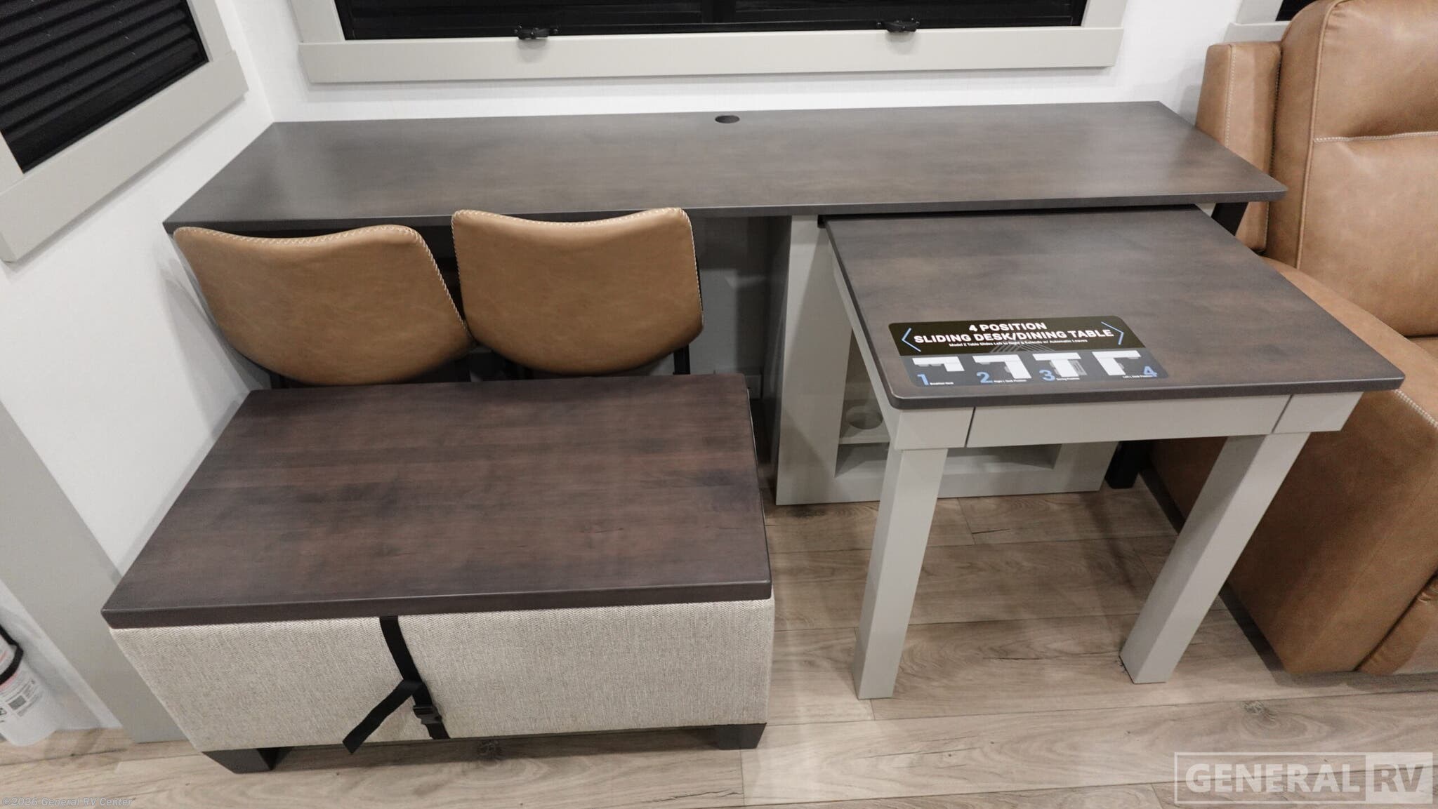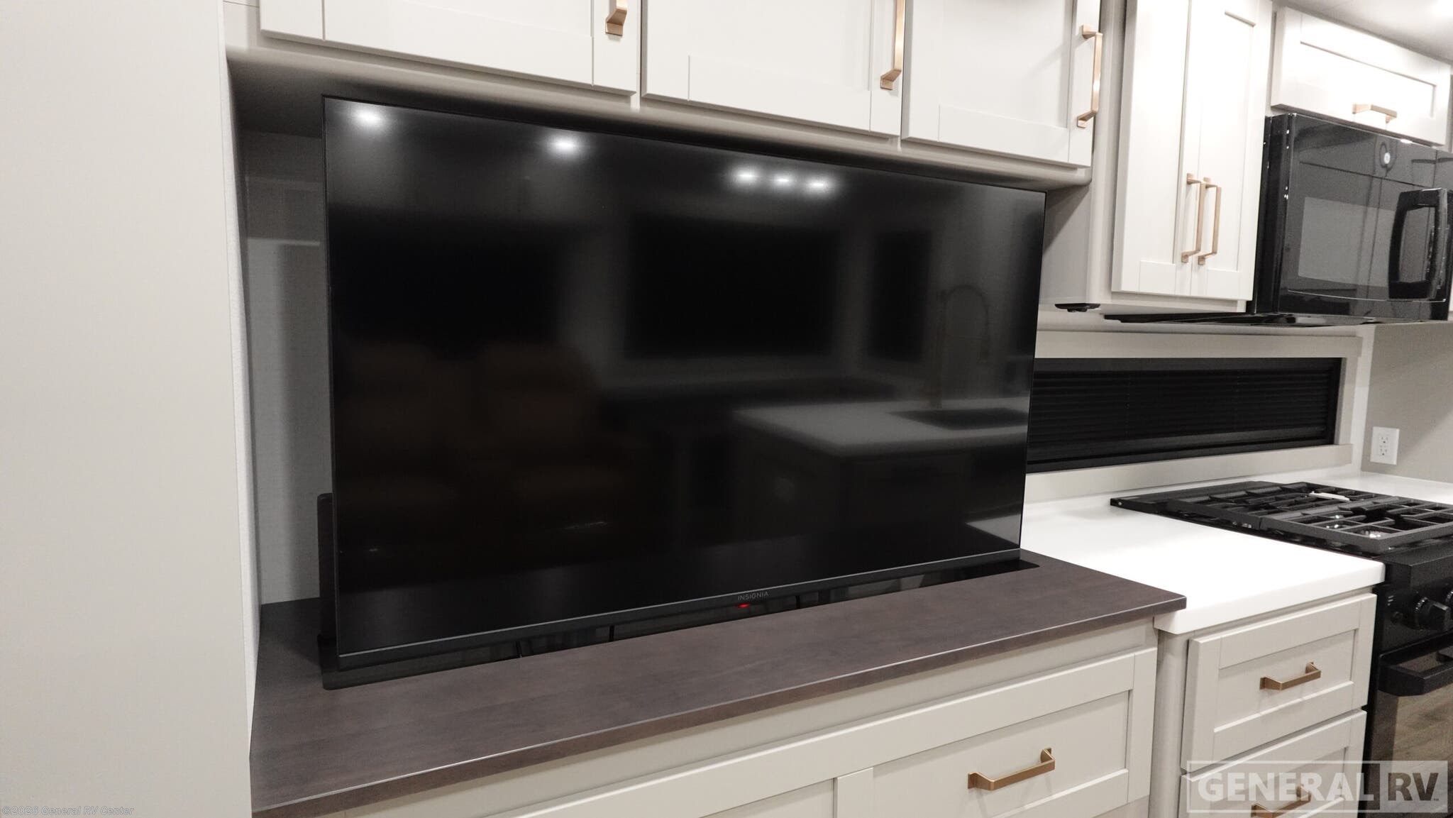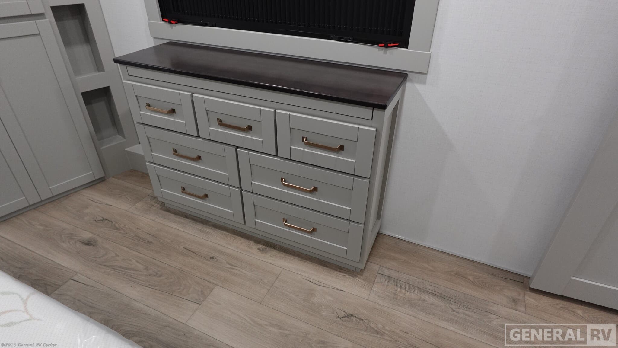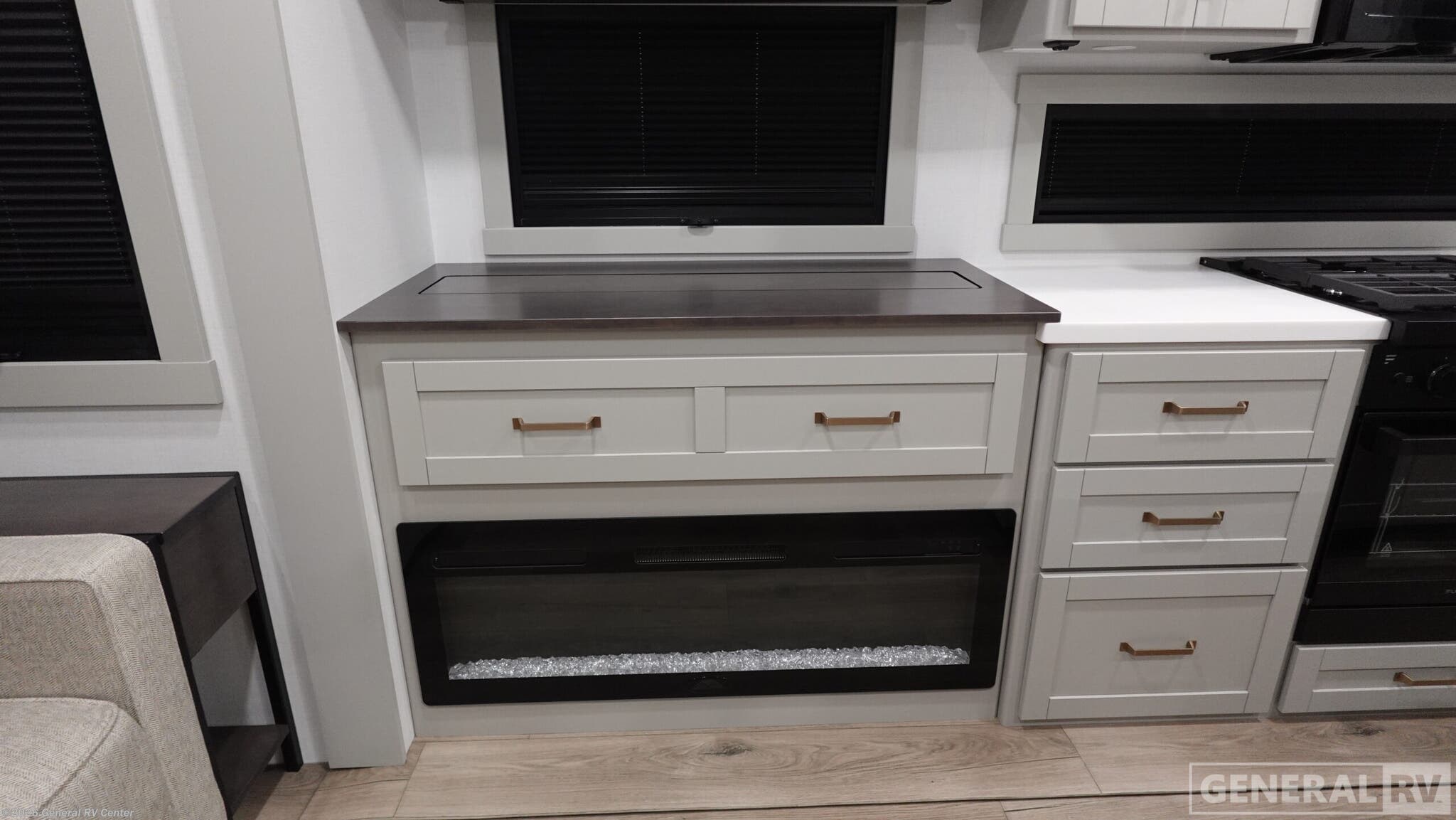 The Brinkley Model Z 3600 for 2026 is a masterpiece of modern engineering and design, crafted to elevate your travel experiences to new heights. At 38 feet in length, this RV offers a spacious and luxurious environment, perfect for families or groups, comfortably sleeping up to seven. The interior layout is thoughtfully designed, featuring three slides that expand the living space, making it ideal for both relaxation and entertaining. As you explore the floorplan, you'll notice the inviting 72" tri-fold sofa and 62" theater seating, perfect for cozy movie nights by the elegant fireplace. The kitchen is a culinary dream with a residential 16 cu. ft. refrigerator and a large island that provides ample prep space. The bedroom boasts a king bed, with an option for a queen, ensuring restful nights on the road. With a large shower and washer/dryer prep, the Model Z 3600 combines convenience with comfort, making it your ultimate home away from home. For more details and to see this stunning RV in person, visit your nearest General RV dealership.
