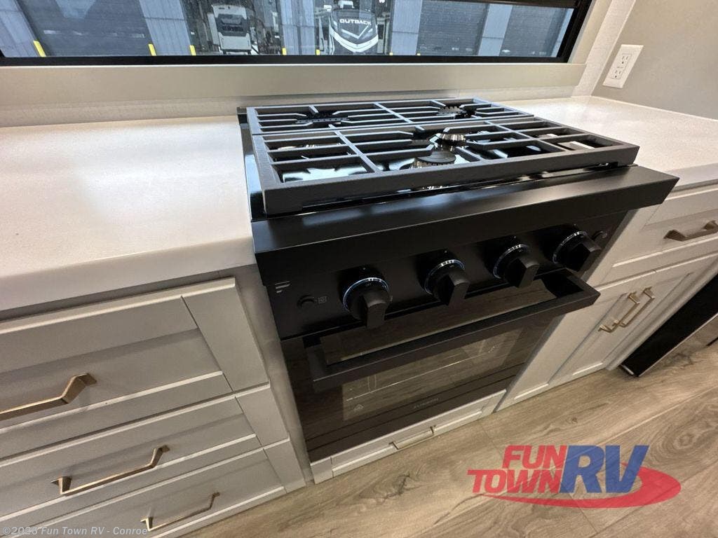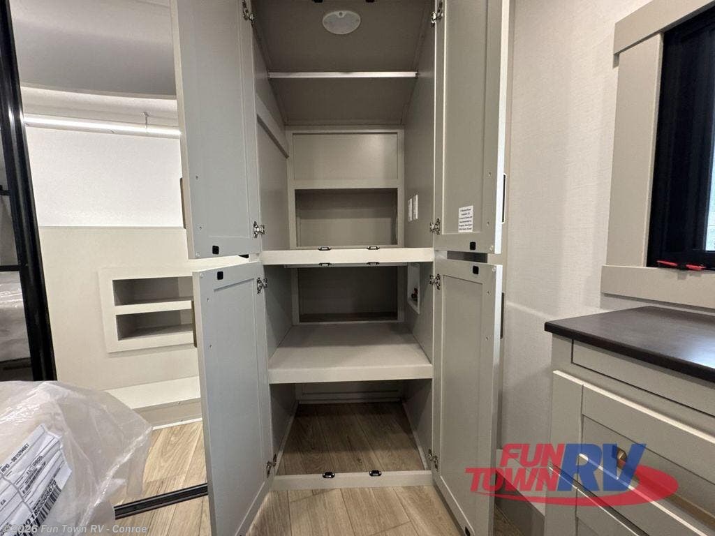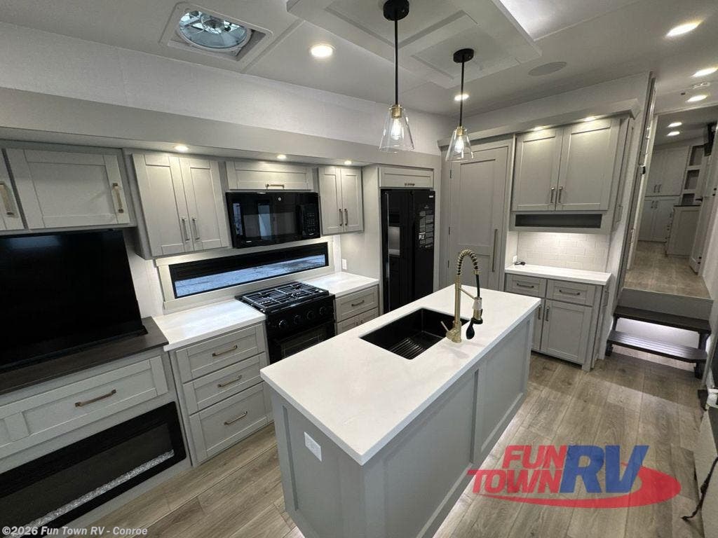 This unit is perfect for weekends at the campground or extended stays! There is ample seating with a sliding desk/dining table, 62" theater seating, and a 72" tri-fold sofa along the rear wall. You can easily relax and enjoy the telescoping TV with a cozy fireplace below. The kitchen offers all that you need to prepare and cook meals just like home with a 16-cu. ft. refrigerator for your perishables, a 30" residential microwave oven, and three burner range top and oven. You will love the kitchen island all outfitted with pull-out pet bowls and double pull-out trash bins with an integrated Stow & Go paper towel holder. There is also an 84" pantry with adjustable shelves for all of your canned and dry goods. Head up the steps to a find a full bath and a private bedroom with a king bed slide all the way up front. A sliding dresser top features hidden storage which is perfect for jewelry and other personal belongings. The front wardrobe features mirrored doors, and the corner closet has been prepped for a stackable washer and dryer if you choose to add that option.