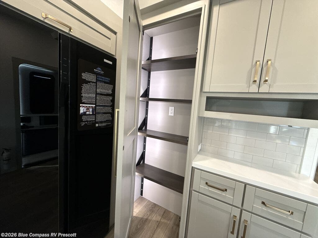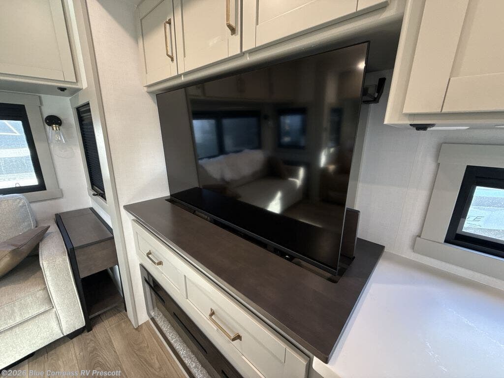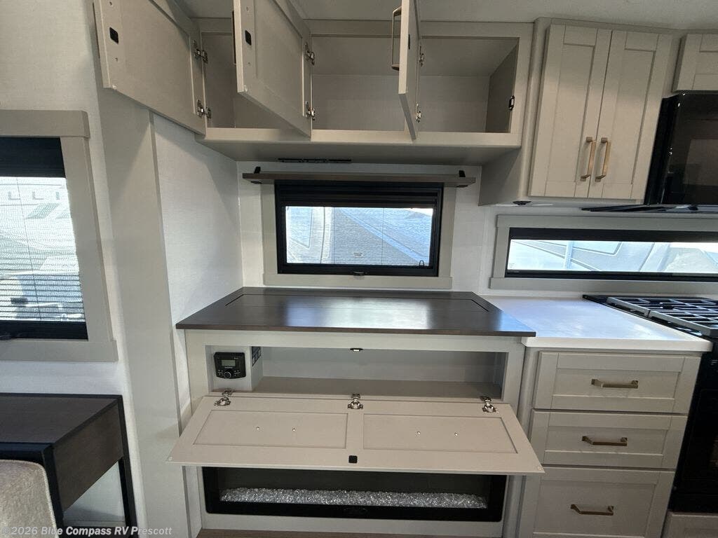 This unit is perfect for weekends at the campground or extended stays! There is ample seating with a sliding desk/dining table, 62" theater seating, and a 72" tri-fold sofa along the rear wall. You can easily relax and enjoy the telescoping TV with a cozy fireplace below. The kitchen offers all that you need to prepare and cook meals just like home with a 16-cu. ft. refrigerator for your perishables, a 30" residential microwave oven, and three burner range top and oven. You will love the kitchen island all outfitted with pull-out pet bowls and double pull-out trash bins with an integrated Stow & Go paper towel holder. There is also an 84" pantry with adjustable shelves for all of your canned and dry goods. Head up the steps to a find a full bath and a private bedroom with a king bed slide all the way up front. A sliding dresser top features hidden storage which is perfect for jewelry and other personal belongings. The front wardrobe features mirrored doors, and the corner closet has been prepped for a stackable washer and dryer if you choose to add that option.