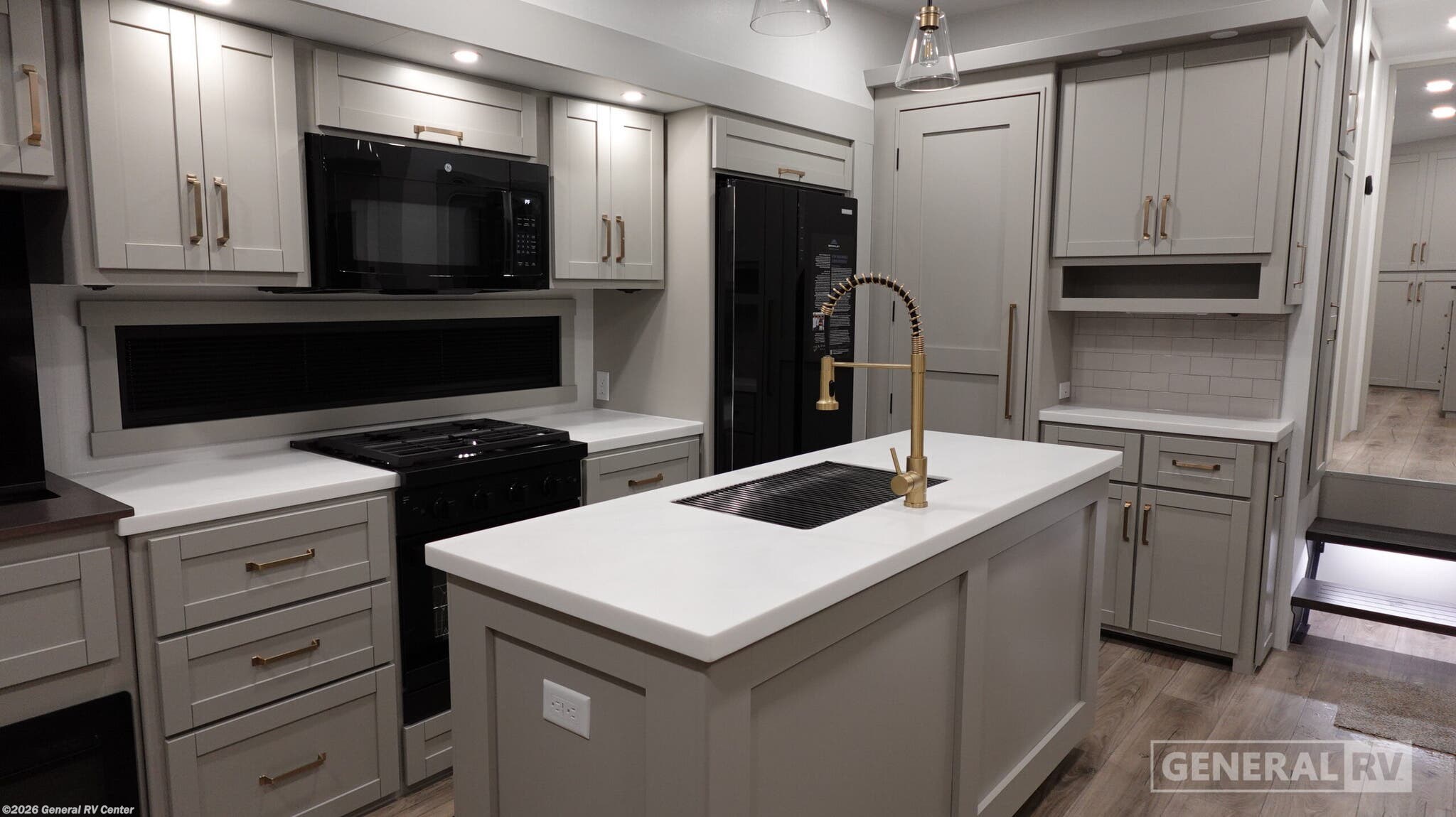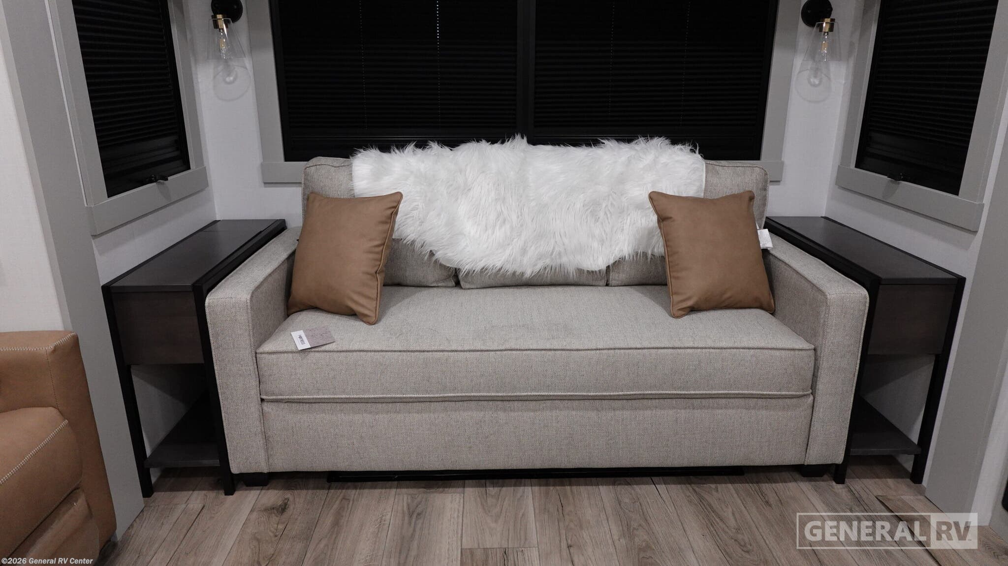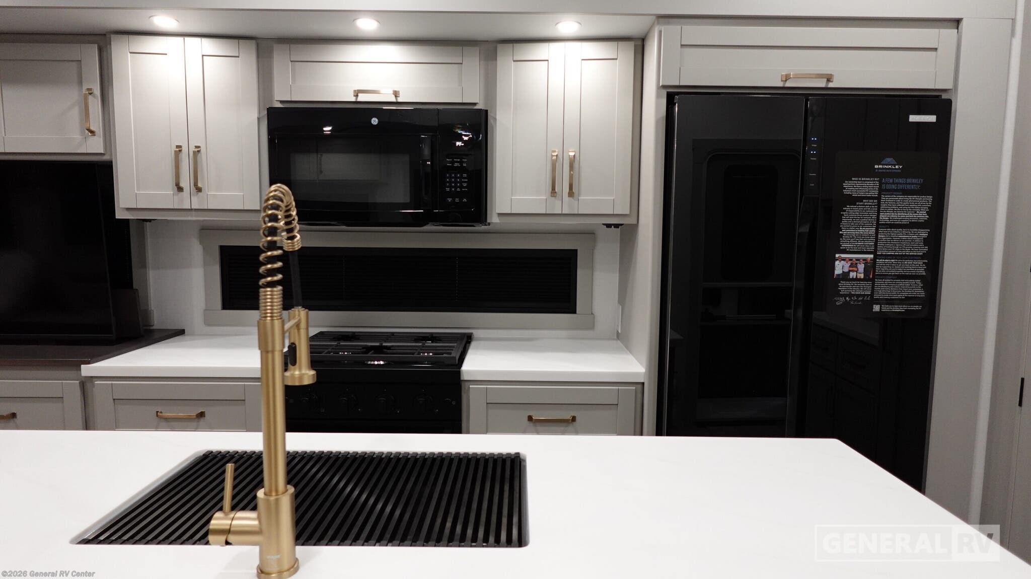 Brinkley Model Z fifth wheel 3600 highlights: Theater Seating Televator and Fireplace Integrated Pet Bowls Double Pull Out Trash Bins 16 Cu. Ft. Refrigerator Dual Bath Sinks This unit is perfect for weekends at the campground or extended stays! There is ample seating with a sliding desk/dining table, 62" theater seating, and a 72" tri-fold sofa along the rear wall. You can easily relax and enjoy the telescoping TV with a cozy fireplace below. The kitchen offers all that you need to prepare and cook meals just like home with a 16-cu. ft. refrigerator for your perishables, a 30" residential microwave oven, and three burner range top and oven. You will love the kitchen island all outfitted with pull-out pet bowls and double pull-out trash bins with an integrated Stow & Go paper towel holder. There is also an 84" pantry with adjustable shelves for all of your canned and dry goods. Head up the steps to a find a full bath and a private bedroom with a king bed slide all the way up front. A sliding dresser top features hidden storage which is perfect for jewelry and other personal belongings. The front wardrobe features mirrored doors, and the corner closet has been prepped for a stackable washer and dryer. The Brinkley mid-profile Model Z fifth wheels bring you clean lines and an upscale look with plenty of style and exciting new features like the industry first brass plumbing connections. These units also feature an automotive grade front cap, plenty of exterior storage, dual exterior hot and cold showers, and wide stance leveling jacks for easy set up. Residential frameless windows provide a clean look and beautiful views, and ample electrical outlets and 6 USB/USB-C outlets allow all of your electronics and appliances to easily be used and charged.