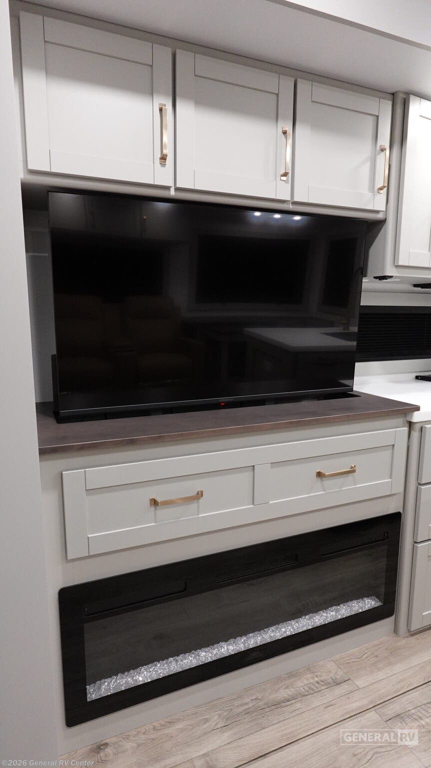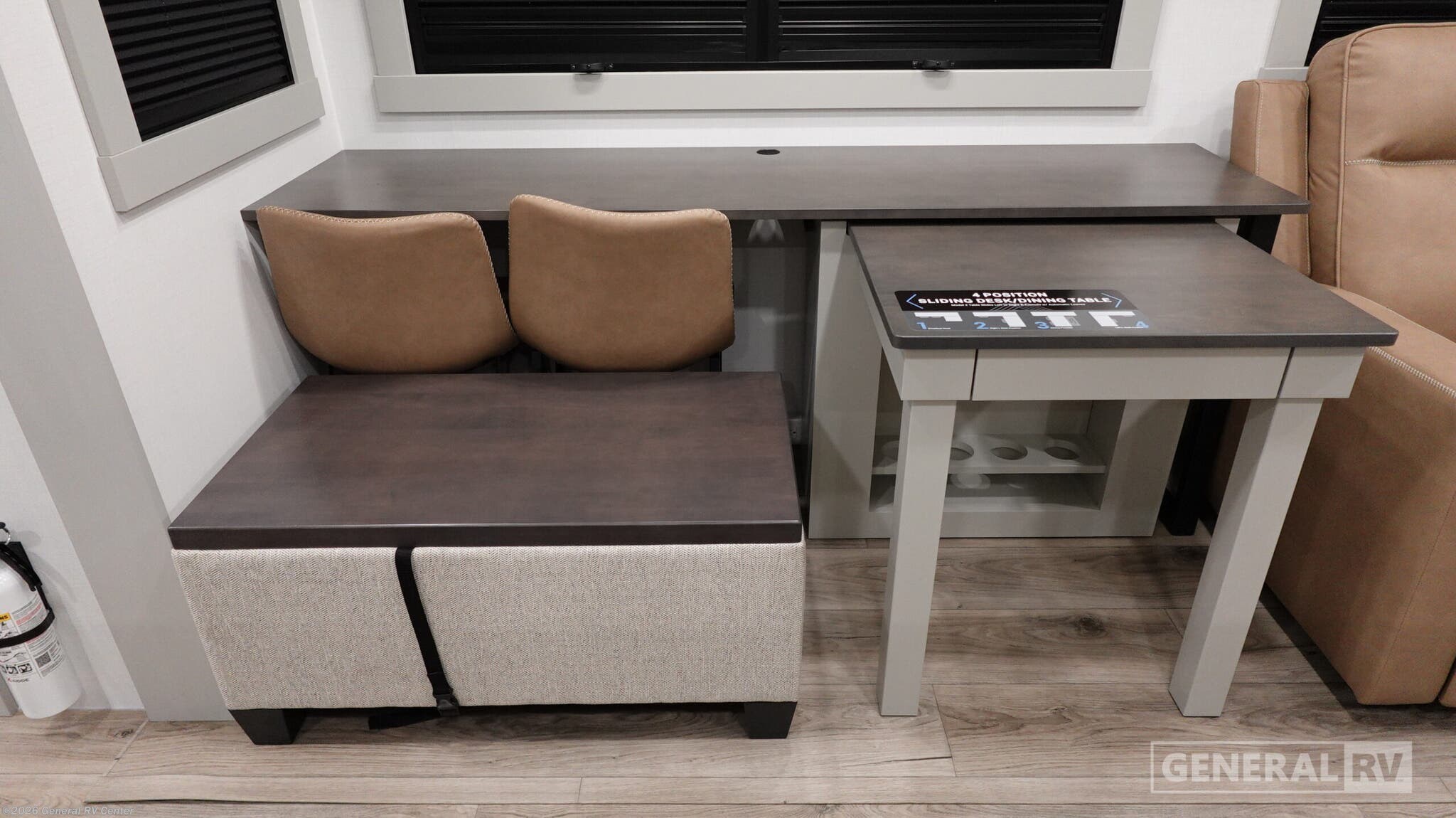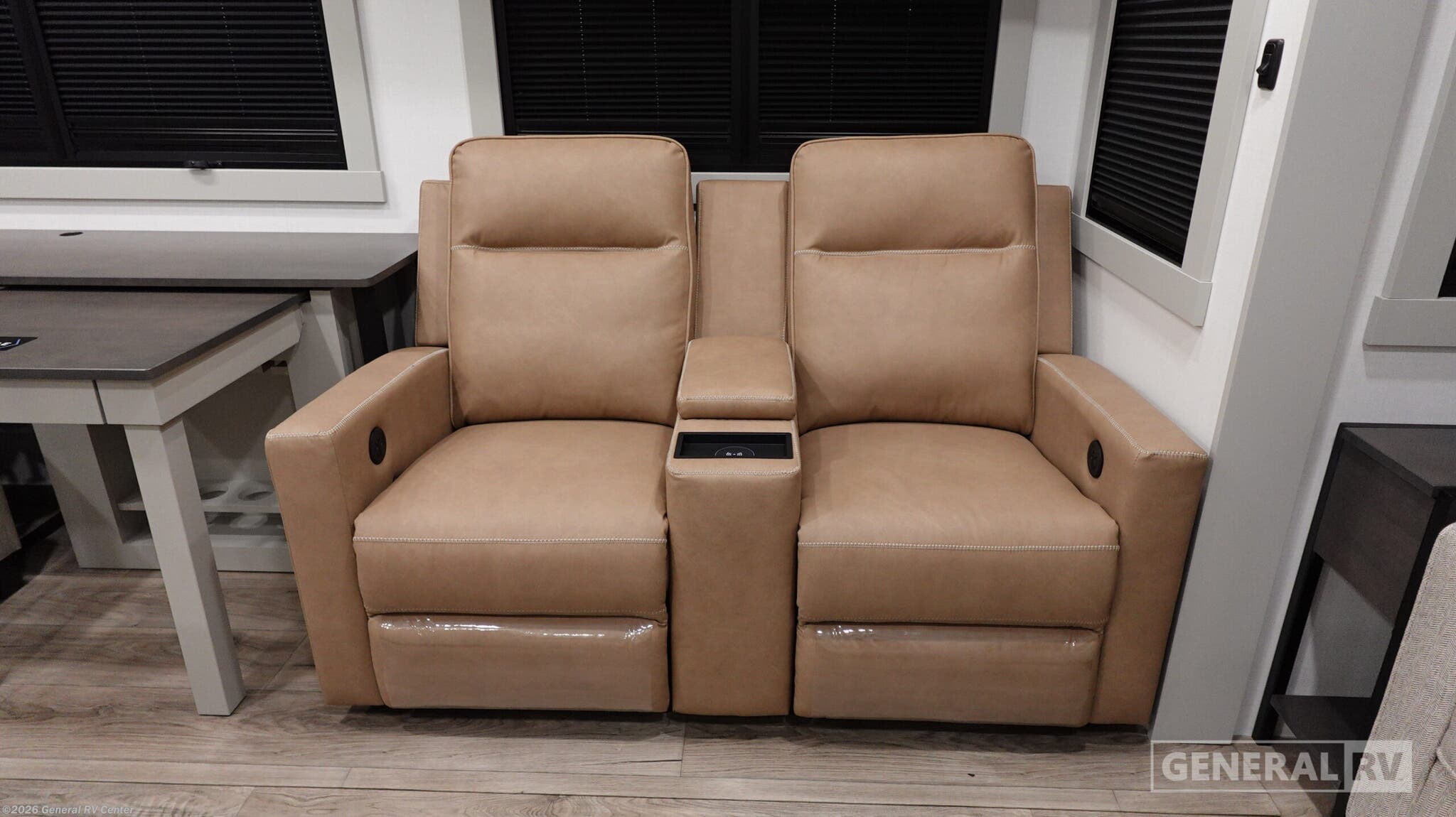 Brinkley Model Z fifth wheel 3600 highlights: Theater Seating Televator and Fireplace Integrated Pet Bowls Double Pull Out Trash Bins 16 Cu. Ft. Refrigerator Dual Bath Sinks This unit is perfect for weekends at the campground or extended stays! There is ample seating with a sliding desk/dining table, 62" theater seating, and a 72" tri-fold sofa along the rear wall. You can easily relax and enjoy the telescoping TV with a cozy fireplace below. The kitchen offers all that you need to prepare and cook meals just like home with a 16-cu. ft. refrigerator for your perishables, a 30" residential microwave oven, and three burner range top and oven. You will love the kitchen island all outfitted with pull-out pet bowls and double pull-out trash bins with an integrated Stow & Go paper towel holder. There is also an 84" pantry with adjustable shelves for all of your canned and dry goods. Head up the steps to a find a full bath and a private bedroom with a king bed slide all the way up front. A sliding dresser top features hidden storage which is perfect for jewelry and other personal belongings. The front wardrobe features mirrored doors, and the corner closet has been prepped for a stackable washer and dryer. The Brinkley mid-profile Model Z fifth wheels bring you clean lines and an upscale look with plenty of style and exciting new features like the industry first brass plumbing connections. These units also feature an automotive grade front cap, plenty of exterior storage, dual exterior hot and cold showers, and wide stance leveling jacks for easy set up. Residential frameless windows provide a clean look and beautiful views, and ample electrical outlets and 6 USB/USB-C outlets allow all of your electronics and appliances to easily be used and charged.