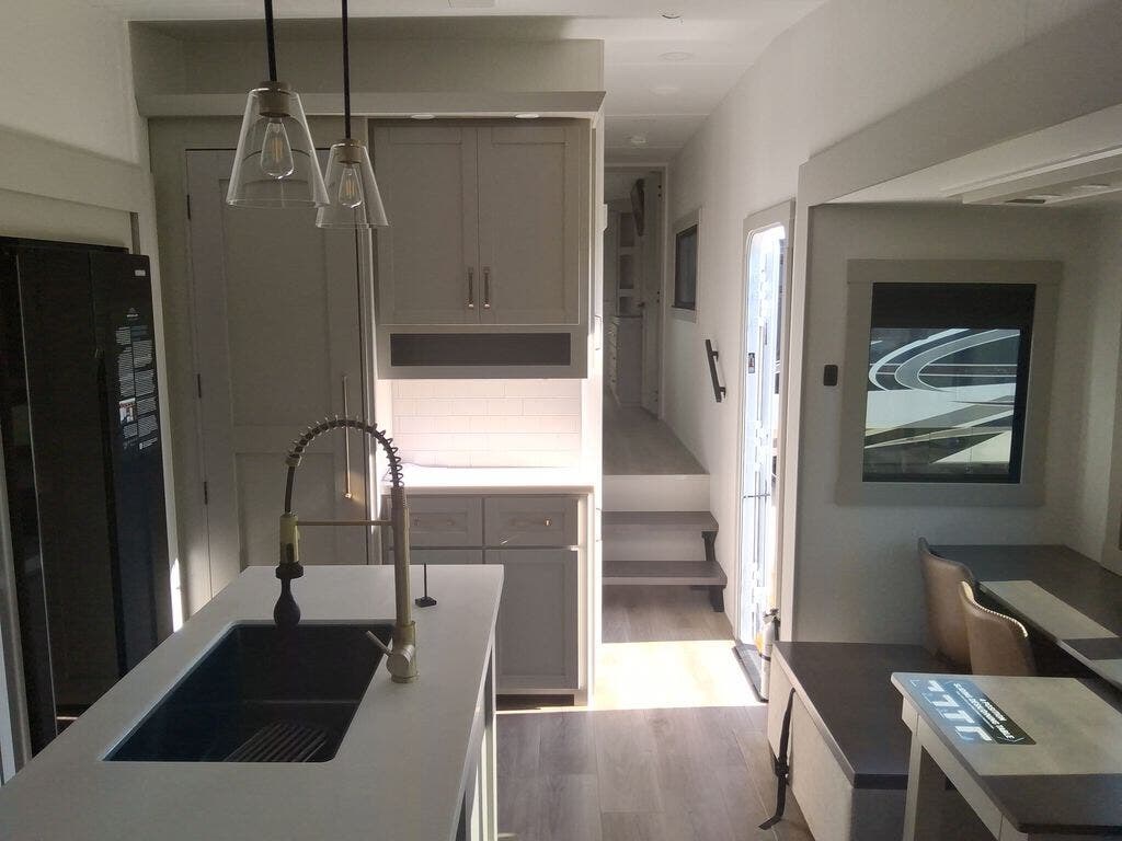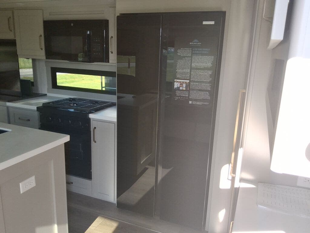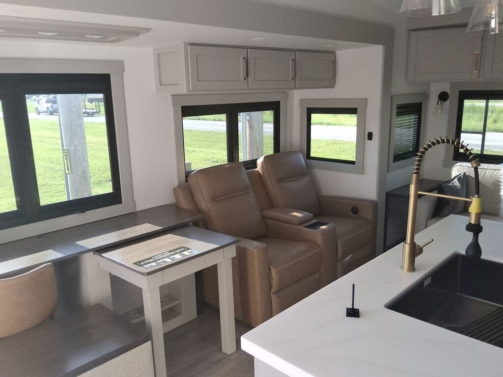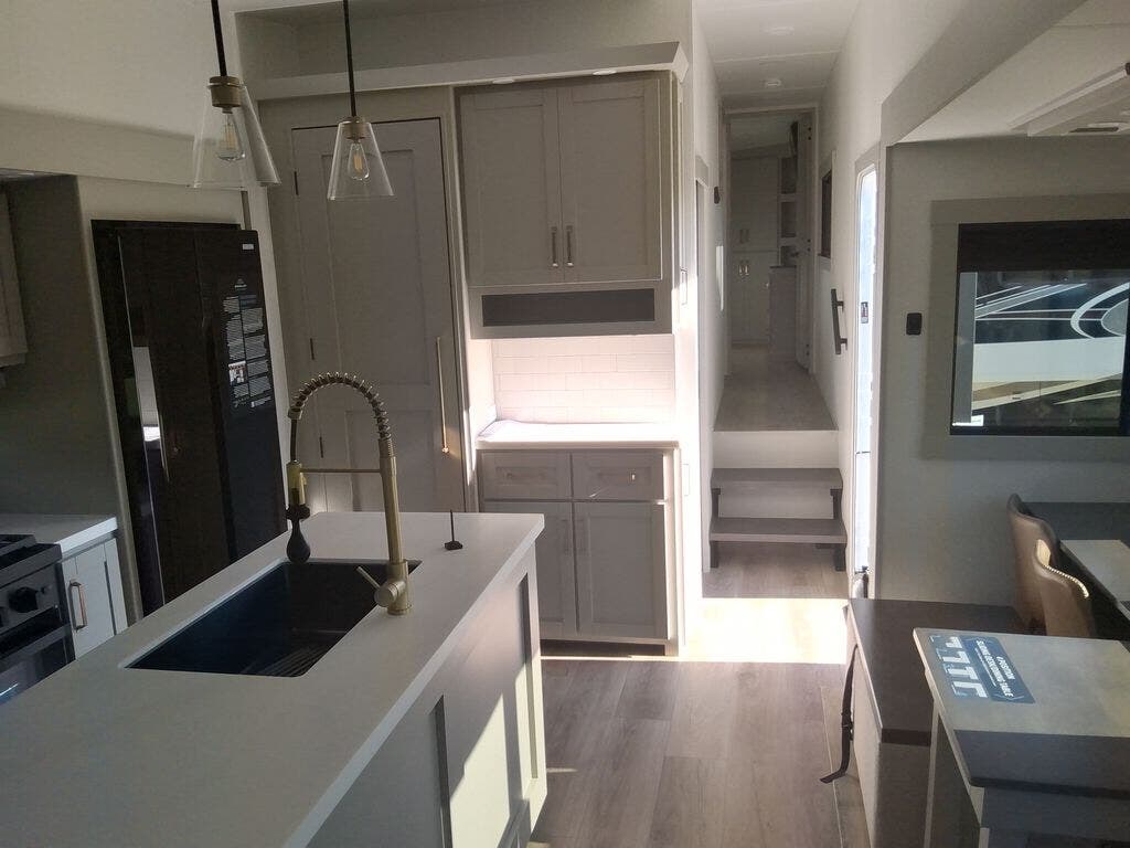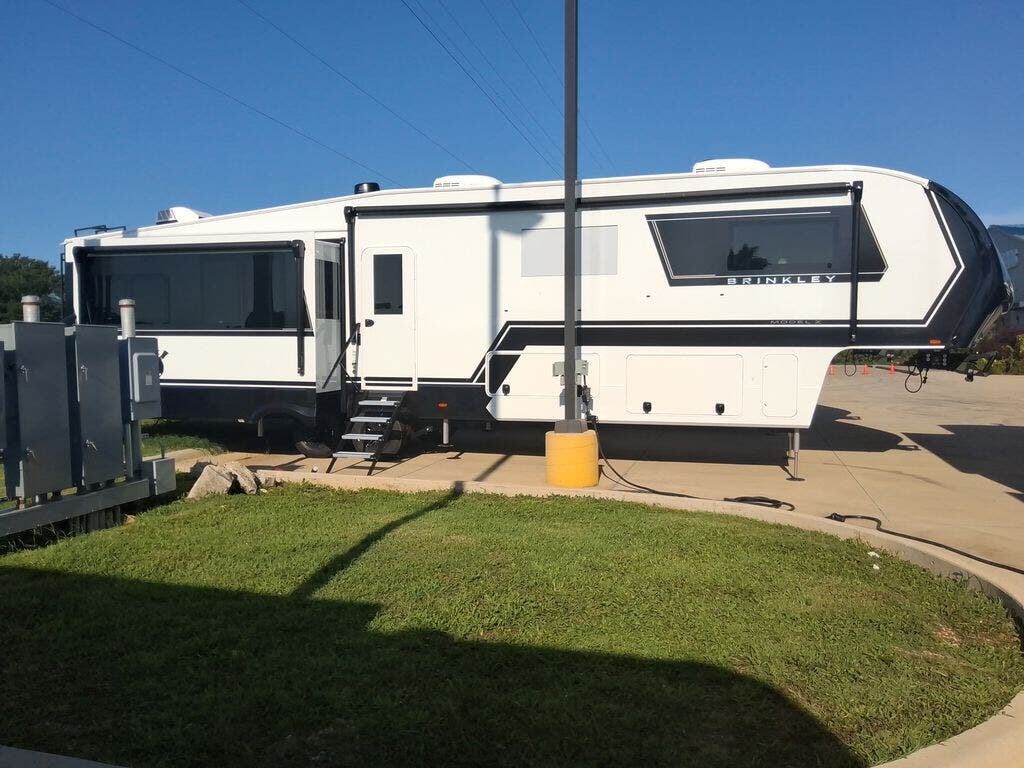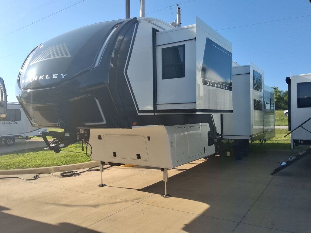 The Brinkley mid-profile Model Z fifth wheels bring you clean lines and an upscale look with plenty of style and exciting new features like the industry first brass plumbing connections. These units also feature an automotive grade front cap, plenty of exterior storage, dual exterior hot and cold showers, and wide stance leveling jacks for easy set up. Residential frameless windows provide a clean look and beautiful views, and ample electrical outlets and 6 USB/USB-C outlets allow all of your electronics and appliances to easily be used and charged.