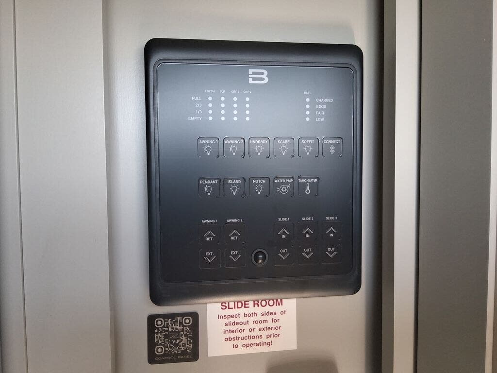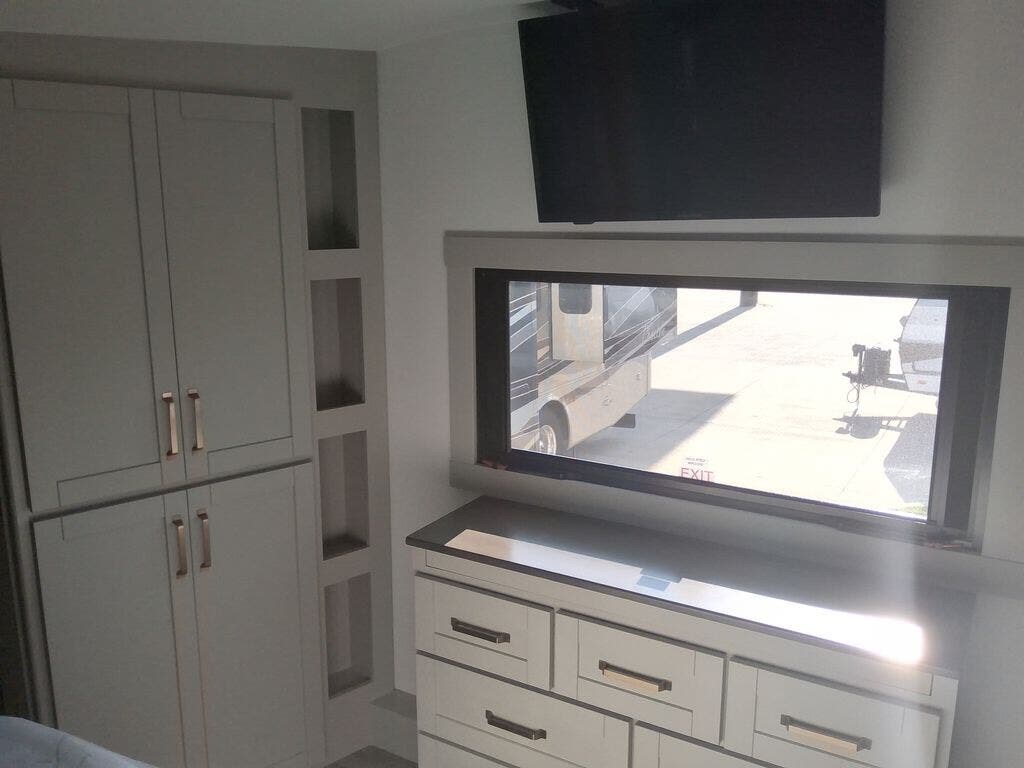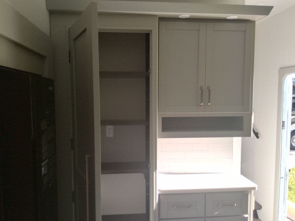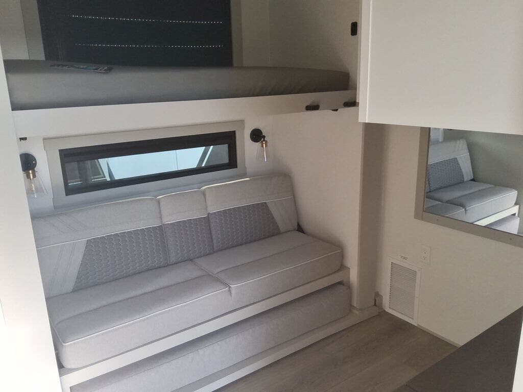 This unit is perfect for your family that needs sleeping space for eight! There is ample seating with a sliding desk/dining table, 62" theater seating, and a 72" tri-fold sofa along the rear wall. You can easily relax and enjoy the telescoping TV with a cozy fireplace below. The kitchen offers all that you need to prepare and cook meals just like home with a 16 cu. ft. refrigerator for your perishables, a 30" residential microwave oven, and three burner range top and oven. You will love the kitchen island all outfitted with pull-out pet bowls and double pull out trash bins with an integrated Stow & Go paper towel holder. There is also an 84" pantry with adjustable shelves for all of your canned and dry goods. Mid-coach, just ahead through the main entry, is a bonus room that can be used as a bedroom featuring a sofa bed with flip-up overhead bunk and trundle below, or an office with pull-out desk so that you can work easily while you travel, or it could also be used as a gaming room since there is also a 50" Smart TV. Head up the steps to a bathroom on your left and a private master suite with king bed slide all the way up front. A sliding dresser top features hidden storage which is perfect for jewelry and other personal belongings. The front wardrobe features mirrored doors and the corner closet has been prepped for a stackable washer and dryer if you choose to add that option.