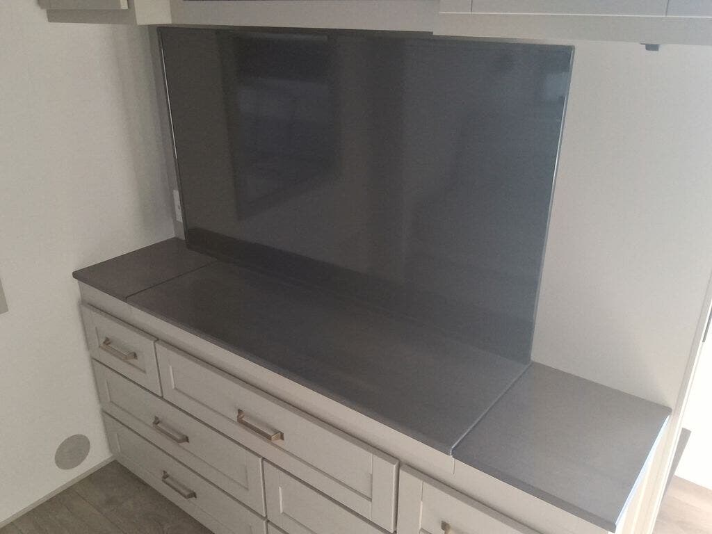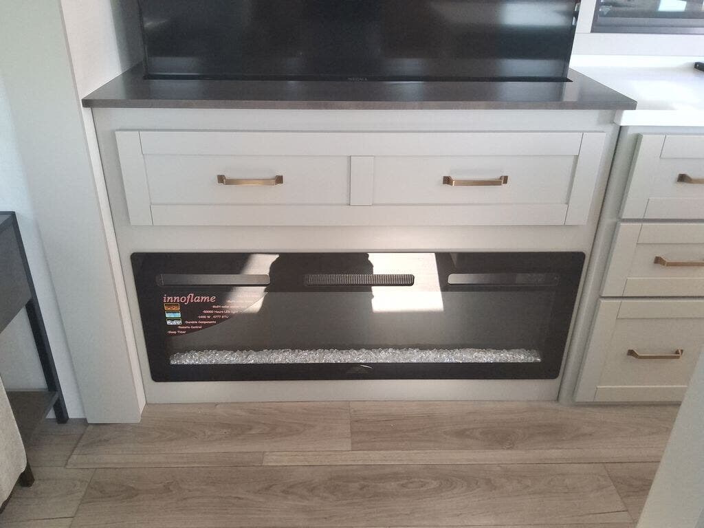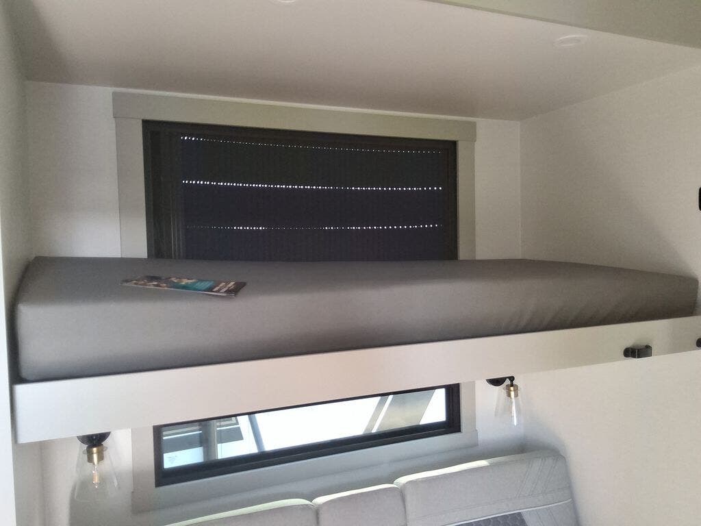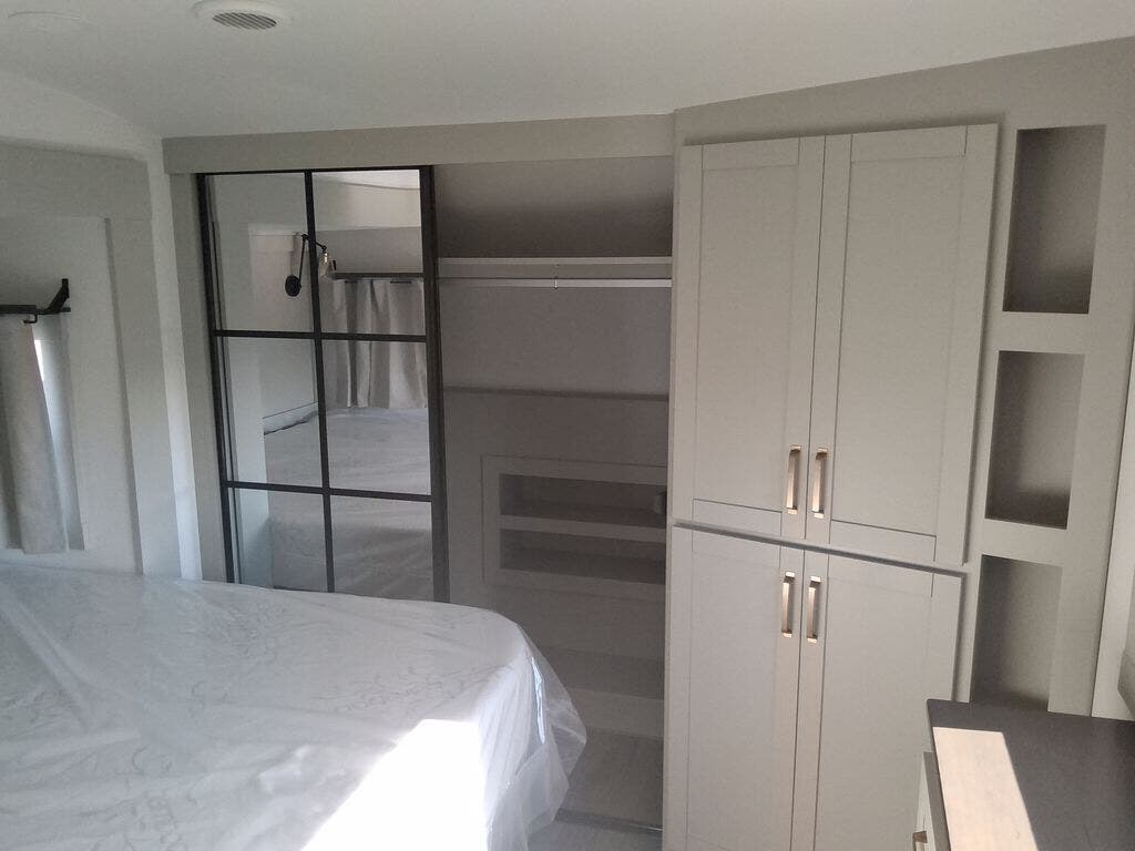 This unit is perfect for your family that needs sleeping space for eight! There is ample seating with a sliding desk/dining table, 62" theater seating, and a 72" tri-fold sofa along the rear wall. You can easily relax and enjoy the telescoping TV with a cozy fireplace below. The kitchen offers all that you need to prepare and cook meals just like home with a 16 cu. ft. refrigerator for your perishables, a 30" residential microwave oven, and three burner range top and oven. You will love the kitchen island all outfitted with pull-out pet bowls and double pull out trash bins with an integrated Stow & Go paper towel holder. There is also an 84" pantry with adjustable shelves for all of your canned and dry goods. Mid-coach, just ahead through the main entry, is a bonus room that can be used as a bedroom featuring a sofa bed with flip-up overhead bunk and trundle below, or an office with pull-out desk so that you can work easily while you travel, or it could also be used as a gaming room since there is also a 50" Smart TV. Head up the steps to a bathroom on your left and a private master suite with king bed slide all the way up front. A sliding dresser top features hidden storage which is perfect for jewelry and other personal belongings. The front wardrobe features mirrored doors and the corner closet has been prepped for a stackable washer and dryer if you choose to add that option.