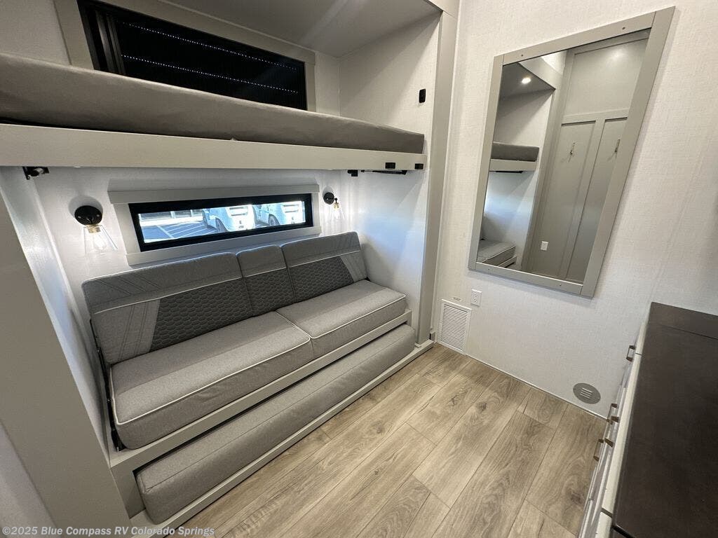 This unit is perfect for your family that needs sleeping space for eight! There is ample seating with a sliding desk/dining table, 62" theater seating, and a 72" tri-fold sofa along the rear wall. You can easily relax and enjoy the telescoping TV with a cozy fireplace below. The kitchen offers all that you need to prepare and cook meals just like home with a 16 cu. ft. refrigerator for your perishables, a 30" residential microwave oven, and three burner range top and oven. You will love the kitchen island all outfitted with pull-out pet bowls and double pull out trash bins with an integrated Stow & Go paper towel holder. There is also an 84" pantry with adjustable shelves for all of your canned and dry goods. Mid-coach, just ahead through the main entry, is a bonus room that can be used as a bedroom featuring a sofa bed with flip-up overhead bunk and trundle below, or an office with pull-out desk so that you can work easily while you travel, or it could also be used as a gaming room since there is also a 50" Smart TV. Head up the steps to a bathroom on your left and a private master suite with king bed slide all the way up front. A sliding dresser top features hidden storage which is perfect for jewelry and other personal belongings. The front wardrobe features mirrored doors and the corner closet has been prepped for a stackable washer and dryer if you choose to add that option.