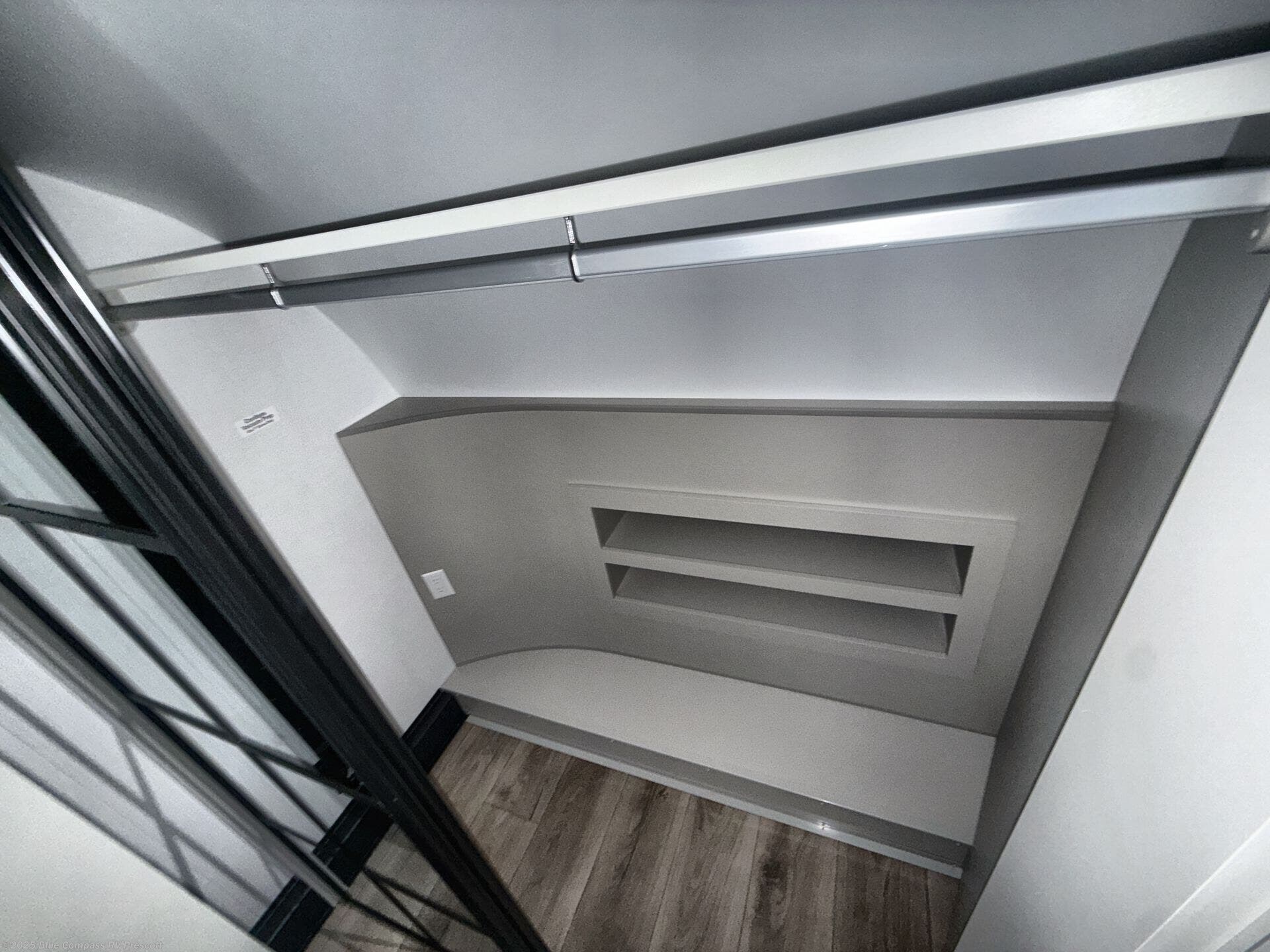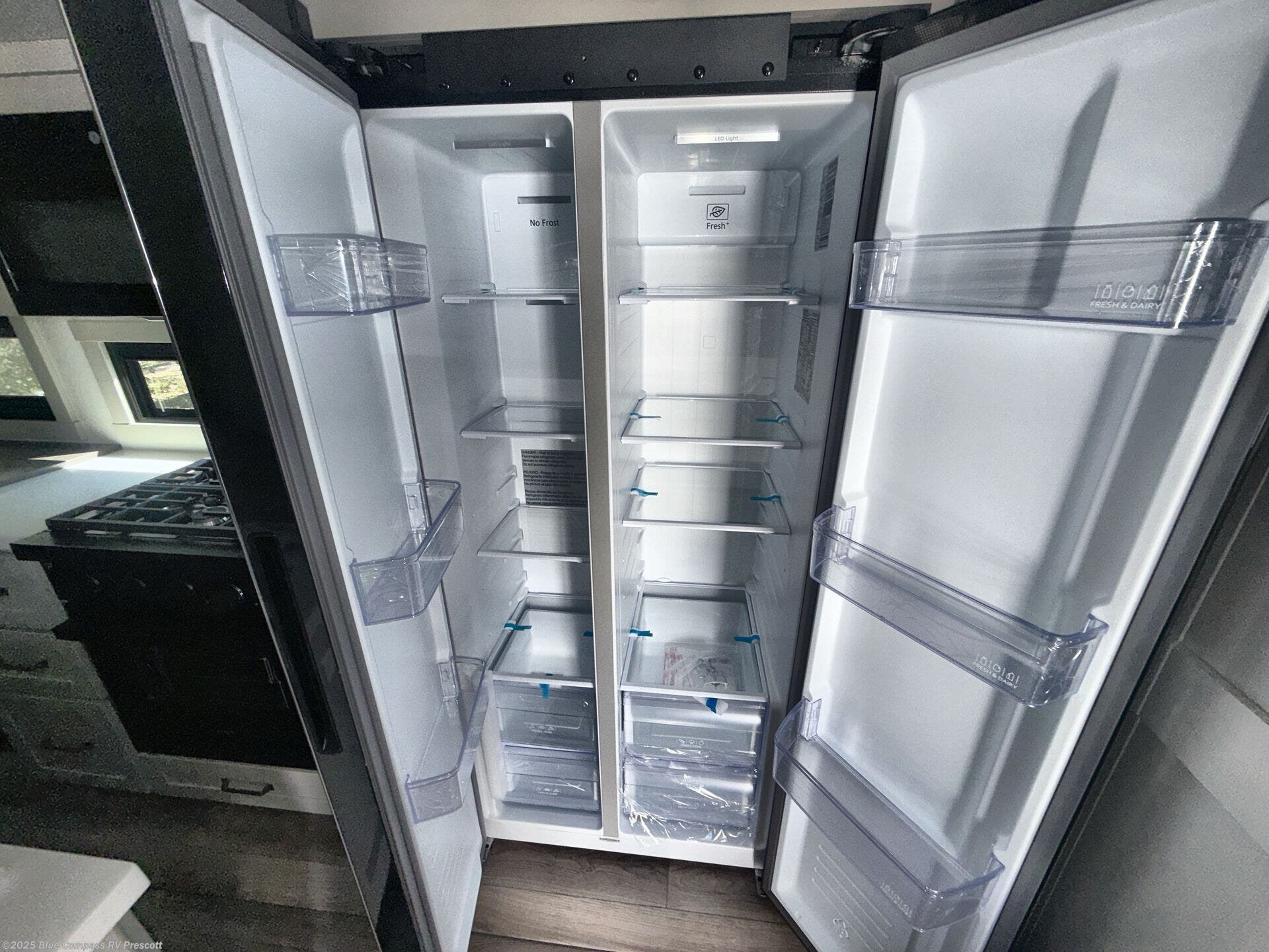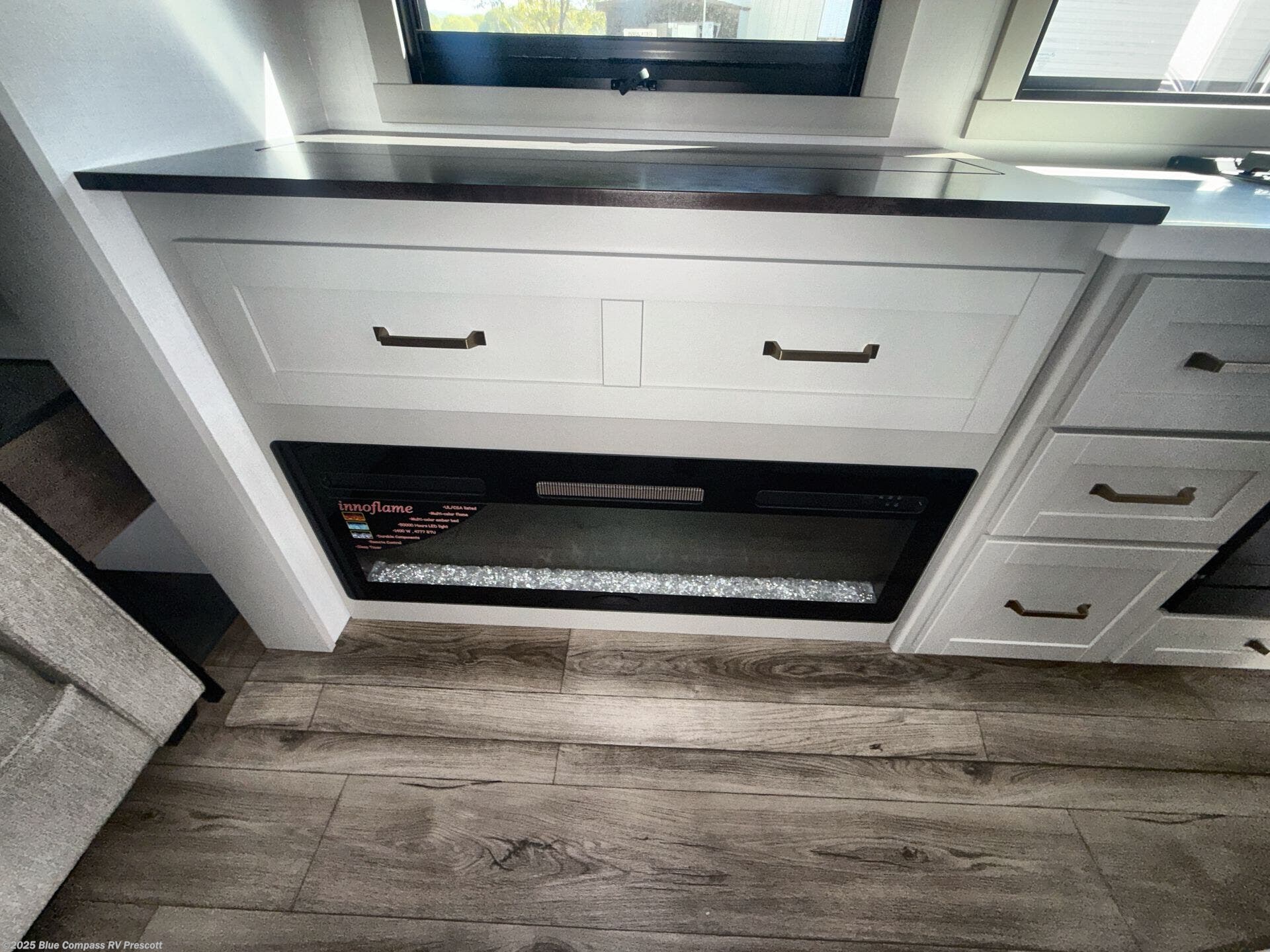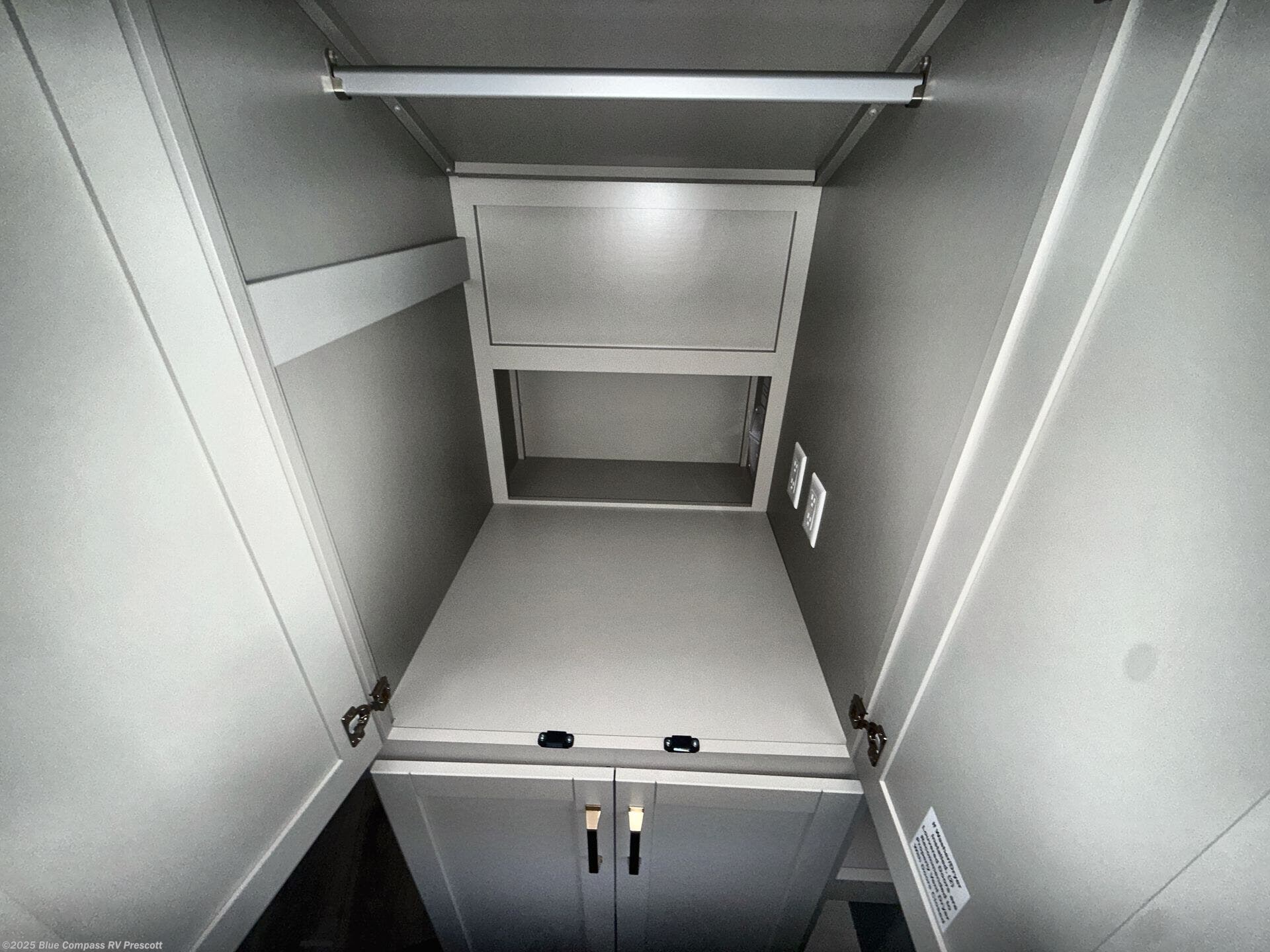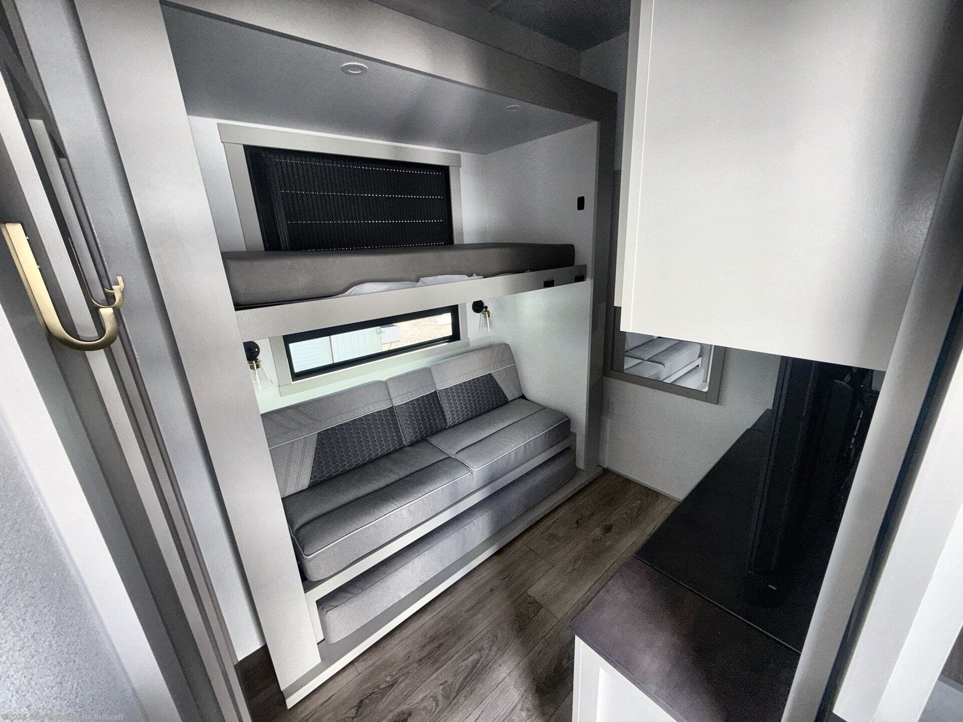 This unit is perfect for your family that needs sleeping space for eight! There is ample seating with a sliding desk/dining table, 62" theater seating, and a 72" tri-fold sofa along the rear wall. You can easily relax and enjoy the telescoping TV with a cozy fireplace below. The kitchen offers all that you need to prepare and cook meals just like home with a 16 cu. ft. refrigerator for your perishables, a 30" residential microwave oven, and three burner range top and oven. You will love the kitchen island all outfitted with pull-out pet bowls and double pull out trash bins with an integrated Stow & Go paper towel holder. There is also an 84" pantry with adjustable shelves for all of your canned and dry goods. Mid-coach, just ahead through the main entry, is a bonus room that can be used as a bedroom featuring a sofa bed with flip-up overhead bunk and trundle below, or an office with pull-out desk so that you can work easily while you travel, or it could also be used as a gaming room since there is also a 50" Smart TV. Head up the steps to a bathroom on your left and a private master suite with king bed slide all the way up front. A sliding dresser top features hidden storage which is perfect for jewelry and other personal belongings. The front wardrobe features mirrored doors and the corner closet has been prepped for a stackable washer and dryer if you choose to add that option.