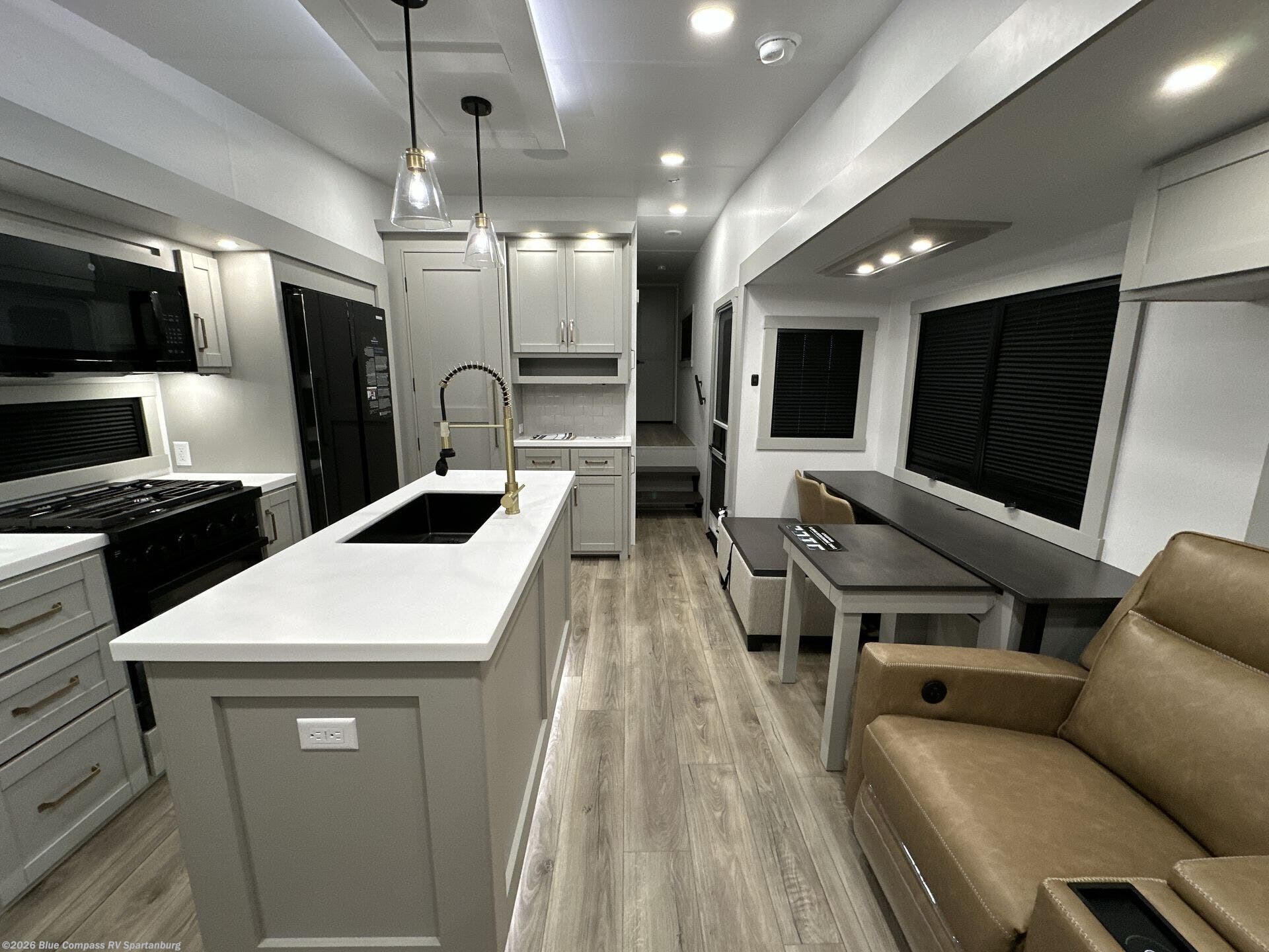 The Brinkley mid-profile Model Z fifth wheels bring you clean lines and an upscale look with plenty of style and exciting new features like the industry first brass plumbing connections. These units also feature an automotive grade front cap, plenty of exterior storage, dual exterior hot and cold showers, and wide stance leveling jacks for easy set up. Residential frameless windows provide a clean look and beautiful views, and ample electrical outlets and 6 USB/USB-C outlets allow all of your electronics and appliances to easily be used and charged.