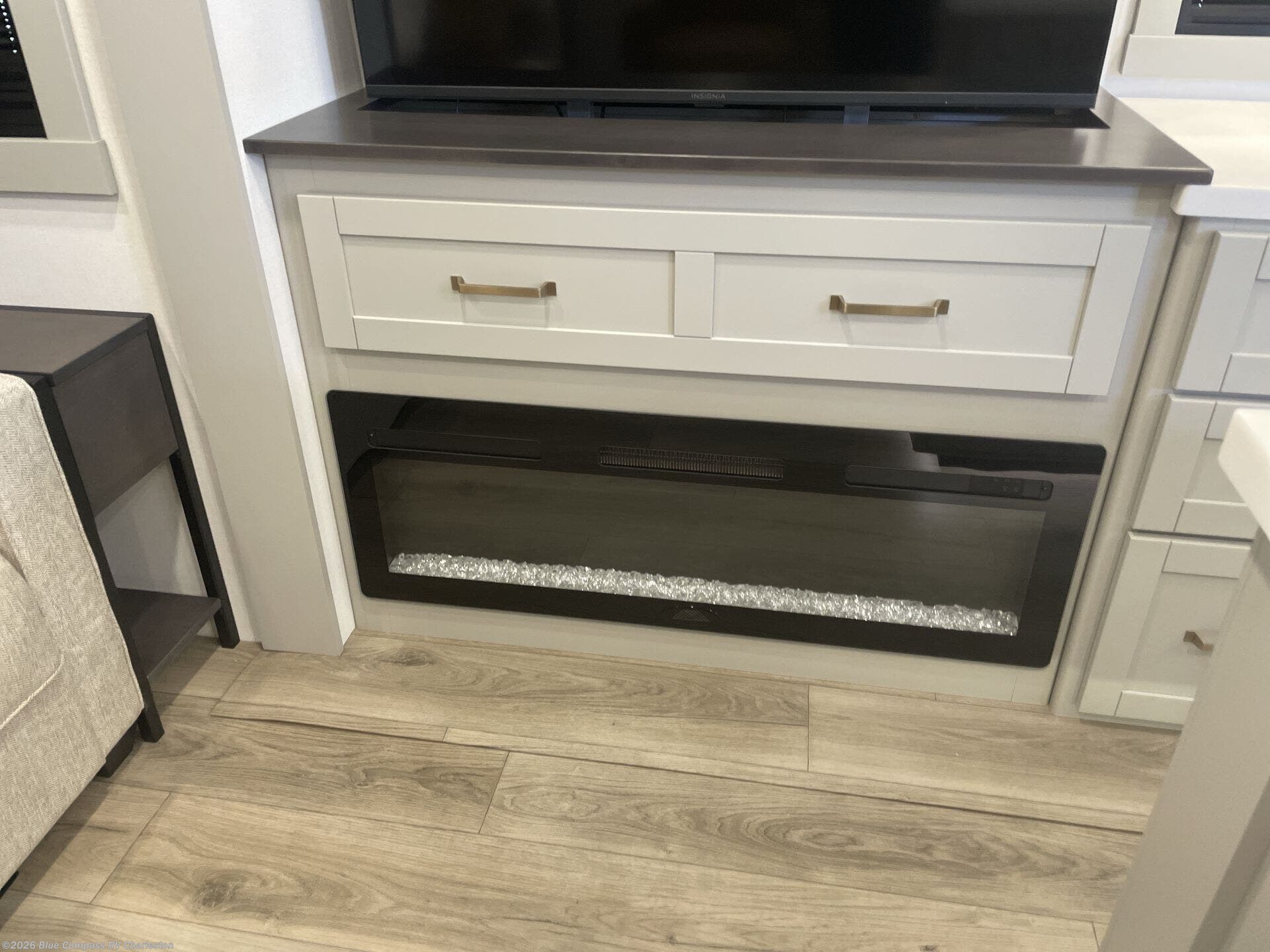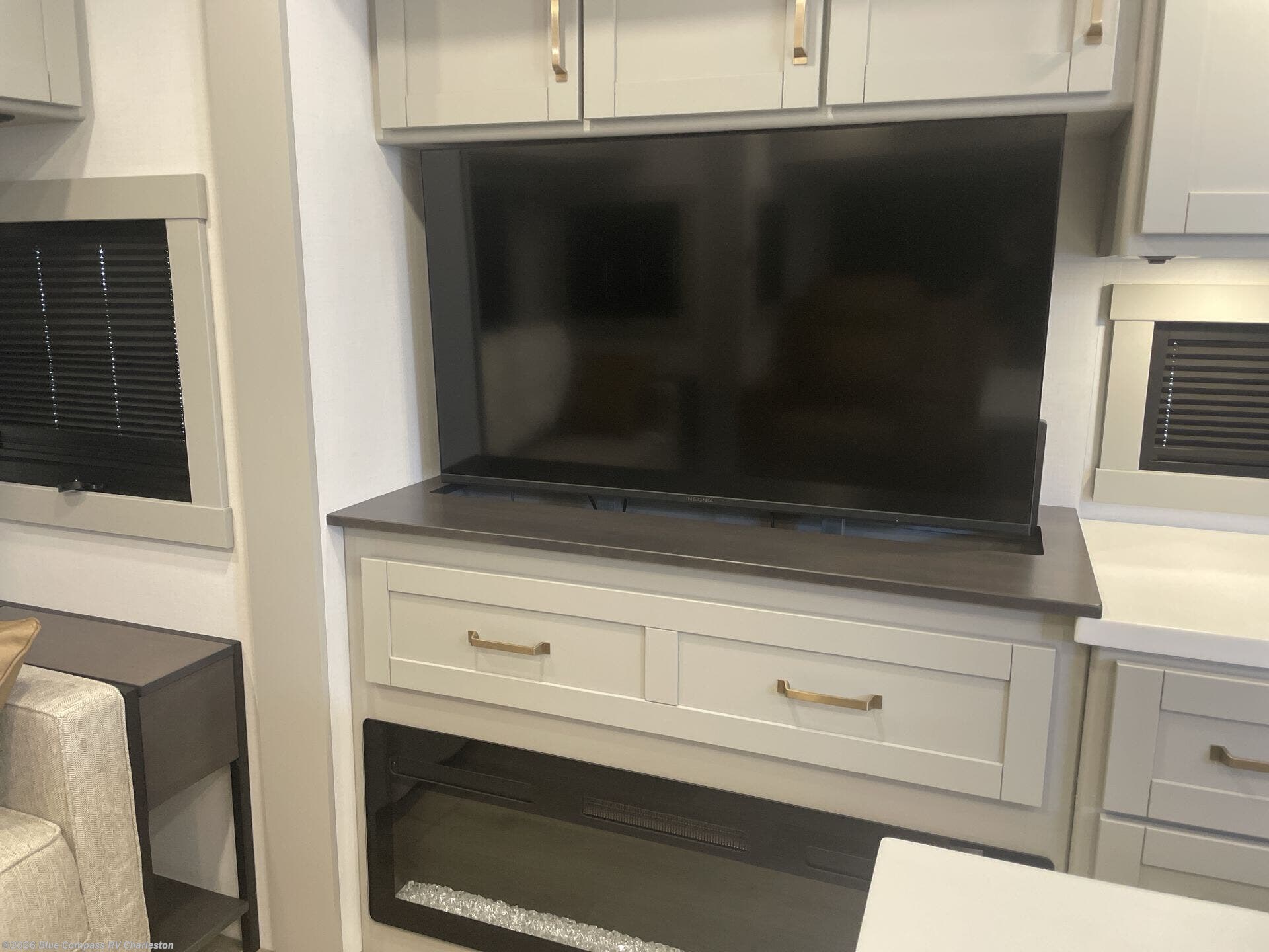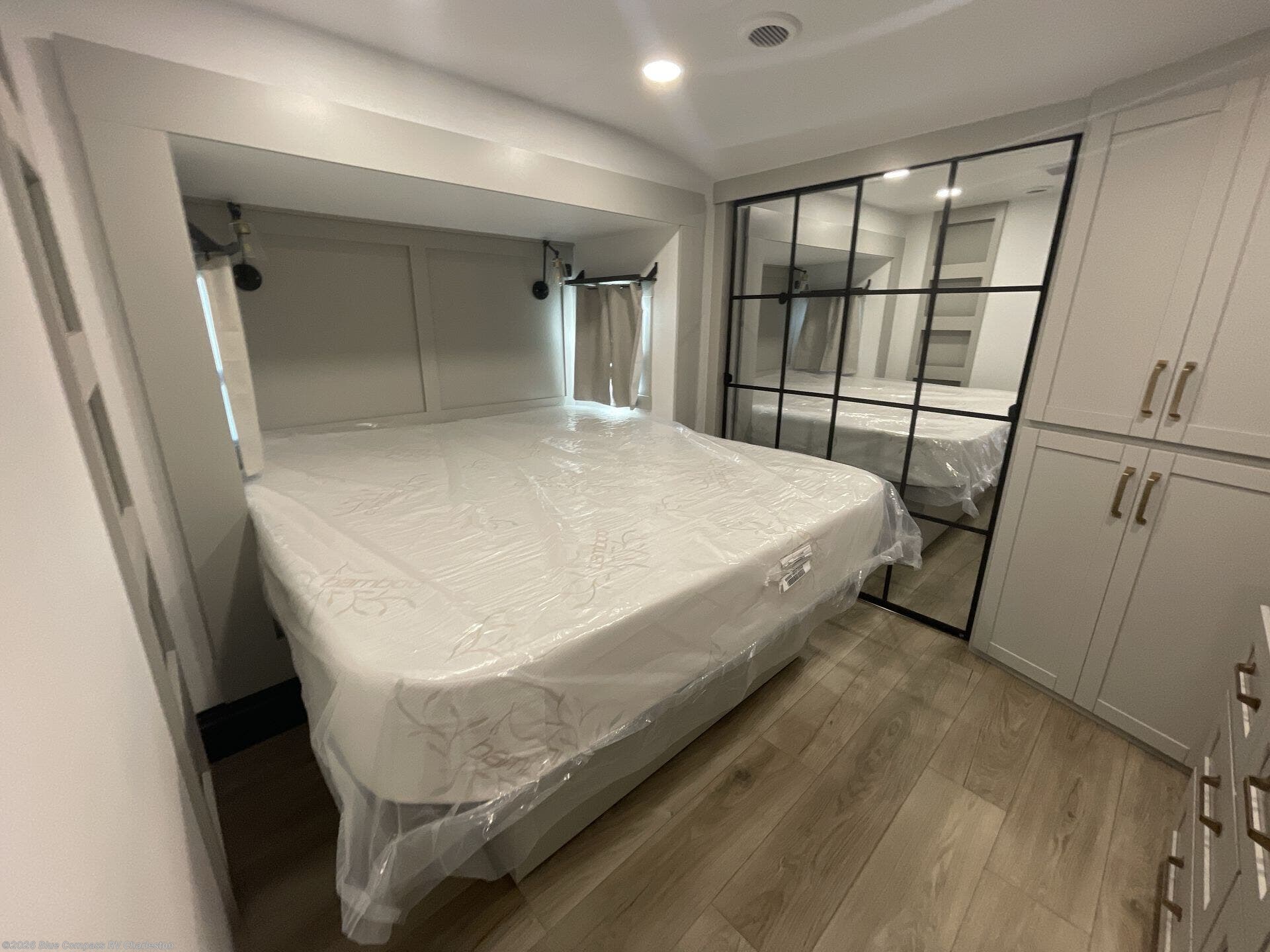This unit is perfect for your family that needs sleeping space for eight! There is ample seating with a sliding desk/dining table, 62" theater seating, and a 72" tri-fold sofa along the rear wall. You can easily relax and enjoy the telescoping TV with a cozy fireplace below. The kitchen offers all that you need to prepare and cook meals just like home with a 16 cu. ft. refrigerator for your perishables, a 30" residential microwave oven, and three burner range top and oven. You will love the kitchen island all outfitted with pull-out pet bowls and double pull out trash bins with an integrated Stow & Go paper towel holder. There is also an 84" pantry with adjustable shelves for all of your canned and dry goods. Mid-coach, just ahead through the main entry, is a bonus room that can be used as a bedroom featuring a sofa bed with flip-up overhead bunk and trundle below, or an office with pull-out desk so that you can work easily while you travel, or it could also be used as a gaming room since there is also a 50" Smart TV. Head up the steps to a bathroom on your left and a private master suite with king bed slide all the way up front. A sliding dresser top features hidden storage which is perfect for jewelry and other personal belongings. The front wardrobe features mirrored doors and the corner closet has been prepped for a stackable washer and dryer if you choose to add that option.