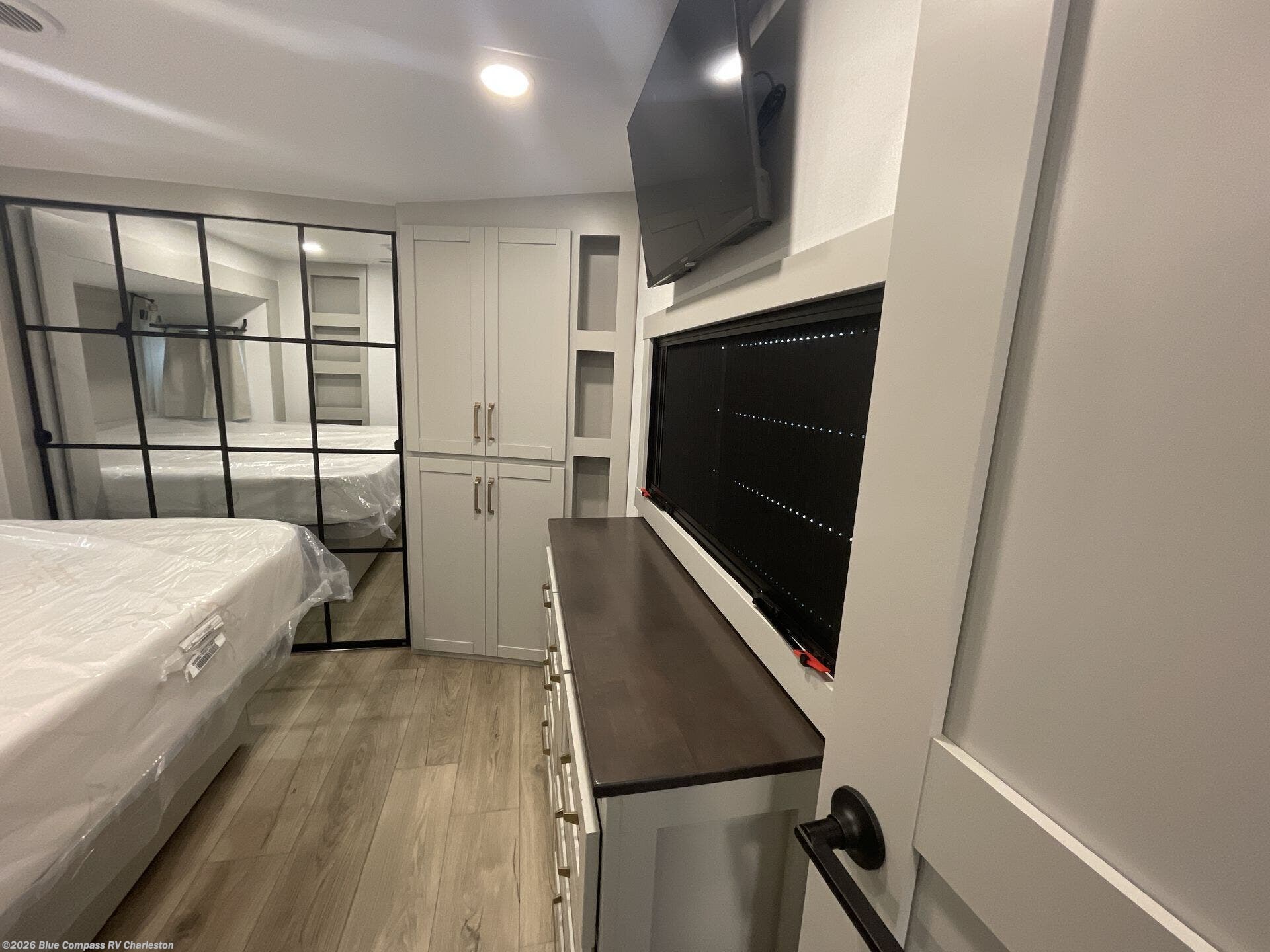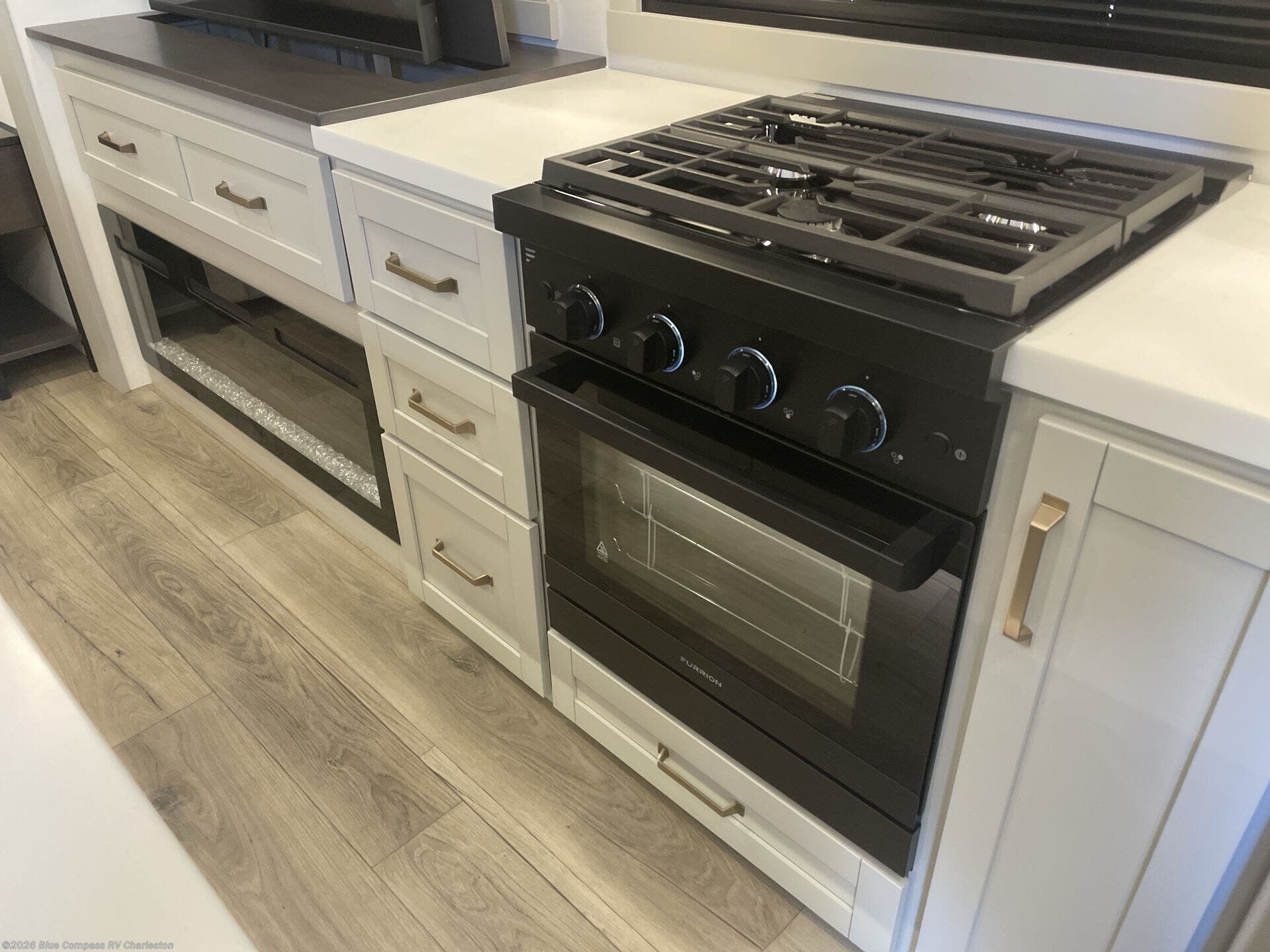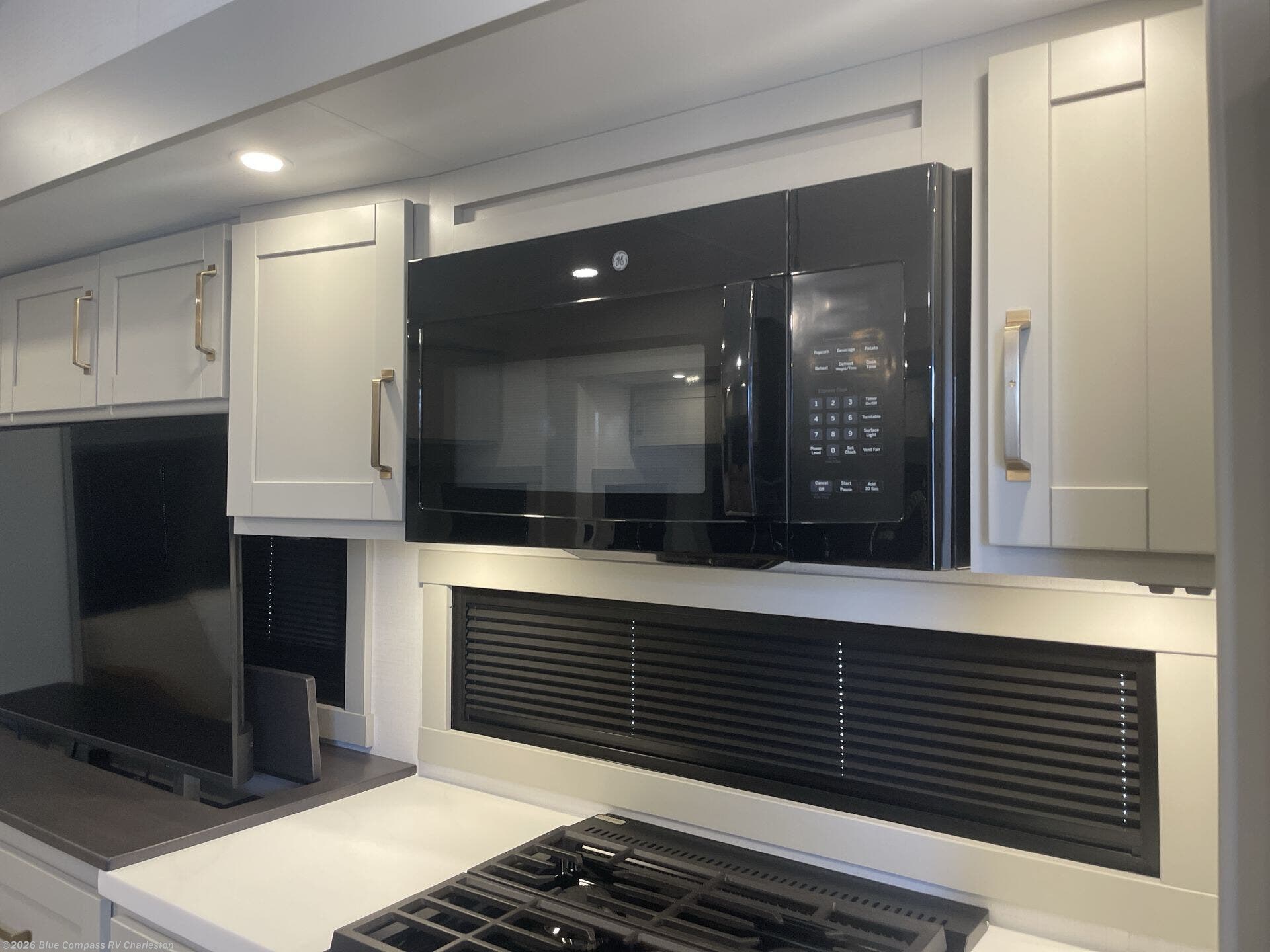 This unit is perfect for your family that needs sleeping space for eight! There is ample seating with a sliding desk/dining table, 62" theater seating, and a 72" tri-fold sofa along the rear wall. You can easily relax and enjoy the telescoping TV with a cozy fireplace below. The kitchen offers all that you need to prepare and cook meals just like home with a 16 cu. ft. refrigerator for your perishables, a 30" residential microwave oven, and three burner range top and oven. You will love the kitchen island all outfitted with pull-out pet bowls and double pull out trash bins with an integrated Stow & Go paper towel holder. There is also an 84" pantry with adjustable shelves for all of your canned and dry goods. Mid-coach, just ahead through the main entry, is a bonus room that can be used as a bedroom featuring a sofa bed with flip-up overhead bunk and trundle below, or an office with pull-out desk so that you can work easily while you travel, or it could also be used as a gaming room since there is also a 50" Smart TV. Head up the steps to a bathroom on your left and a private master suite with king bed slide all the way up front. A sliding dresser top features hidden storage which is perfect for jewelry and other personal belongings. The front wardrobe features mirrored doors and the corner closet has been prepped for a stackable washer and dryer if you choose to add that option.