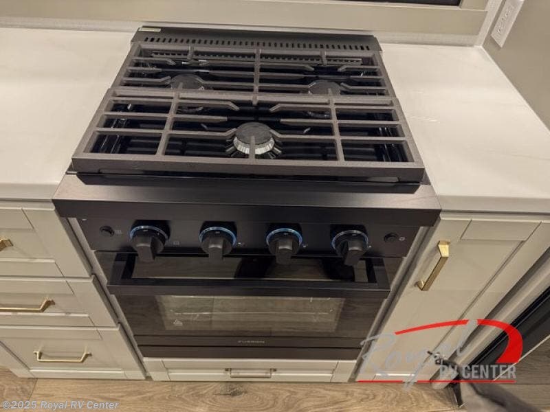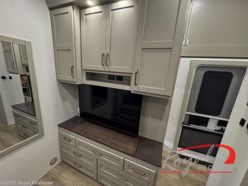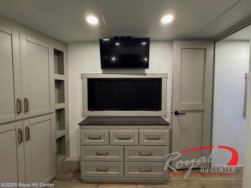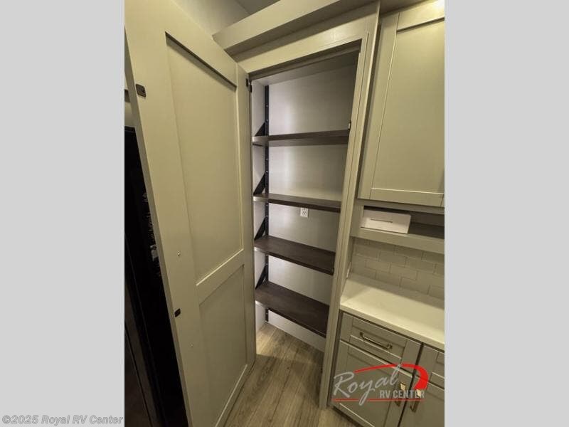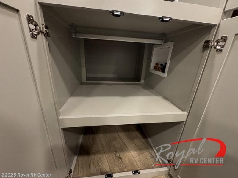 This unit is perfect for your family that needs sleeping space for eight! There is ample seating with a sliding desk/dining table, 62" theater seating, and a 72" tri-fold sofa along the rear wall. You can easily relax and enjoy the telescoping TV with a cozy fireplace below. The kitchen offers all that you need to prepare and cook meals just like home with a 16 cu. ft. refrigerator for your perishables, a 30" residential microwave oven, and three burner range top and oven. You will love the kitchen island all outfitted with pull-out pet bowls and double pull out trash bins with an integrated Stow & Go paper towel holder. There is also an 84" pantry with adjustable shelves for all of your canned and dry goods. Mid-coach, just ahead through the main entry, is a bonus room that can be used as a bedroom featuring a sofa bed with flip-up overhead bunk and trundle below, or an office with pull-out desk so that you can work easily while you travel, or it could also be used as a gaming room since there is also a 50" Smart TV. Head up the steps to a bathroom on your left and a private master suite with king bed slide all the way up front. A sliding dresser top features hidden storage which is perfect for jewelry and other personal belongings. The front wardrobe features mirrored doors and the corner closet has been prepped for a stackable washer and dryer if you choose to add that option.