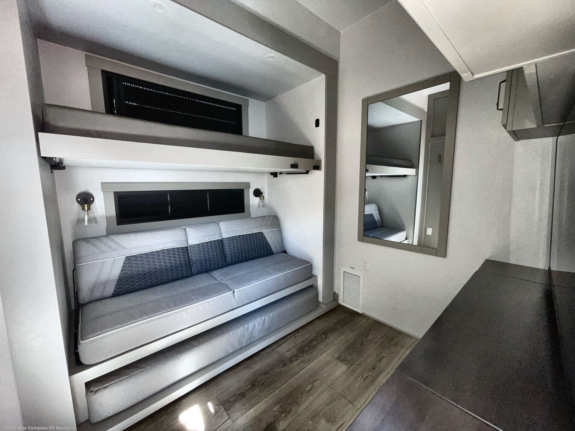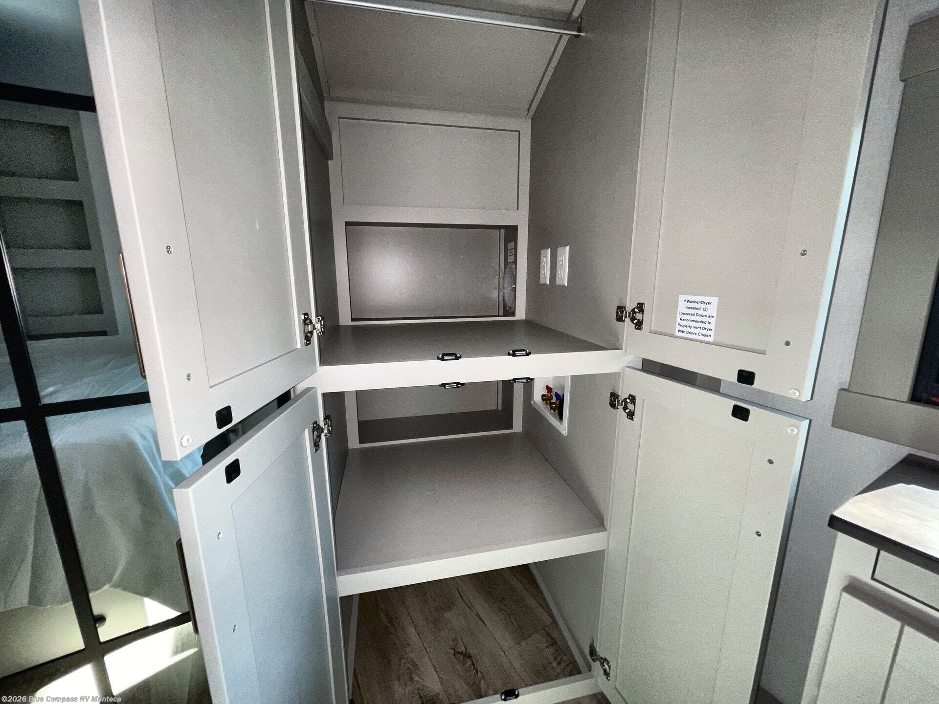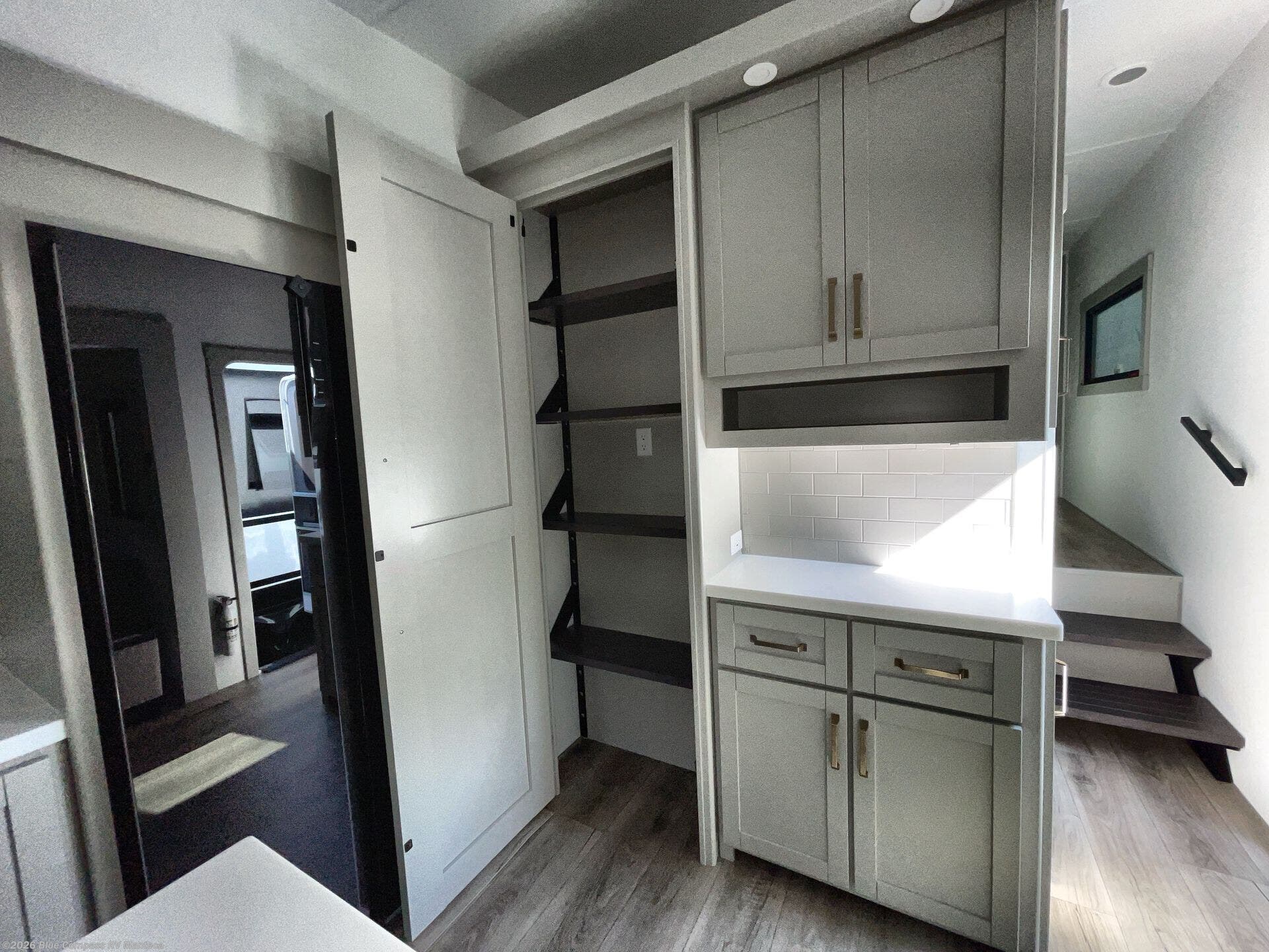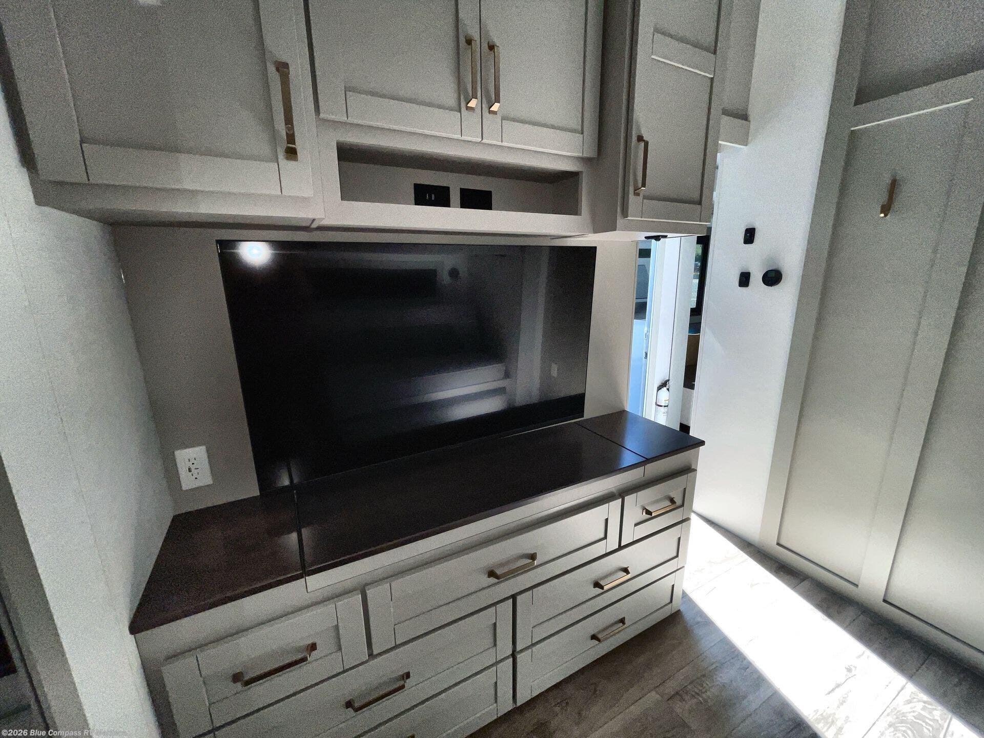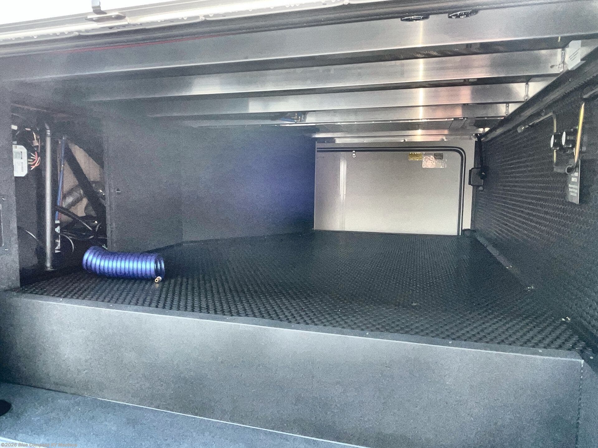 This unit is perfect for your family that needs sleeping space for eight! There is ample seating with a sliding desk/dining table, 62" theater seating, and a 72" tri-fold sofa along the rear wall. You can easily relax and enjoy the telescoping TV with a cozy fireplace below. The kitchen offers all that you need to prepare and cook meals just like home with a 16 cu. ft. refrigerator for your perishables, a 30" residential microwave oven, and three burner range top and oven. You will love the kitchen island all outfitted with pull-out pet bowls and double pull out trash bins with an integrated Stow & Go paper towel holder. There is also an 84" pantry with adjustable shelves for all of your canned and dry goods. Mid-coach, just ahead through the main entry, is a bonus room that can be used as a bedroom featuring a sofa bed with flip-up overhead bunk and trundle below, or an office with pull-out desk so that you can work easily while you travel, or it could also be used as a gaming room since there is also a 50" Smart TV. Head up the steps to a bathroom on your left and a private master suite with king bed slide all the way up front. A sliding dresser top features hidden storage which is perfect for jewelry and other personal belongings. The front wardrobe features mirrored doors and the corner closet has been prepped for a stackable washer and dryer if you choose to add that option.