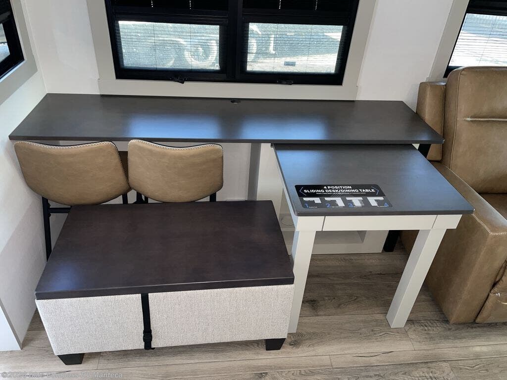 This unit is perfect for your family that needs sleeping space for eight! There is ample seating with a sliding desk/dining table, 62" theater seating, and a 72" tri-fold sofa along the rear wall. You can easily relax and enjoy the telescoping TV with a cozy fireplace below. The kitchen offers all that you need to prepare and cook meals just like home with a 16 cu. ft. refrigerator for your perishables, a 30" residential microwave oven, and three burner range top and oven. You will love the kitchen island all outfitted with pull-out pet bowls and double pull out trash bins with an integrated Stow & Go paper towel holder. There is also an 84" pantry with adjustable shelves for all of your canned and dry goods. Mid-coach, just ahead through the main entry, is a bonus room that can be used as a bedroom featuring a sofa bed with flip-up overhead bunk and trundle below, or an office with pull-out desk so that you can work easily while you travel, or it could also be used as a gaming room since there is also a 50" Smart TV. Head up the steps to a bathroom on your left and a private master suite with king bed slide all the way up front. A sliding dresser top features hidden storage which is perfect for jewelry and other personal belongings. The front wardrobe features mirrored doors and the corner closet has been prepped for a stackable washer and dryer if you choose to add that option.