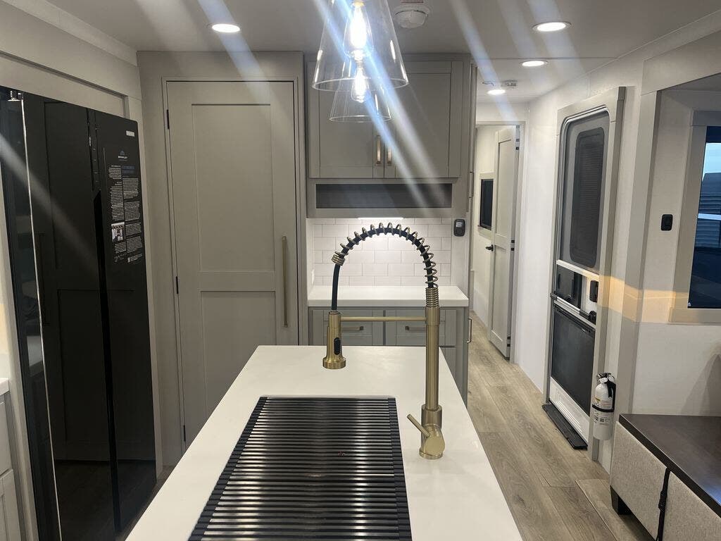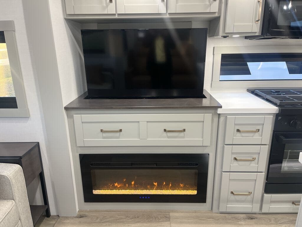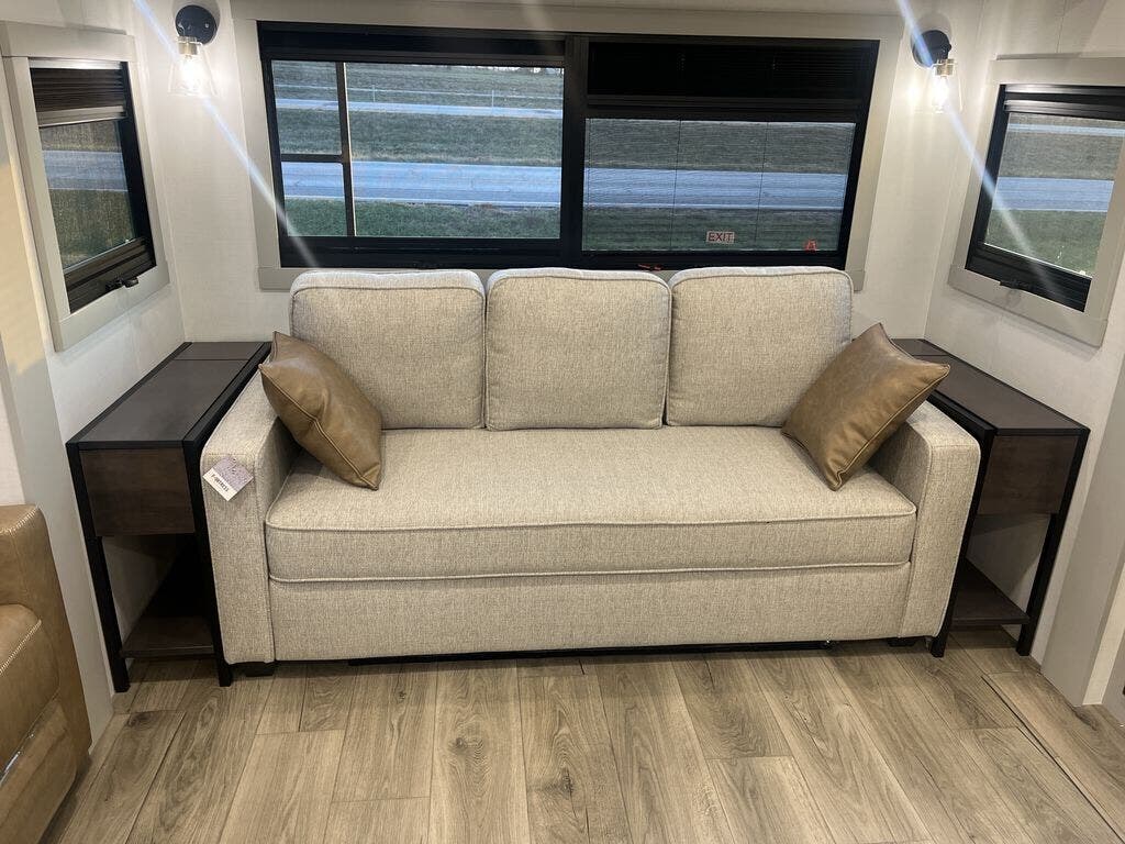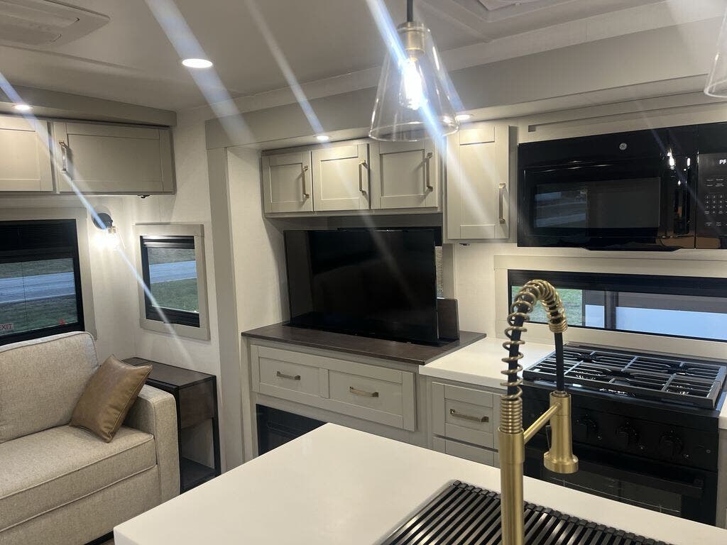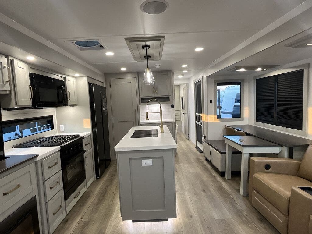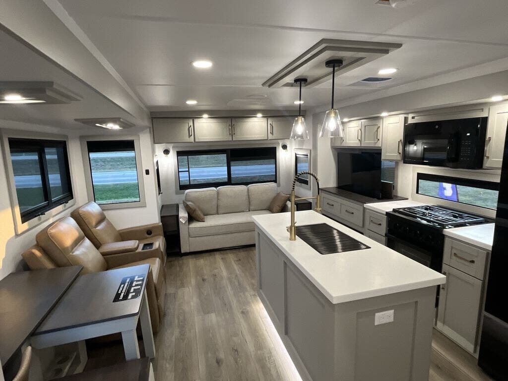This travel trailer is spacious thanks to the dual opposing slides in the combined kitchen and living area. There is a rear 72" tri-fold sofa here, theater seating, and a sliding desk/dining table. The televator and fireplace will let you relax each evening with a movie or good book, and the full kitchen lets you make meals wherever you go. The chef of your group will also appreciate the pantry with adjustable shelving for all their ingredients, a hutch, 30" residential microwave, and even a pull-out trash bin for easy clean-up. When you're ready to call it a night, the front private bedroom will be waiting for you. This room includes a queen bed with four underbed drawers, a closet with pass-thru access to the bathroom closet, plus washer and dryer prep if you want the option to go full-time!