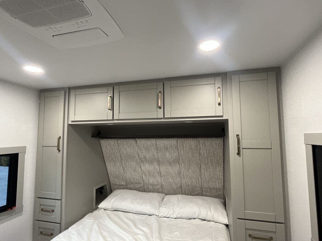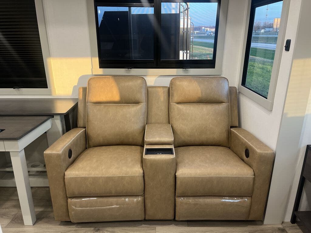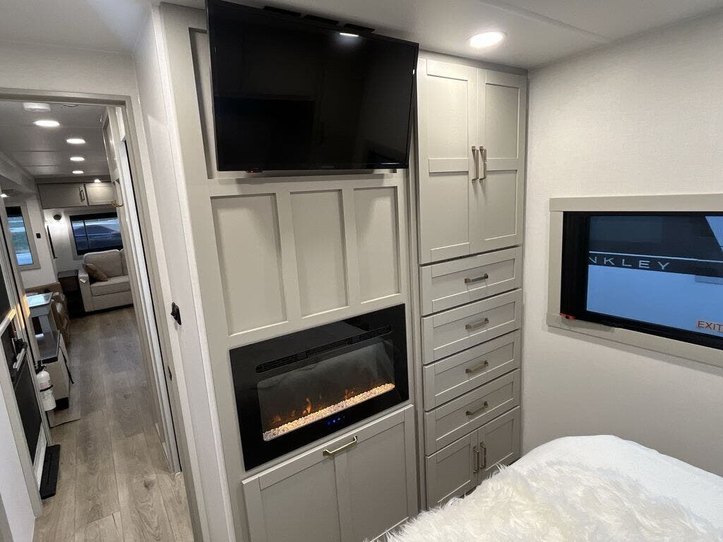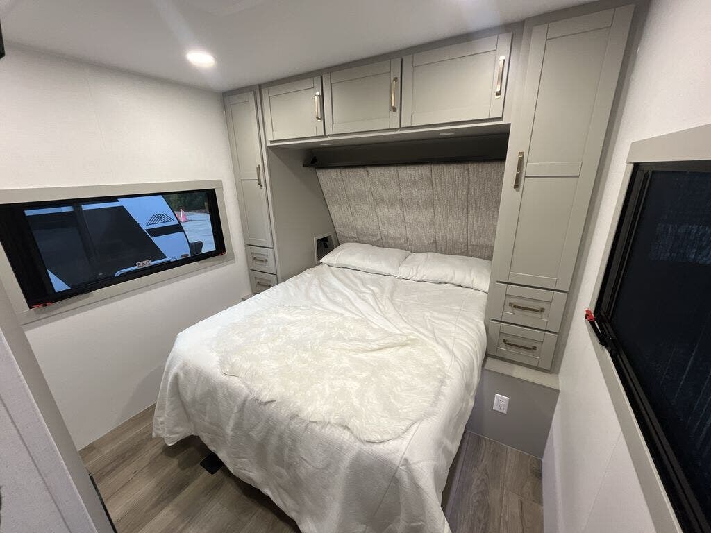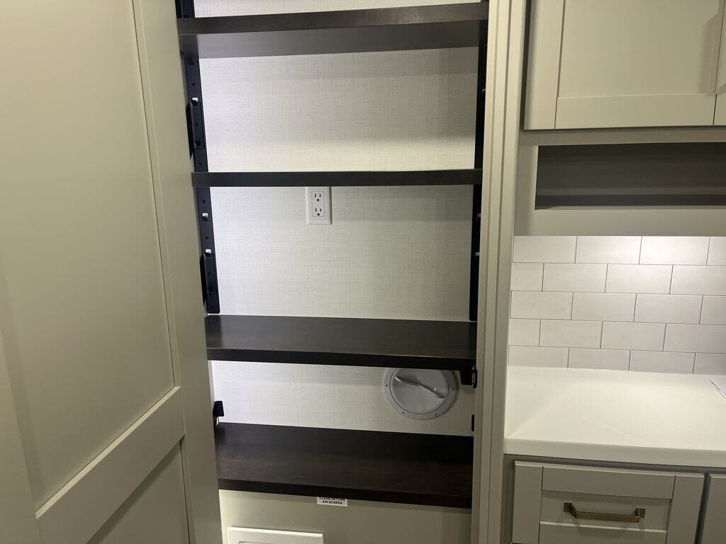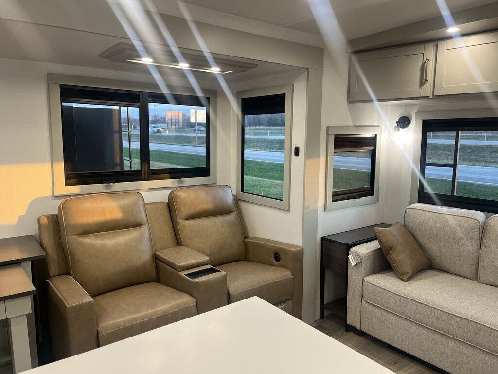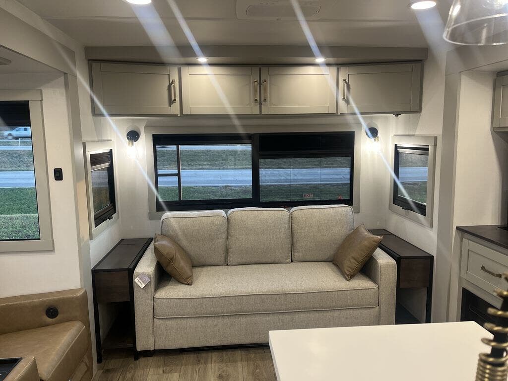 This travel trailer is spacious thanks to the dual opposing slides in the combined kitchen and living area. There is a rear 72" tri-fold sofa here, theater seating, and a sliding desk/dining table. The televator and fireplace will let you relax each evening with a movie or good book, and the full kitchen lets you make meals wherever you go. The chef of your group will also appreciate the pantry with adjustable shelving for all their ingredients, a hutch, 30" residential microwave, and even a pull-out trash bin for easy clean-up. When you're ready to call it a night, the front private bedroom will be waiting for you. This room includes a queen bed with four underbed drawers, a closet with pass-thru access to the bathroom closet, plus washer and dryer prep if you want the option to go full-time!