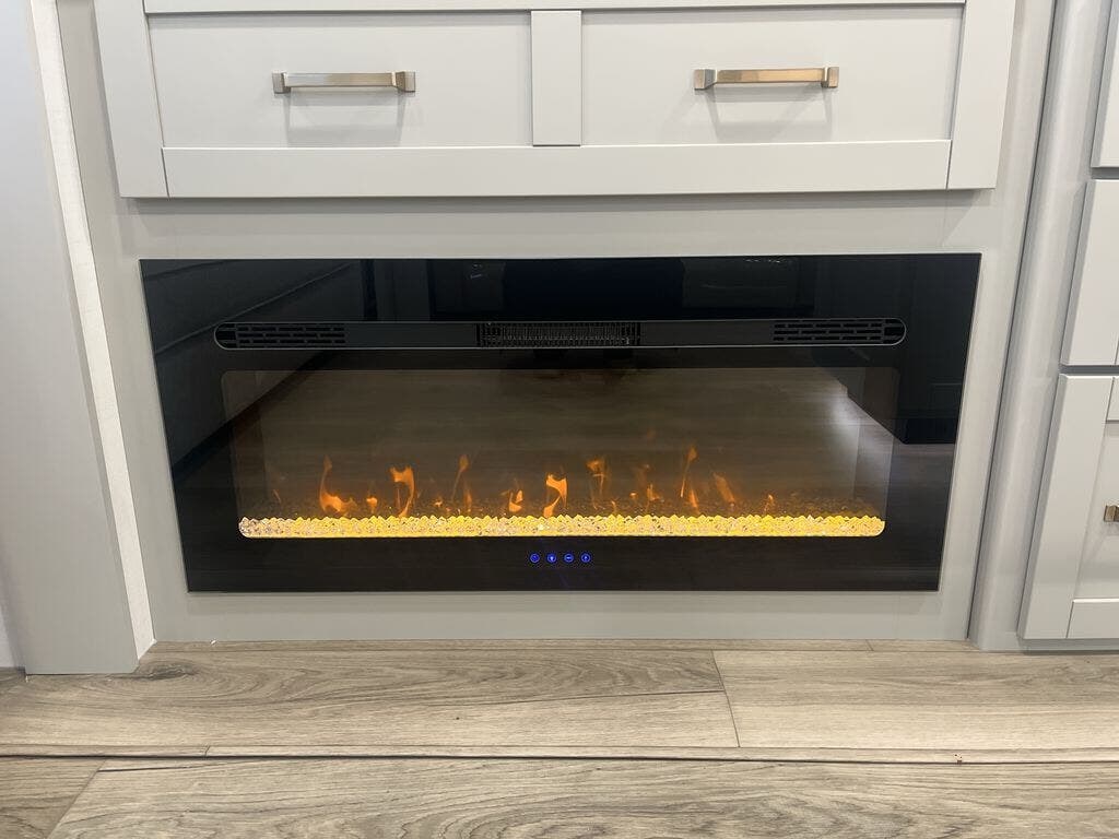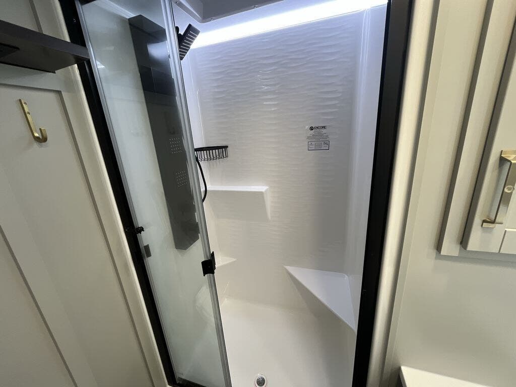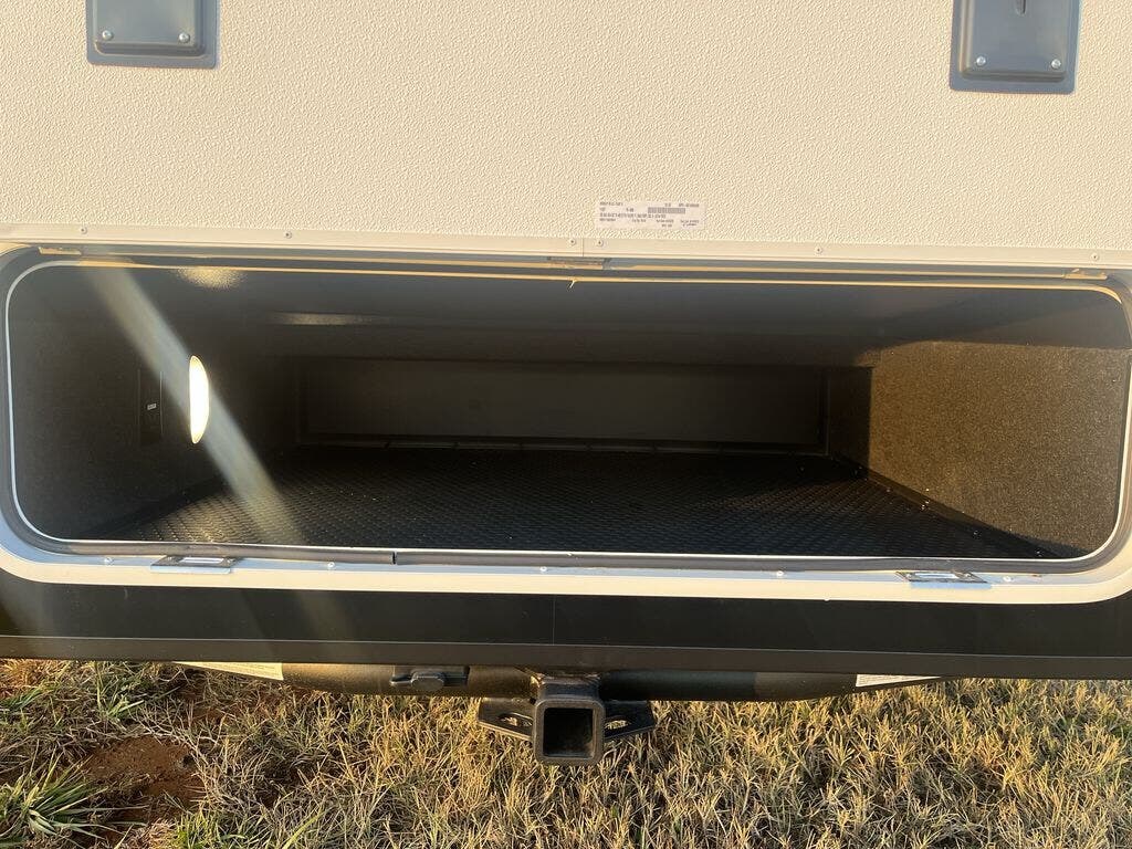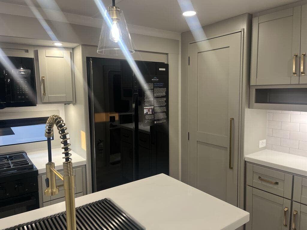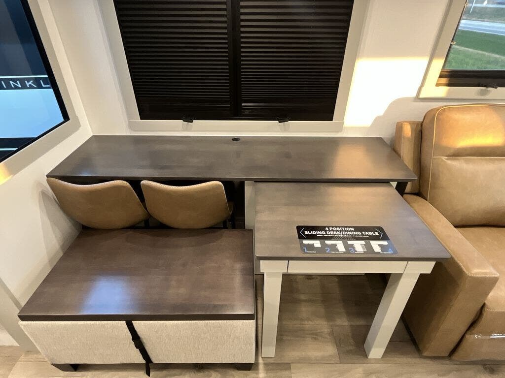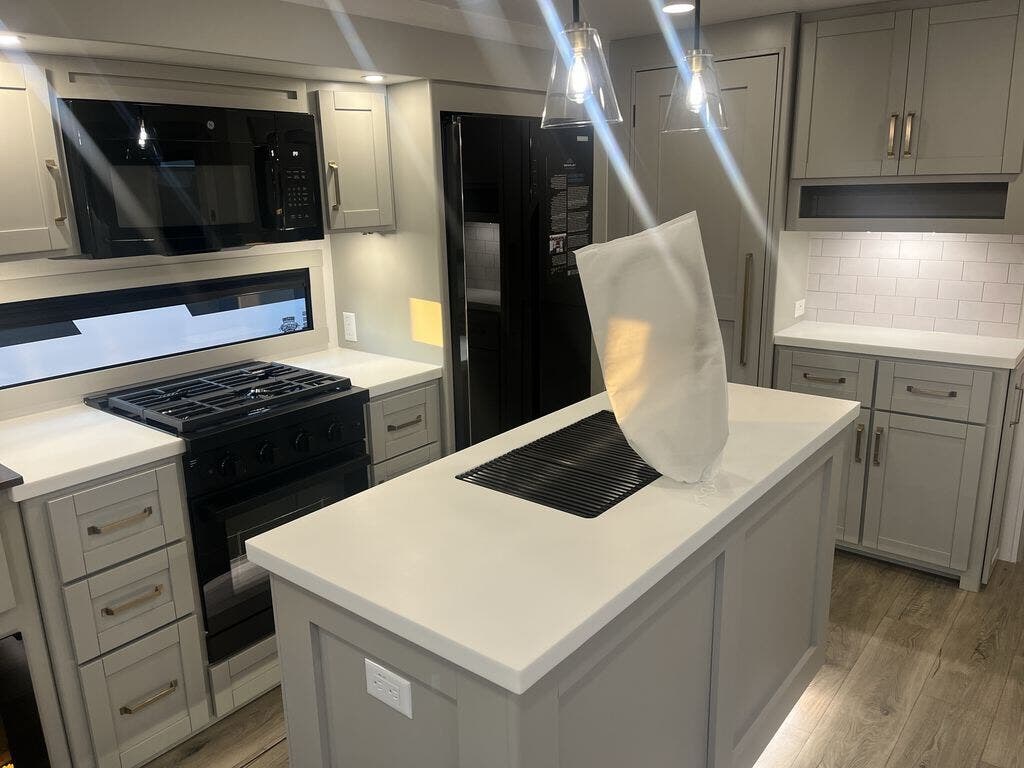 This travel trailer is spacious thanks to the dual opposing slides in the combined kitchen and living area. There is a rear 72" tri-fold sofa here, theater seating, and a sliding desk/dining table. The televator and fireplace will let you relax each evening with a movie or good book, and the full kitchen lets you make meals wherever you go. The chef of your group will also appreciate the pantry with adjustable shelving for all their ingredients, a hutch, 30" residential microwave, and even a pull-out trash bin for easy clean-up. When you're ready to call it a night, the front private bedroom will be waiting for you. This room includes a queen bed with four underbed drawers, a closet with pass-thru access to the bathroom closet, plus washer and dryer prep if you want the option to go full-time!