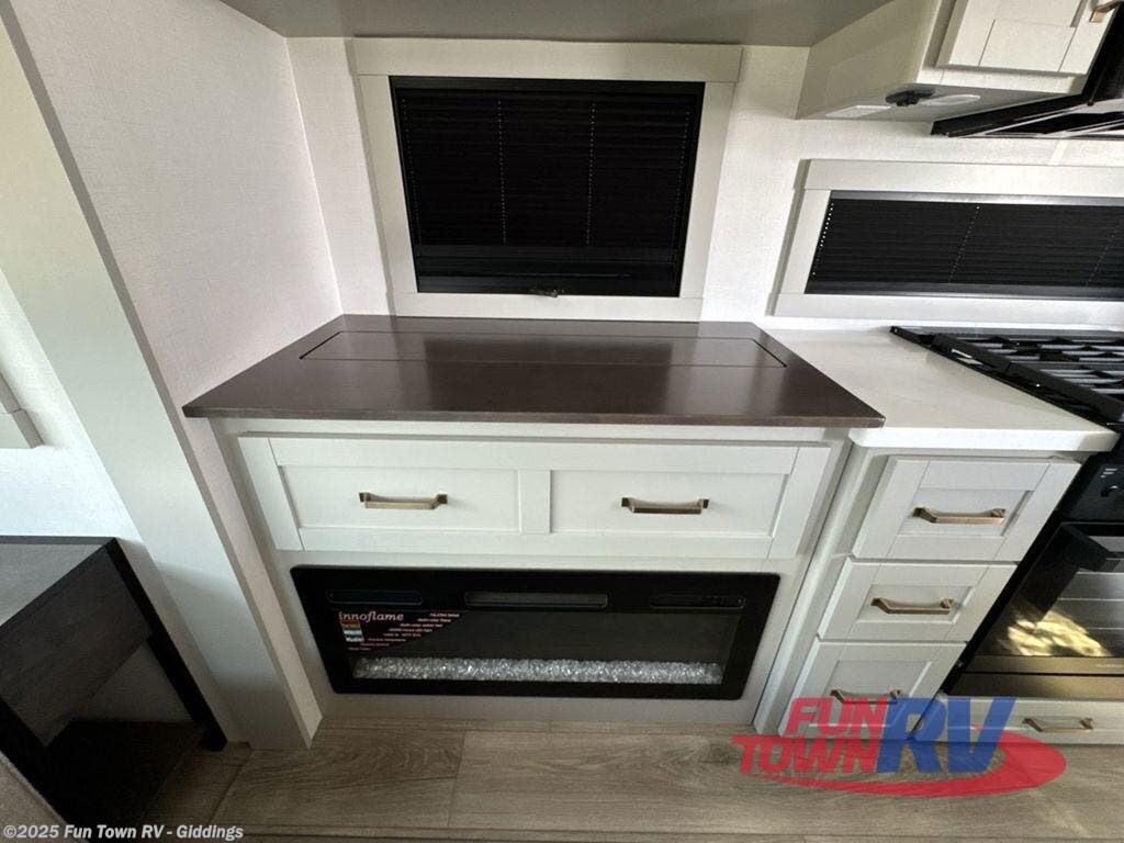 This travel trailer is spacious thanks to the dual opposing slides in the combined kitchen and living area. There is a rear 72" tri-fold sofa here, theater seating, and a sliding desk/dining table. The televator and fireplace will let you relax each evening with a movie or good book, and the full kitchen lets you make meals wherever you go. The chef of your group will also appreciate the pantry with adjustable shelving for all their ingredients, a hutch, 30" residential microwave, and even a pull-out trash bin for easy clean-up. When you're ready to call it a night, the front private bedroom will be waiting for you. This room includes a queen bed with four underbed drawers, a closet with pass-thru access to the bathroom closet, plus washer and dryer prep if you want the option to go full-time!