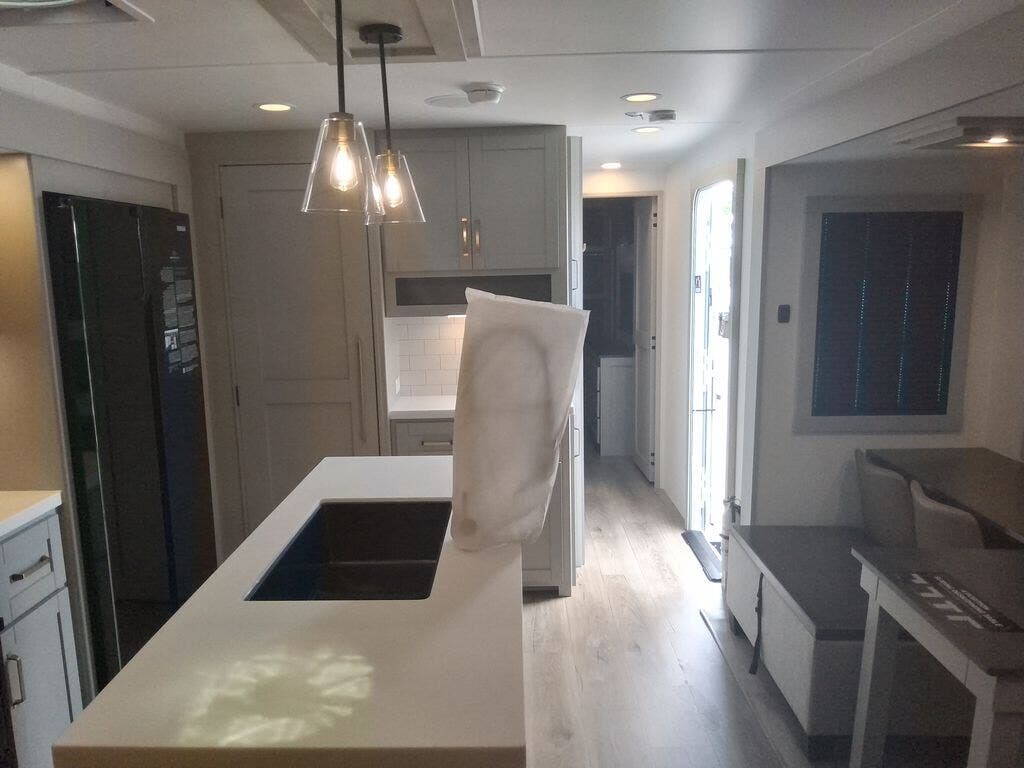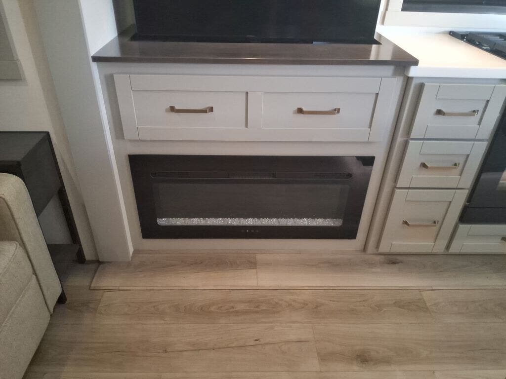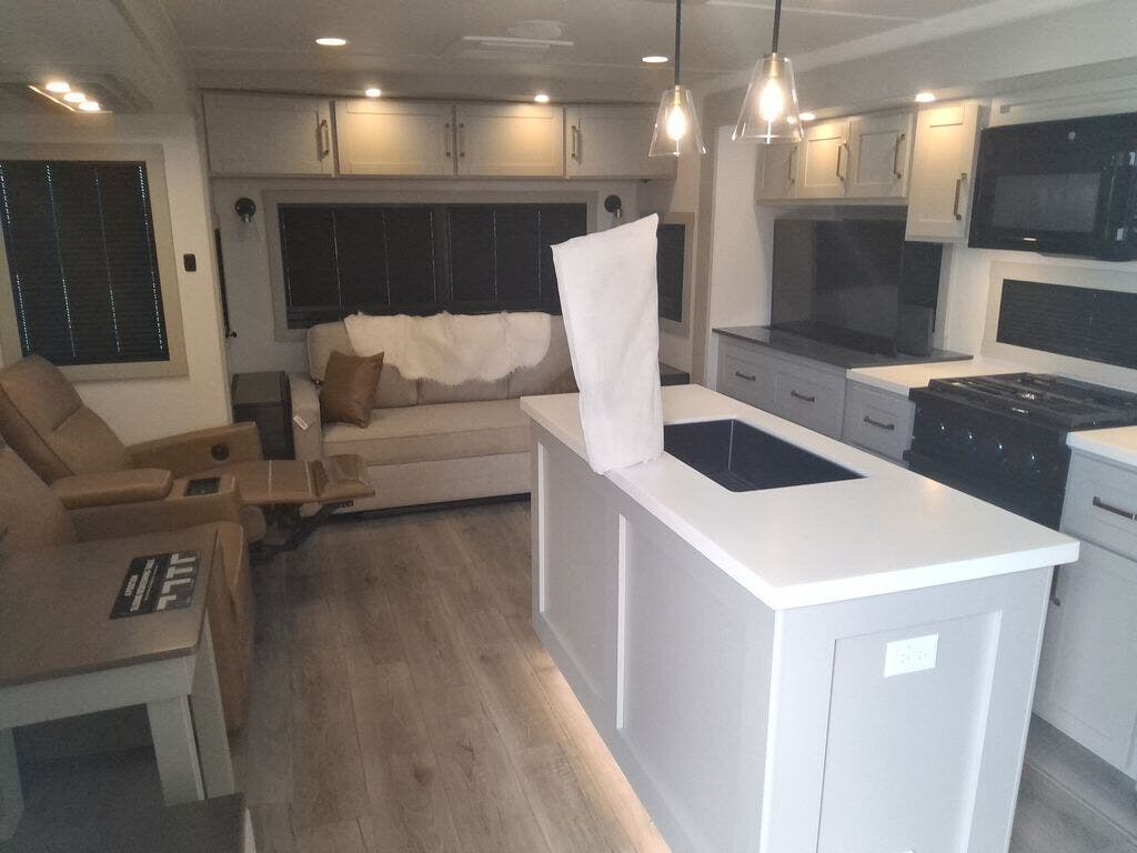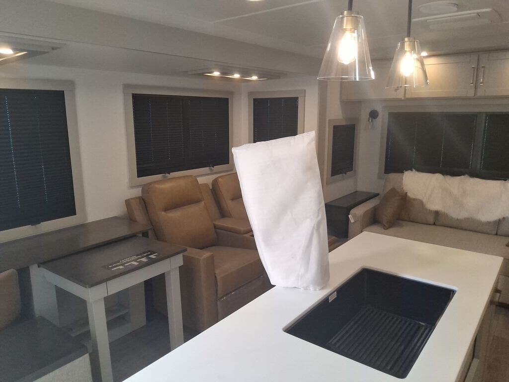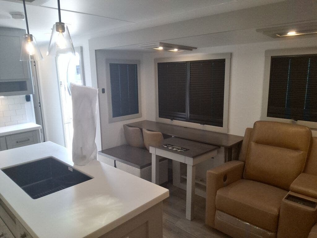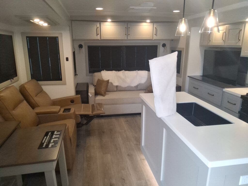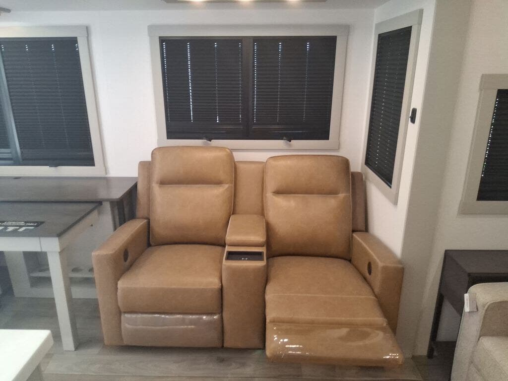 You will love all the space and features in this travel trailer! A luxurious rear living room offers plenty of room to spread out, with a 72" tri-fold sofa plus theater seats, all arranged with a perfect view of the 50" TV over the fireplace. A central kitchen area includes an island with hidden pet bowls. Find even more storage with the hutch plus pantry with adjustable shelves. The front bedroom comes with a queen bed, but if you'd like you can upgrade to a king for even more room. No matter which you choose, you will enjoy watching the 32" bedroom TV. The full-width wardrobe has room for all of your clothes and also includes prep for an optional washer and dryer. And the full bath includes a 30" x 42" one-piece fiberglass shower. Outside you'll enjoy two awnings, pass-through storage, and LED chassis lighting.