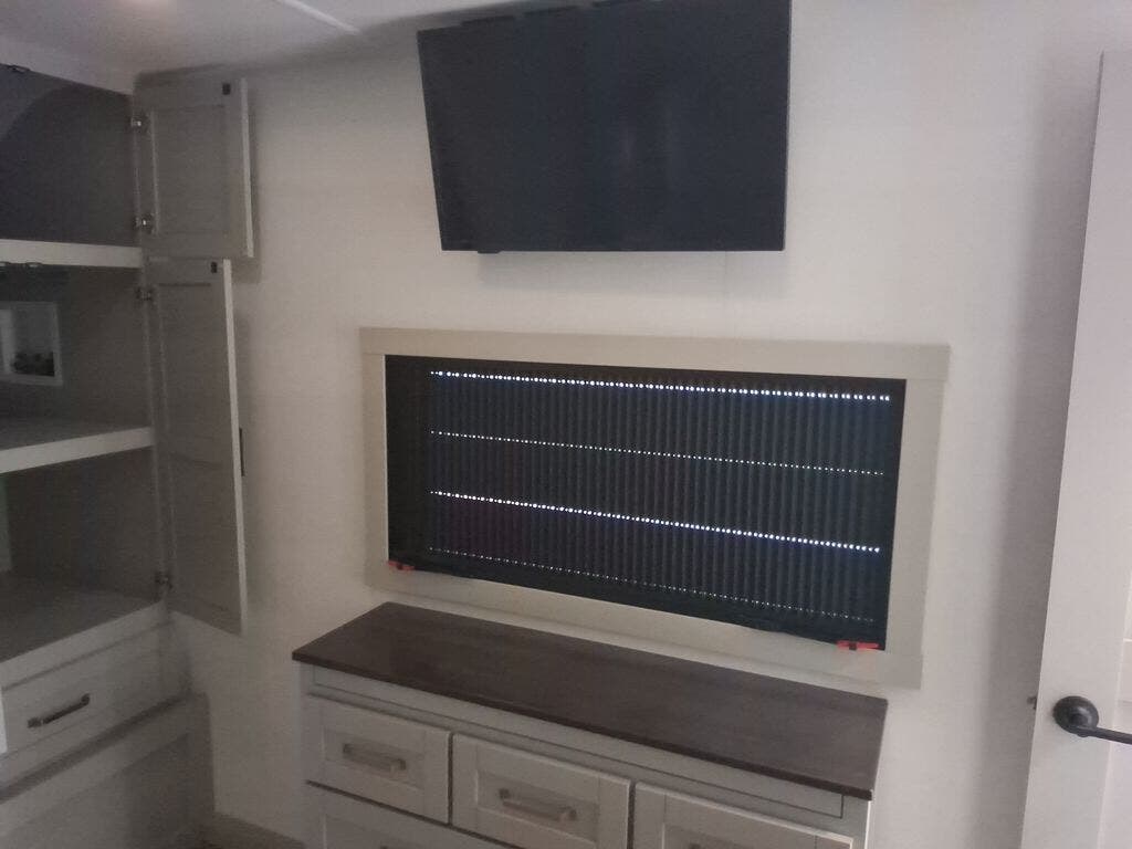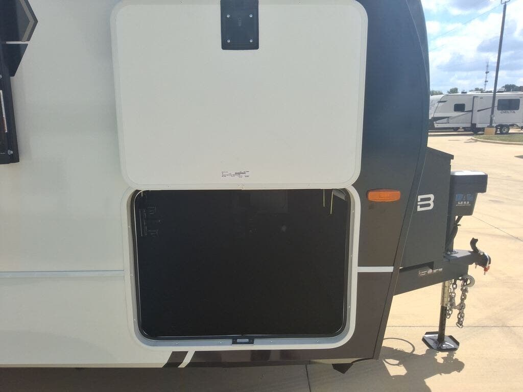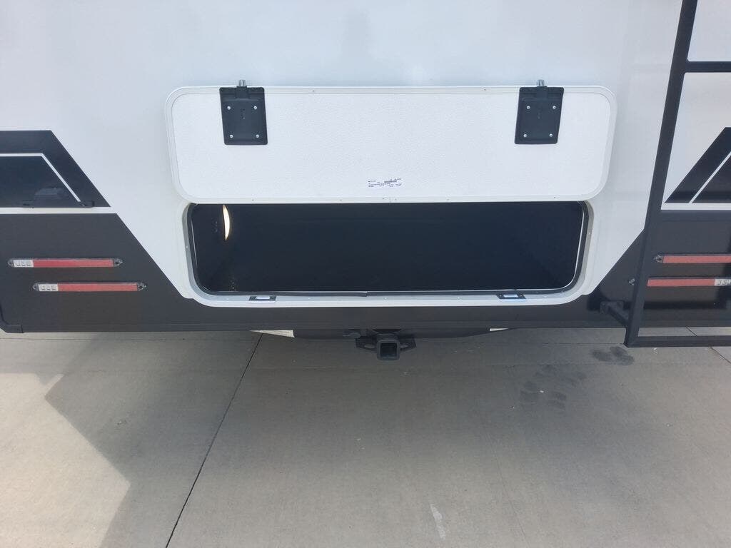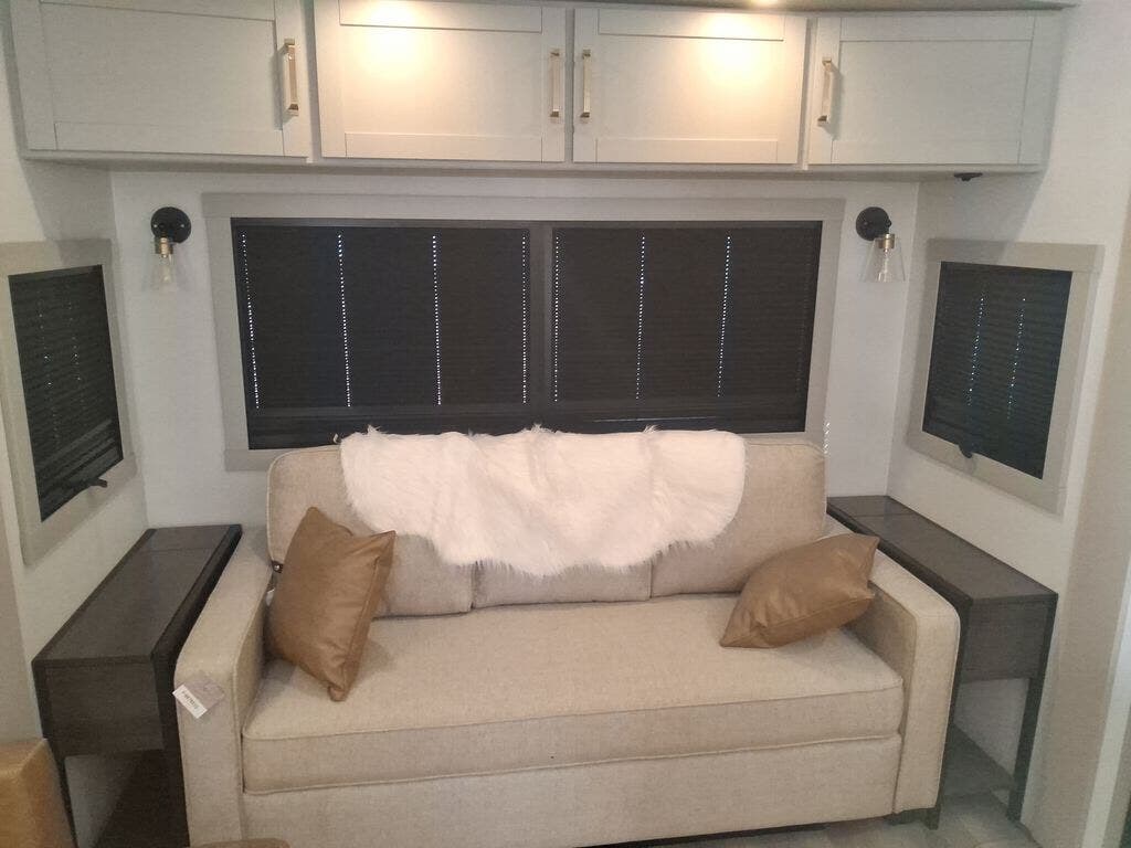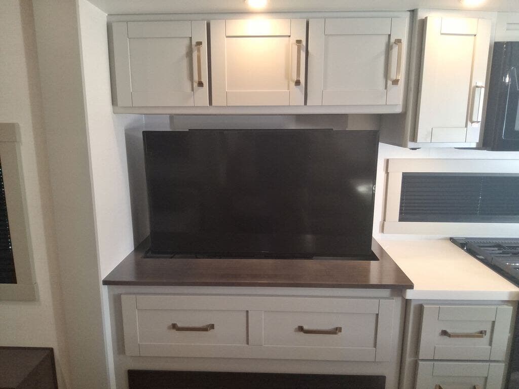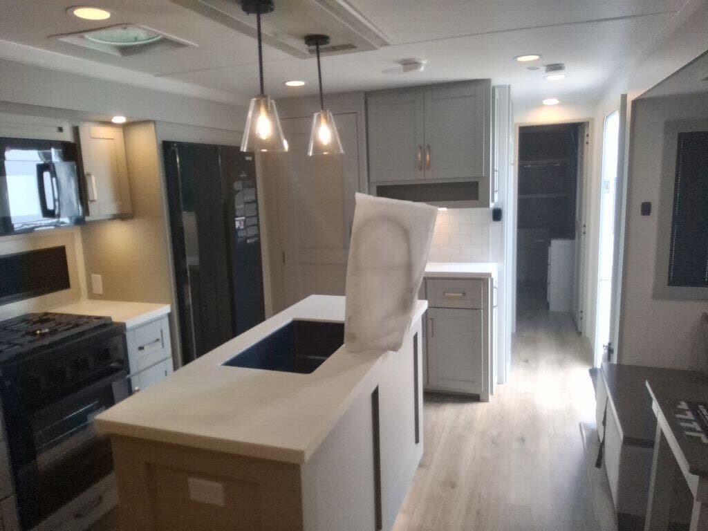 You will love all the space and features in this travel trailer! A luxurious rear living room offers plenty of room to spread out, with a 72" tri-fold sofa plus theater seats, all arranged with a perfect view of the 50" TV over the fireplace. A central kitchen area includes an island with hidden pet bowls. Find even more storage with the hutch plus pantry with adjustable shelves. The front bedroom comes with a queen bed, but if you'd like you can upgrade to a king for even more room. No matter which you choose, you will enjoy watching the 32" bedroom TV. The full-width wardrobe has room for all of your clothes and also includes prep for an optional washer and dryer. And the full bath includes a 30" x 42" one-piece fiberglass shower. Outside you'll enjoy two awnings, pass-through storage, and LED chassis lighting.