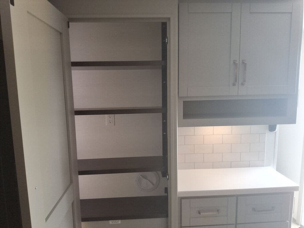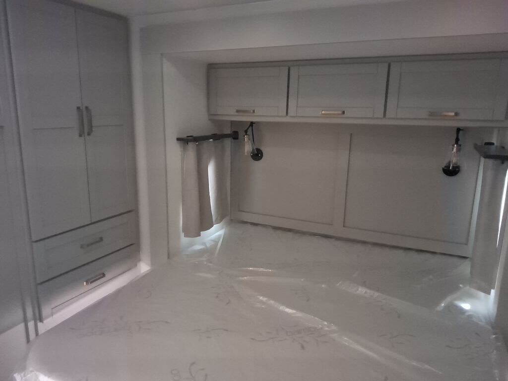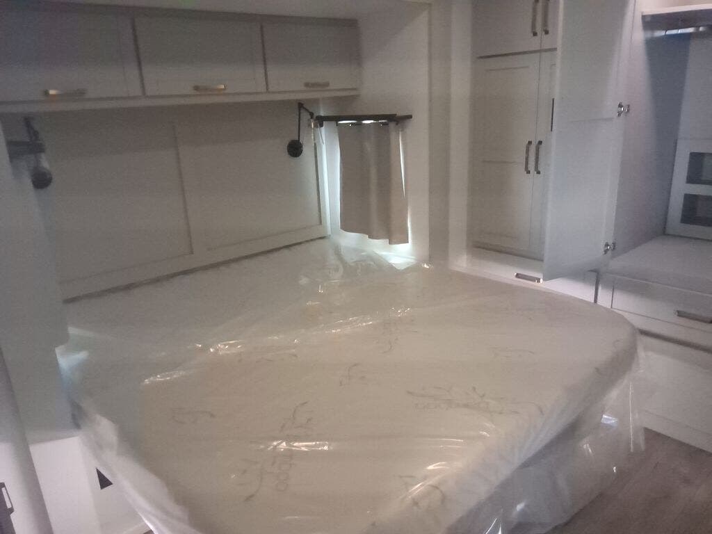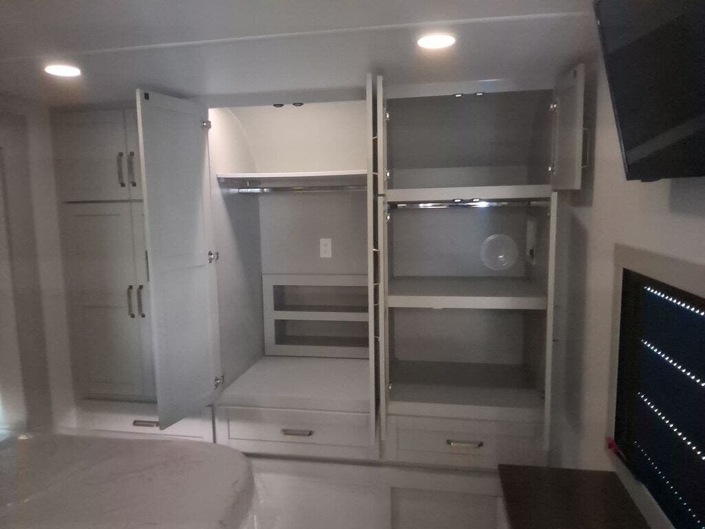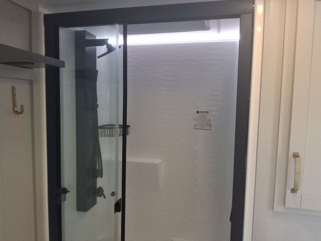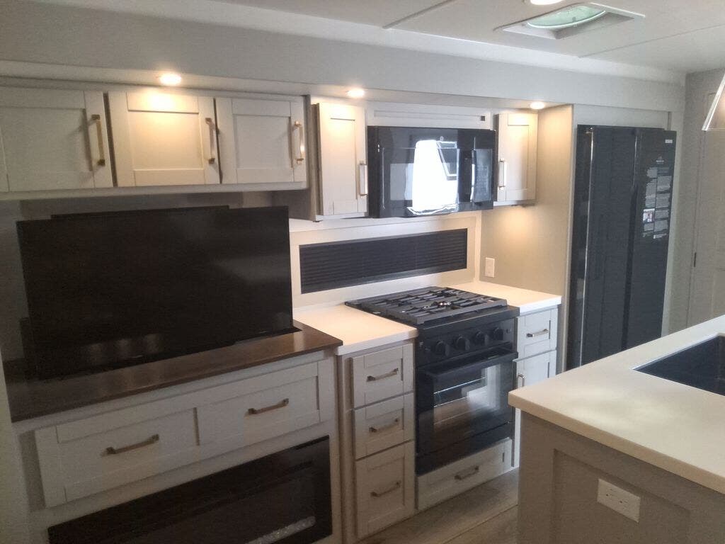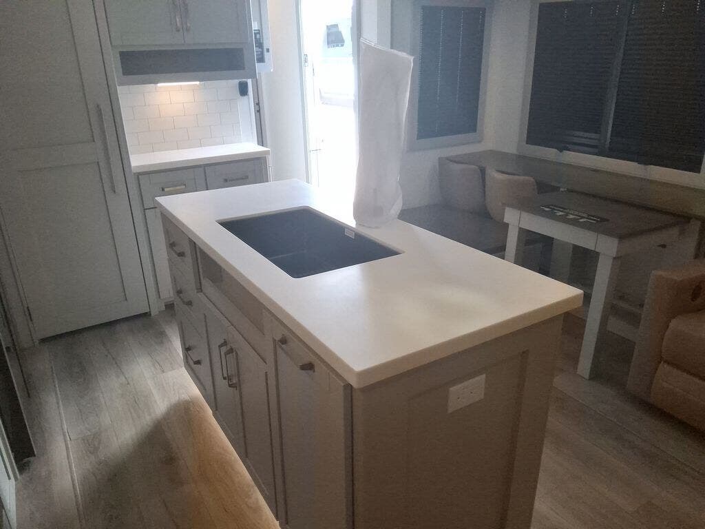 You will love all the space and features in this travel trailer! A luxurious rear living room offers plenty of room to spread out, with a 72" tri-fold sofa plus theater seats, all arranged with a perfect view of the 50" TV over the fireplace. A central kitchen area includes an island with hidden pet bowls. Find even more storage with the hutch plus pantry with adjustable shelves. The front bedroom comes with a queen bed, but if you'd like you can upgrade to a king for even more room. No matter which you choose, you will enjoy watching the 32" bedroom TV. The full-width wardrobe has room for all of your clothes and also includes prep for an optional washer and dryer. And the full bath includes a 30" x 42" one-piece fiberglass shower. Outside you'll enjoy two awnings, pass-through storage, and LED chassis lighting.