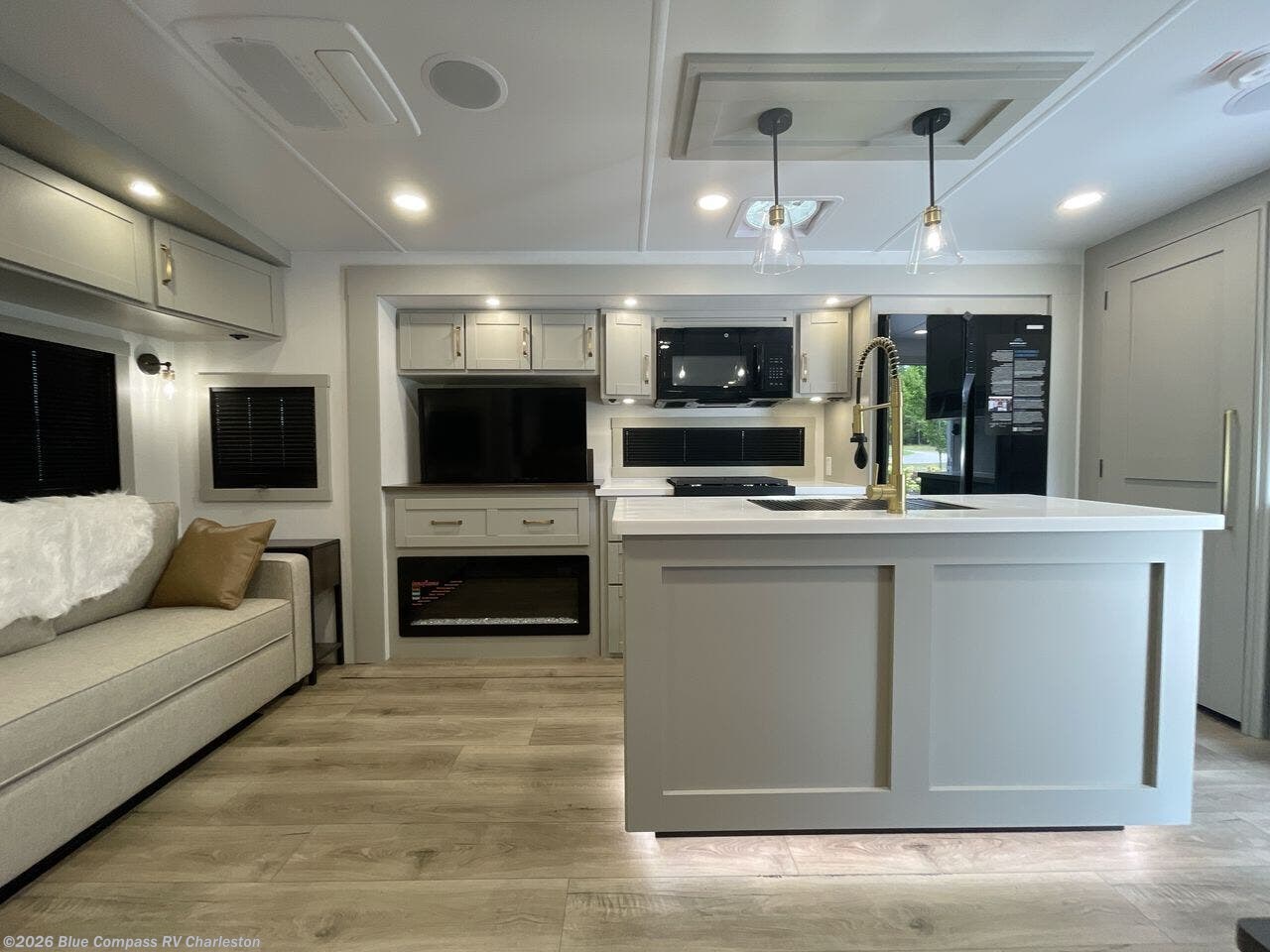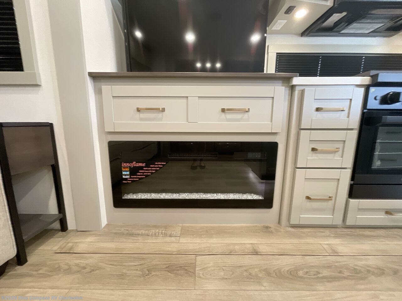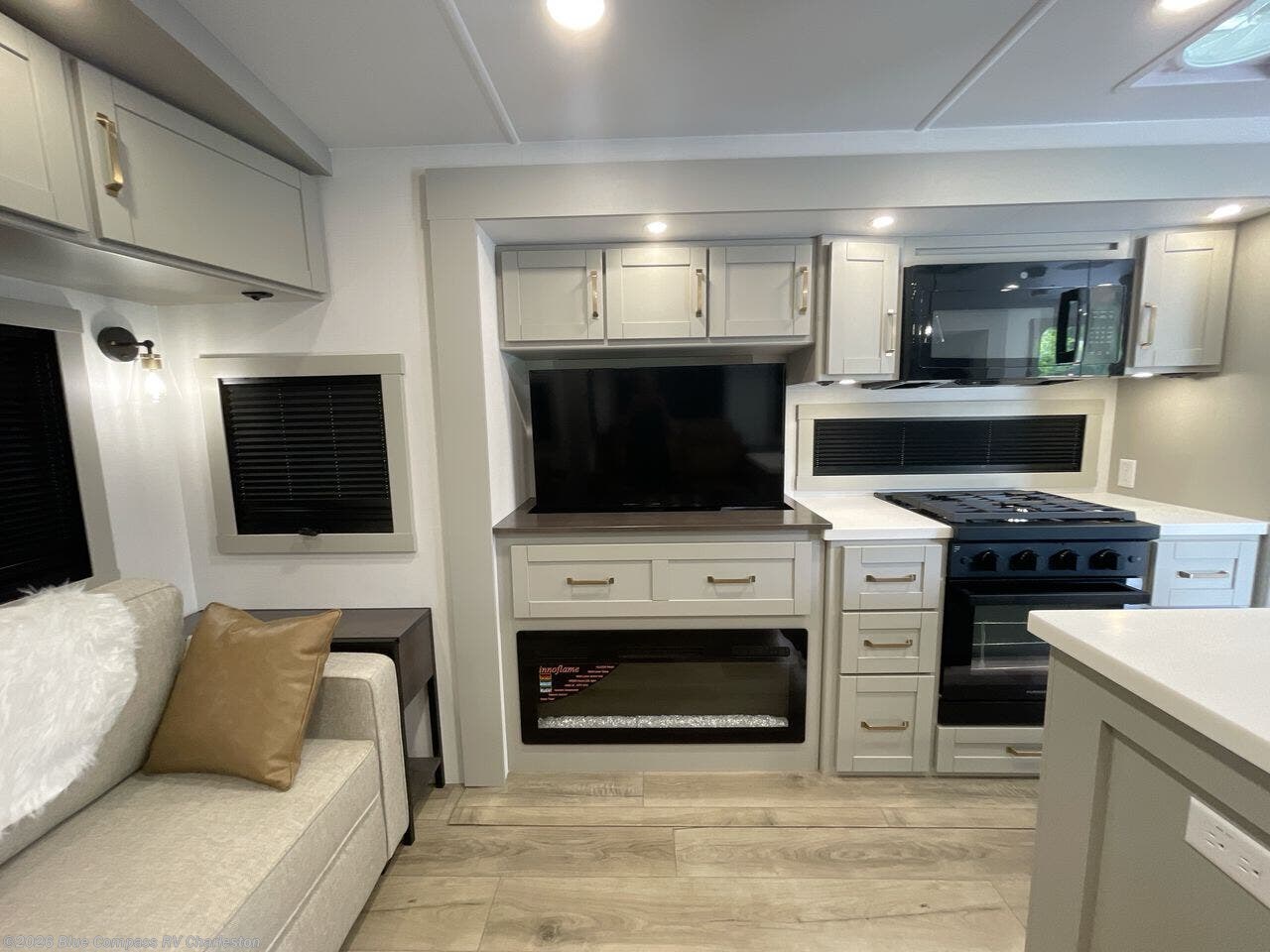 You will love all the space and features in this travel trailer! A luxurious rear living room offers plenty of room to spread out, with a 72" tri-fold sofa plus theater seats, all arranged with a perfect view of the 50" TV over the fireplace. A central kitchen area includes an island with hidden pet bowls. Find even more storage with the hutch plus pantry with adjustable shelves. The front bedroom comes with a queen bed, but if you'd like you can upgrade to a king for even more room. No matter which you choose, you will enjoy watching the 32" bedroom TV. The full-width wardrobe has room for all of your clothes and also includes prep for an optional washer and dryer. And the full bath includes a 30" x 42" one-piece fiberglass shower. Outside you'll enjoy two awnings, pass-through storage, and LED chassis lighting.