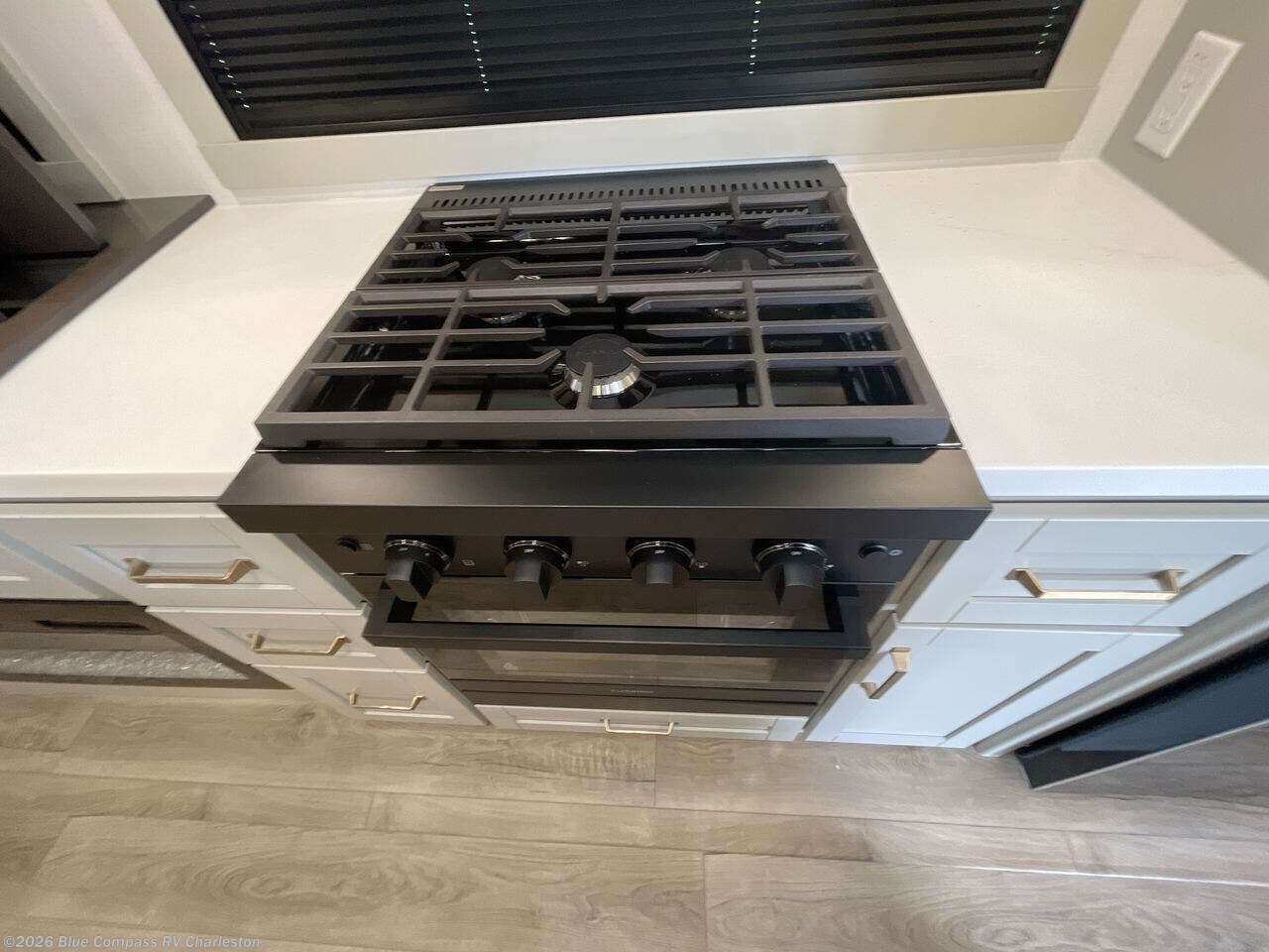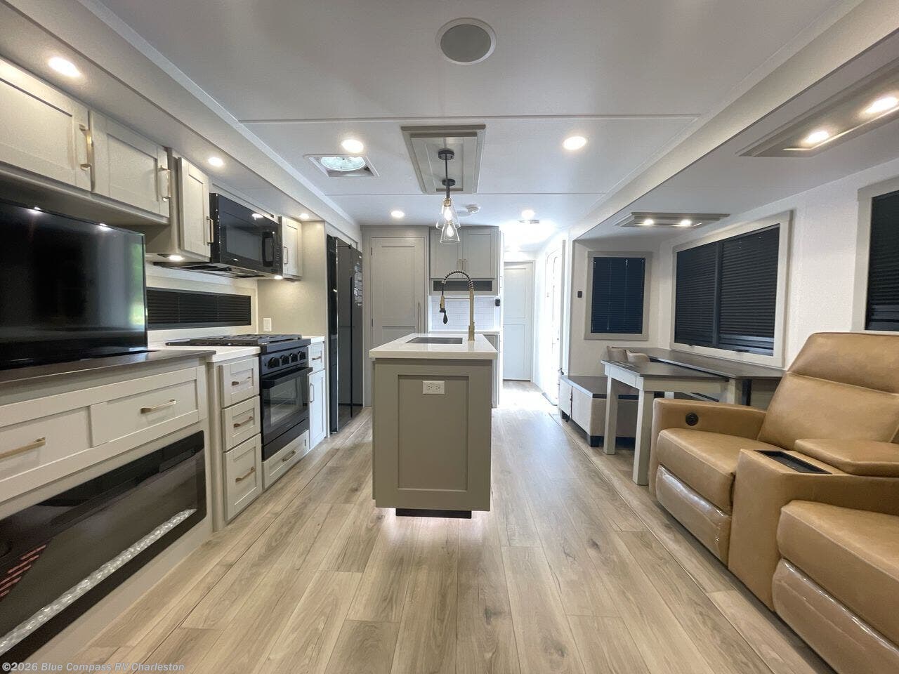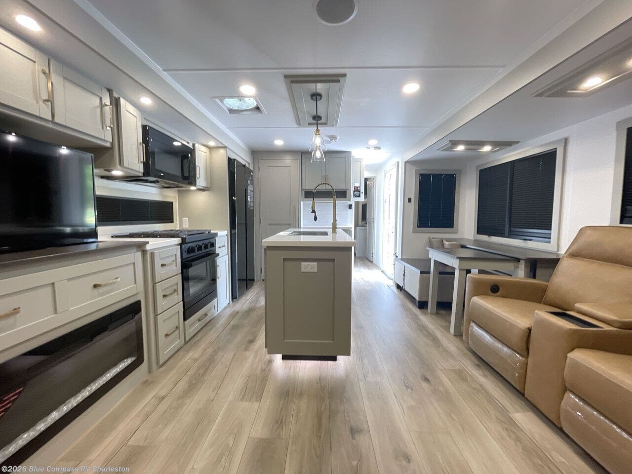 You will love all the space and features in this travel trailer! A luxurious rear living room offers plenty of room to spread out, with a 72" tri-fold sofa plus theater seats, all arranged with a perfect view of the 50" TV over the fireplace. A central kitchen area includes an island with hidden pet bowls. Find even more storage with the hutch plus pantry with adjustable shelves. The front bedroom comes with a queen bed, but if you'd like you can upgrade to a king for even more room. No matter which you choose, you will enjoy watching the 32" bedroom TV. The full-width wardrobe has room for all of your clothes and also includes prep for an optional washer and dryer. And the full bath includes a 30" x 42" one-piece fiberglass shower. Outside you'll enjoy two awnings, pass-through storage, and LED chassis lighting.