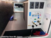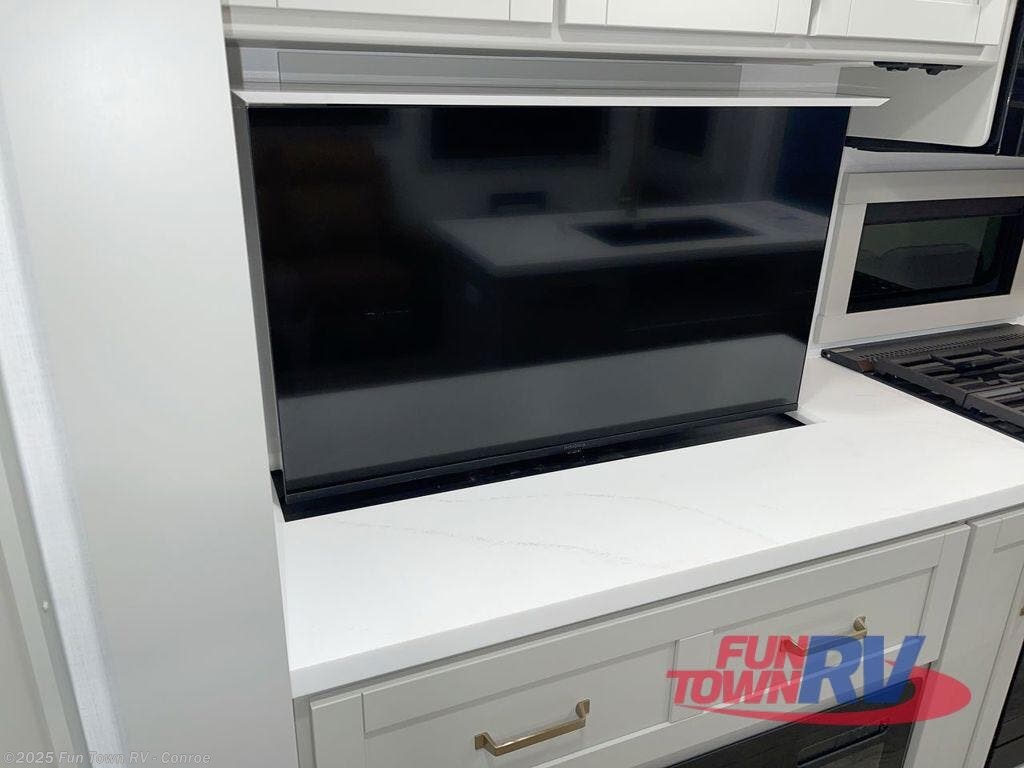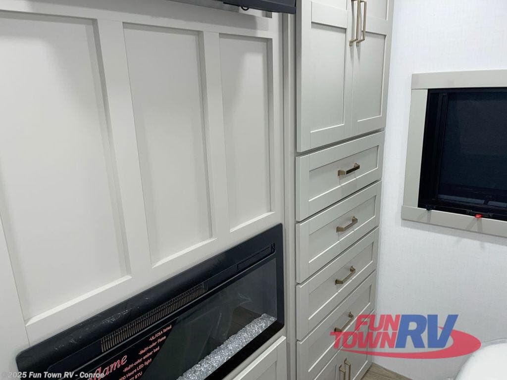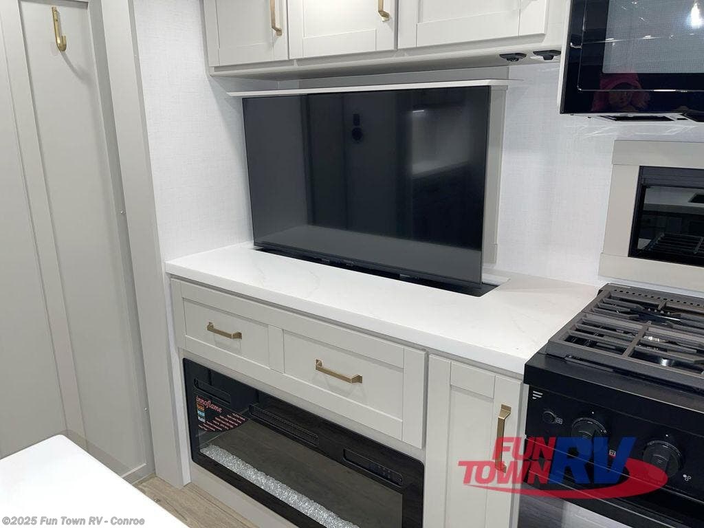 The whole gang will love camping in this spacious travel trailer for six to seven! Your guests or little ones will have the rear bunkhouse all to themselves, which includes a tri-fold sofa with a reclining back, a flip-up bunk, plus a second bunk bed across the room for even more sleeping space. There is even a bunkroom 42" Smart TV with a wardrobe for entertainment and storage! The front private bedroom includes a walk-around queen bed with four under-bed drawers for clothes, extra blankets and more. Head to the combined kitchen and living room to prep dinner on the kitchen island, relax on the theater seating, and dine at the sleeper dinette. There is also a pantry with adjustable shelves here, along with a hutch, 16 cu. ft. refrigerator that opens with the slide out, plus a televator and fireplace to make your space feel more like home! Outside, you'll find two power awnings, LED ground lighting, drop-frame pass-thru storage, and an outdoor kitchen with a refrigerator, sink, and storage!