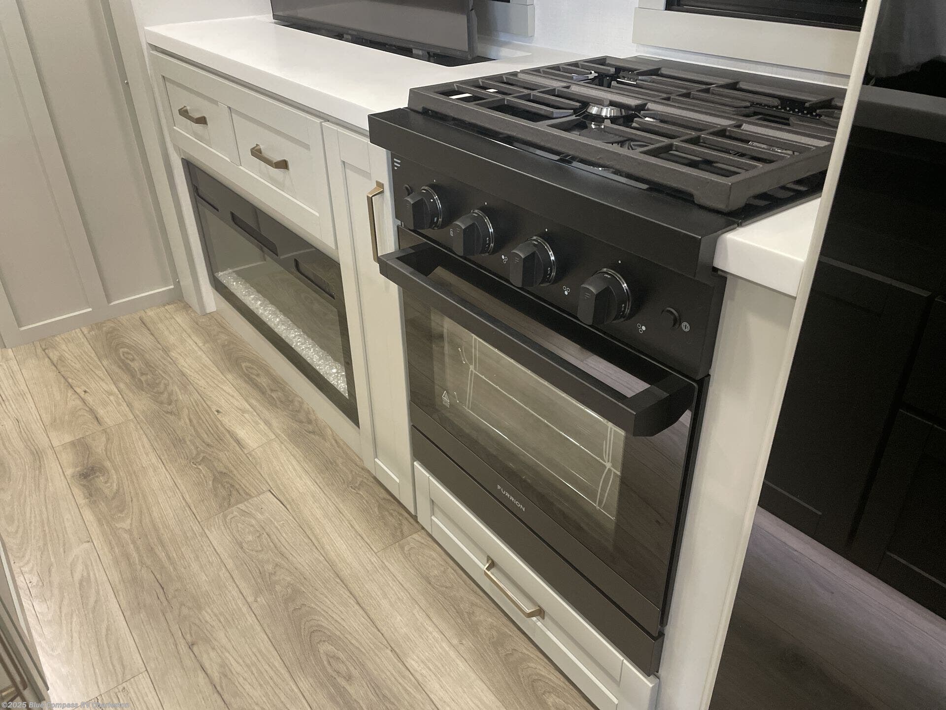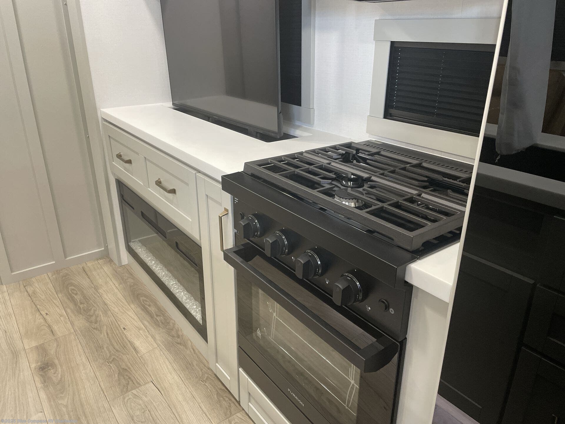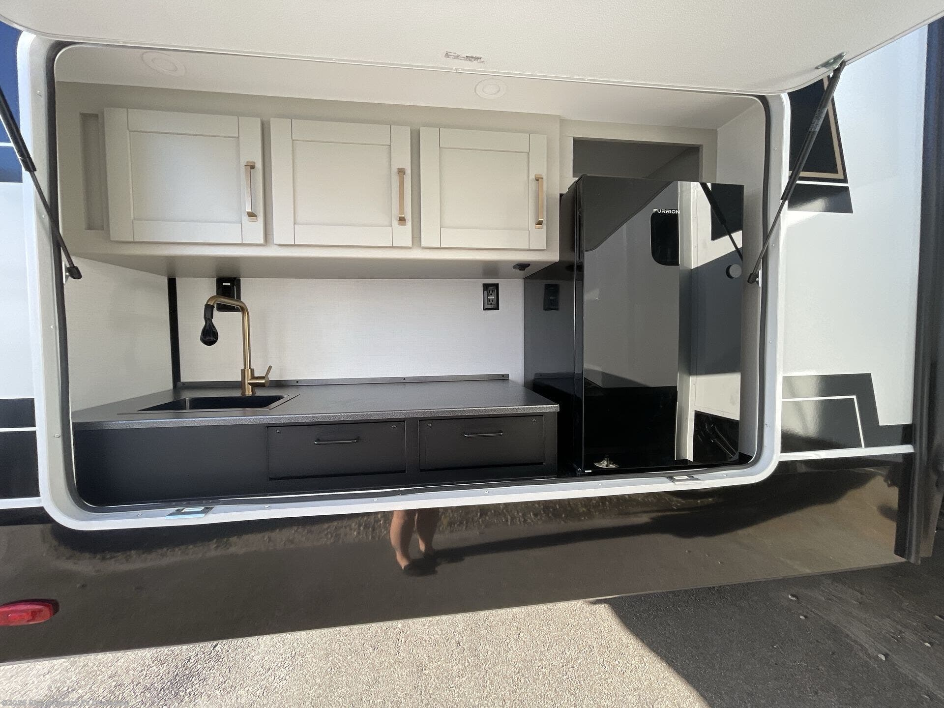 The whole gang will love camping in this spacious travel trailer for six to seven! Your guests or little ones will have the rear bunkhouse all to themselves, which includes a tri-fold sofa with a reclining back, a flip-up bunk, plus a second bunk bed across the room for even more sleeping space. There is even a bunkroom 42" Smart TV with a wardrobe for entertainment and storage! The front private bedroom includes a walk-around queen bed with four under-bed drawers for clothes, extra blankets and more. Head to the combined kitchen and living room to prep dinner on the kitchen island, relax on the theater seating, and dine at the sleeper dinette. There is also a pantry with adjustable shelves here, along with a hutch, 16 cu. ft. refrigerator that opens with the slide out, plus a televator and fireplace to make your space feel more like home! Outside, you'll find two power awnings, LED ground lighting, drop-frame pass-thru storage, and an outdoor kitchen with a refrigerator, sink, and storage!