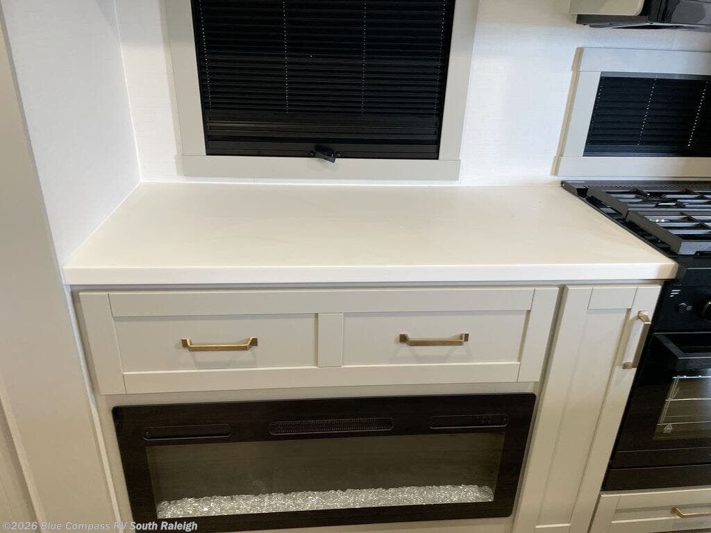 The whole gang will love camping in this spacious travel trailer for six to seven! Your guests or little ones will have the rear bunkhouse all to themselves, which includes a tri-fold sofa with a reclining back, a flip-up bunk, plus a second bunk bed across the room for even more sleeping space. There is even a bunkroom 42" Smart TV with a wardrobe for entertainment and storage! The front private bedroom includes a walk-around queen bed with four under-bed drawers for clothes, extra blankets and more. Head to the combined kitchen and living room to prep dinner on the kitchen island, relax on the theater seating, and dine at the sleeper dinette. There is also a pantry with adjustable shelves here, along with a hutch, 16 cu. ft. refrigerator that opens with the slide out, plus a televator and fireplace to make your space feel more like home! Outside, you'll find two power awnings, LED ground lighting, drop-frame pass-thru storage, and an outdoor kitchen with a refrigerator, sink, and storage!