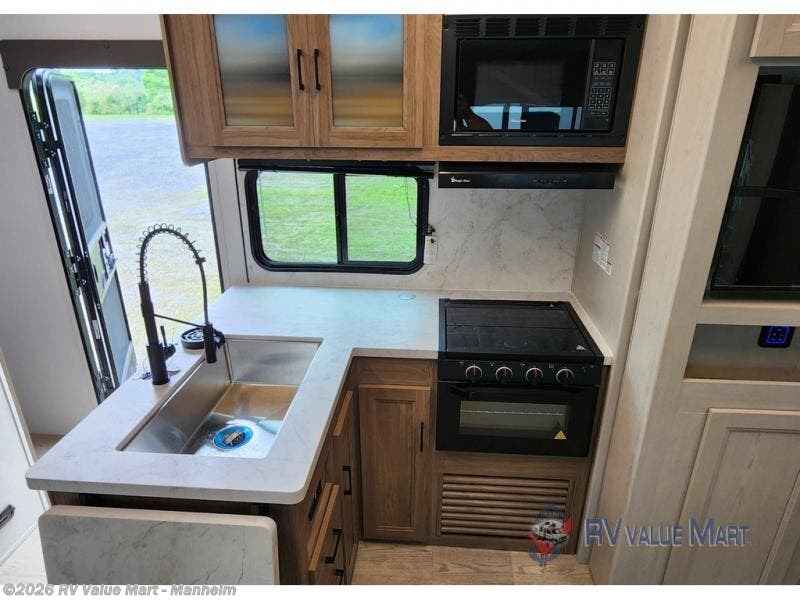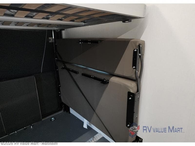 Looking for 13' of toy parking space, and sleeping space for six? You are going to love this model! You will appreciate the large cargo area for all your toys, and the extra sleeping space for family and friends with the roll over sofas converted and the overhead queen bed lift dropped down in the garage area. And the queen bed slide in the front master bedroom will be perfect for the owners. The chef of the family or group can prepare dinner on the three burner cooktop or use the microwave, and the double entry bath is conveniently located just inside the main side entry and includes a nice size shower, vanity with a sink and an overhead medicine cabinet. This toy hauler also includes dual entry/exit doors with the second one into the garage area. You will also find a rear pull down screen in the garage, pull-down roller night shades to be able to sleep in late, and a solar package to help you stay off-grid.