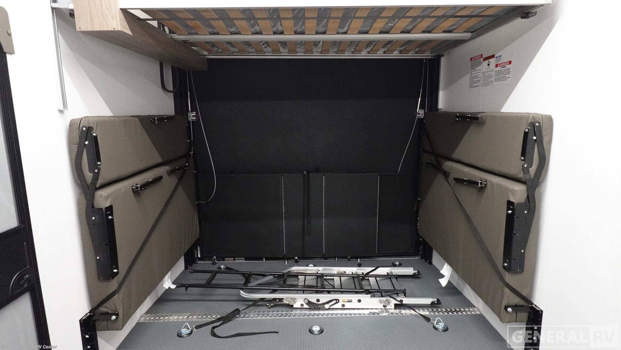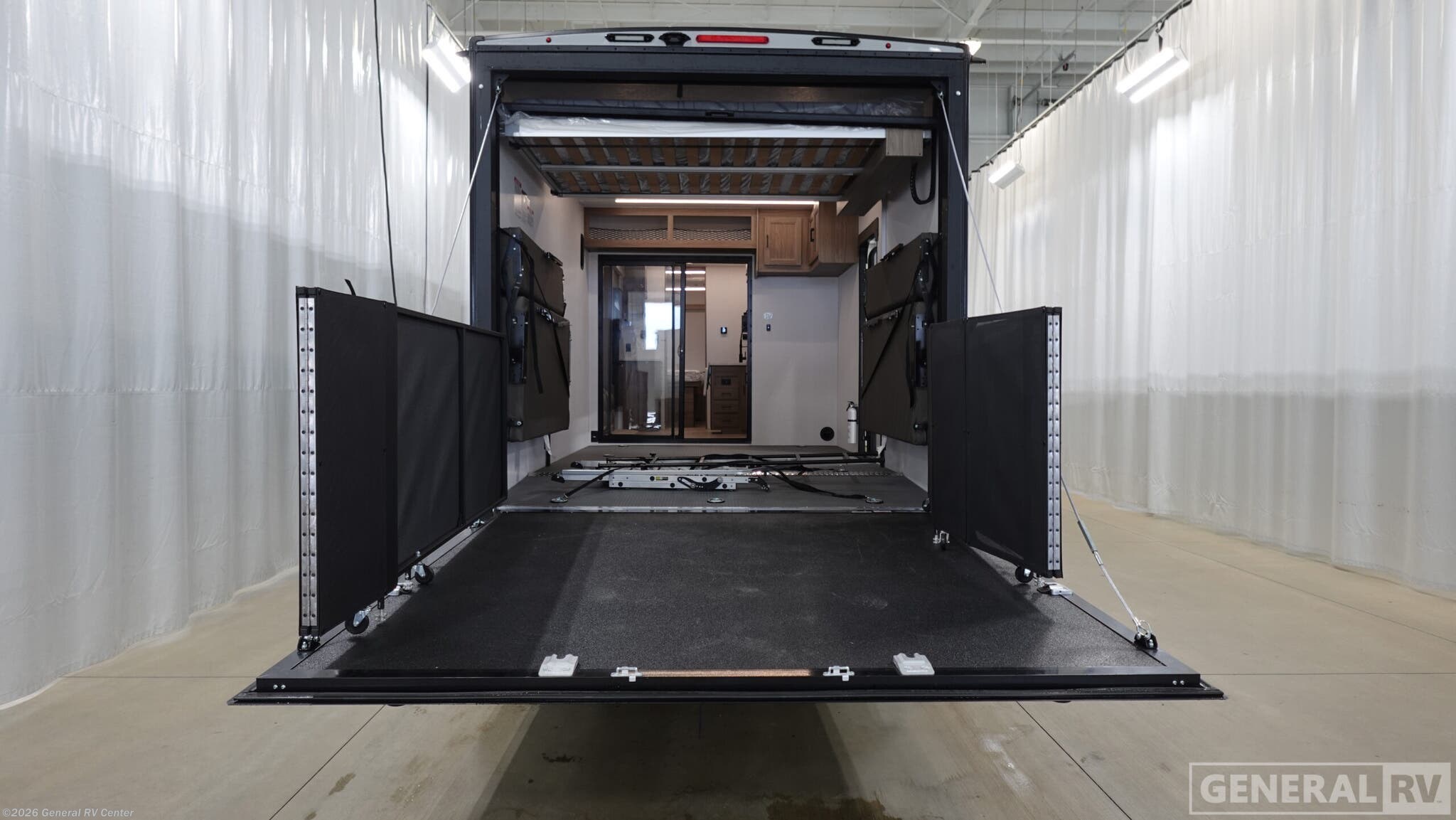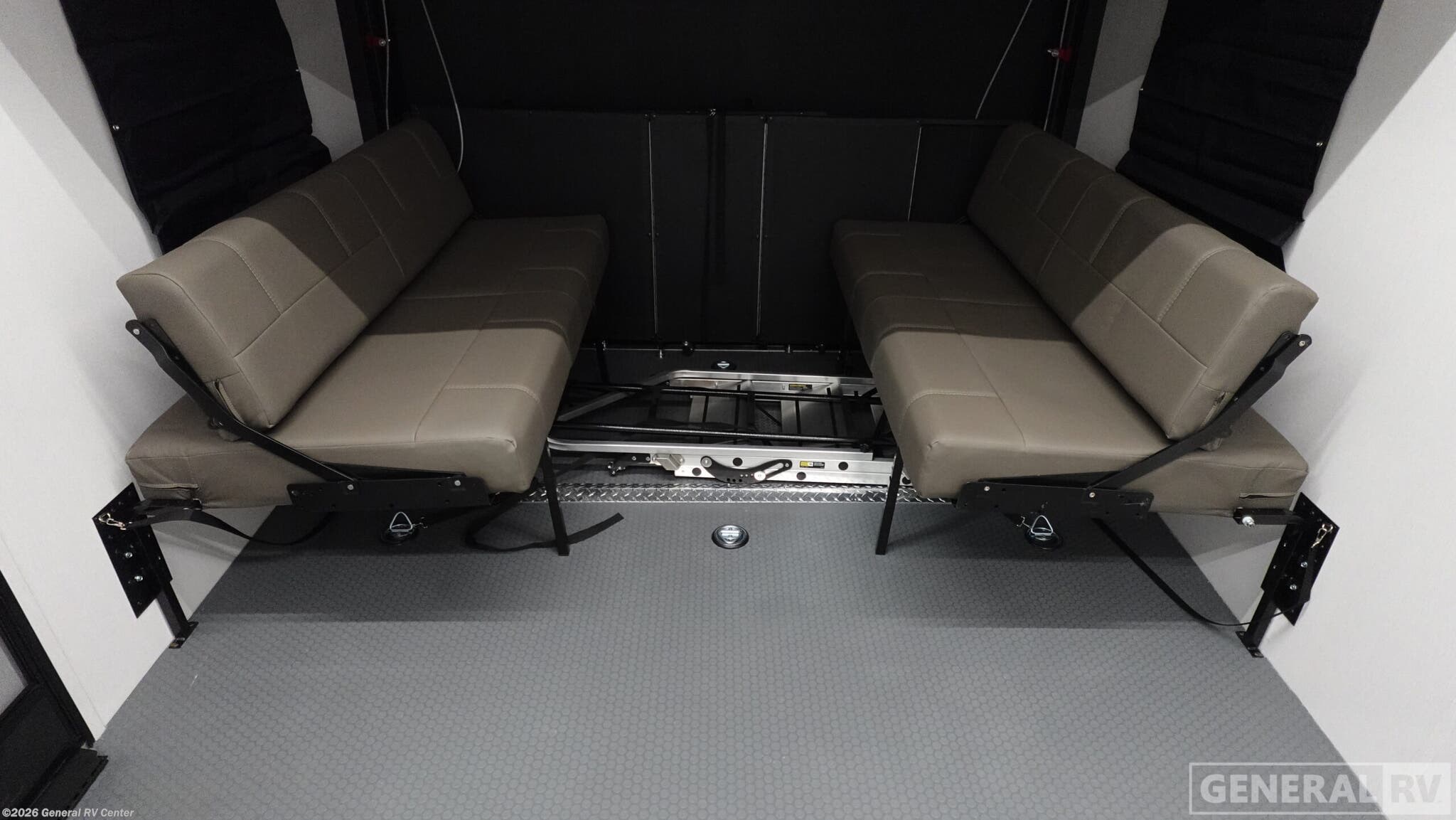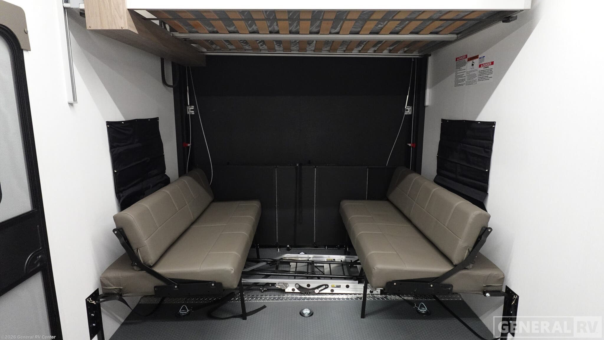Coachmen Adrenaline high profile toy hauler 30GS highlights: Dual Entry Theater Seats Dual Roll Over Sofas Queen Electric Lift Bed in Garage Storage Behind Swivel TV Looking for 13' of toy parking space, and sleeping space for six? You are going to love this model! You will appreciate the large cargo area for all your toys, and the extra sleeping space for family and friends with the roll over sofas converted and the overhead queen bed lift dropped down in the garage area. And the queen bed slide in the front master bedroom will be perfect for the owners. The chef of the family or group can prepare dinner on the burner cooktop or use the microwave, and the double entry bath is conveniently located just inside the main side entry and includes a nice size shower, vanity with a sink and an overhead medicine cabinet. This toy hauler also includes dual entry/exit doors with the second one into the garage area. You will also find a rear pull down screen in the garage, pull-down roller night shades to be able to sleep in late, and a 300W solar panel with MPPT control charger to help you stay off-grid. With any Adrenaline toy hauler travel trailer by Coachmen, the required Exterior Value package includes a one-piece Dicor Tufflex PVC roof membrane, a fiberglass front cap with rock guard to help against road debris, heavy duty Dexter axles, tinted safety glass windows, and aluminum wheels. Some exterior standards include a heated and enclosed underbelly, a patio ready ramp door with cables for an outdoor above ground space to enjoy, a power tongue jack for easy setup, and an outside spray port to clean off your toys. The interior standards include HD rubberized oil/gas/moisture resistant flooring in the garage area, hidden hinge cabinets and doors, indoor/outdoor Bluetooth speakers, and USB charging ports in multiple locations for your electronics to mention a few.