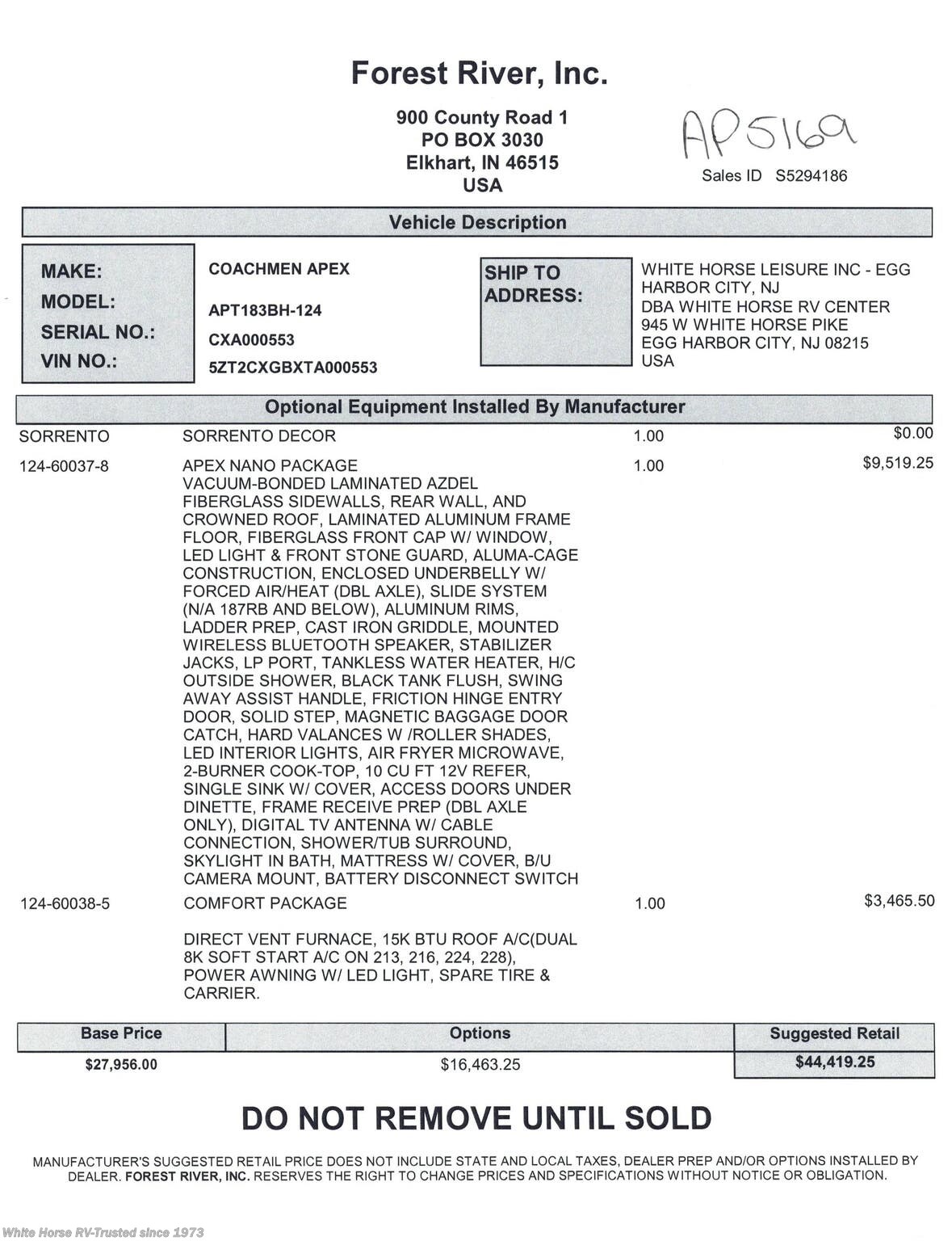 Request More Info on this 2026 Coachmen Apex Nano 183BH Offered for sale by White Horse RV Center