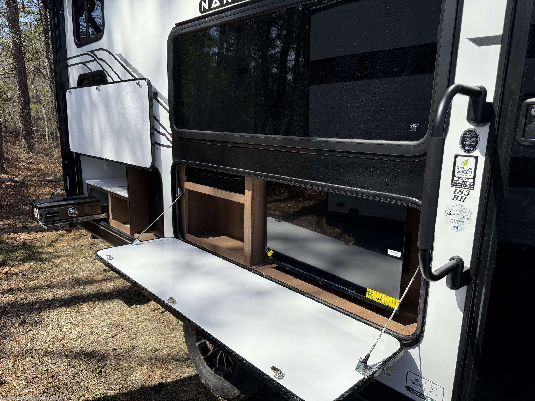 Awning, Black Tank Flush, Detachable, Fiberglass Sidewalls, Griddle, Ladder, Outside Kitchen, Power Awning, Power Roof Vent, Roof Vent, Skylight, Stabilizer Jacks -