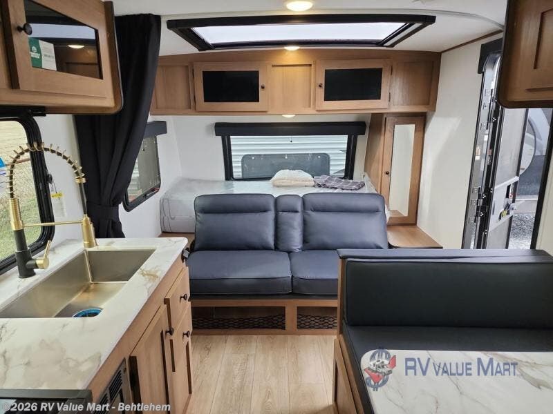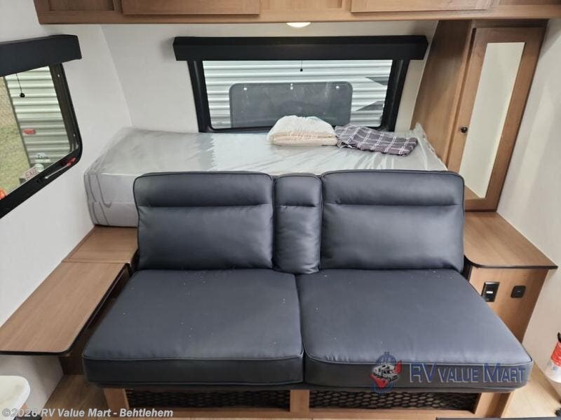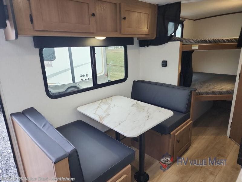 This travel trailer offers versatility with a front fixed bed or optional Murphy bed depending on your needs. There is a rear corner double bed bunk above a lower flip up double bed and a booth dinette that can transform into an extra sleeping space when you're not using it to enjoy a meal or play a card game. Everyone can stay clean with tub/shower in the rear corner bathroom and keep their bellies full with the two burner cooktop and 10 cu. ft. 12V refrigerator. You can even cook outdoors with the exterior camp kitchen while staying protected by the power awning with LED lighting!