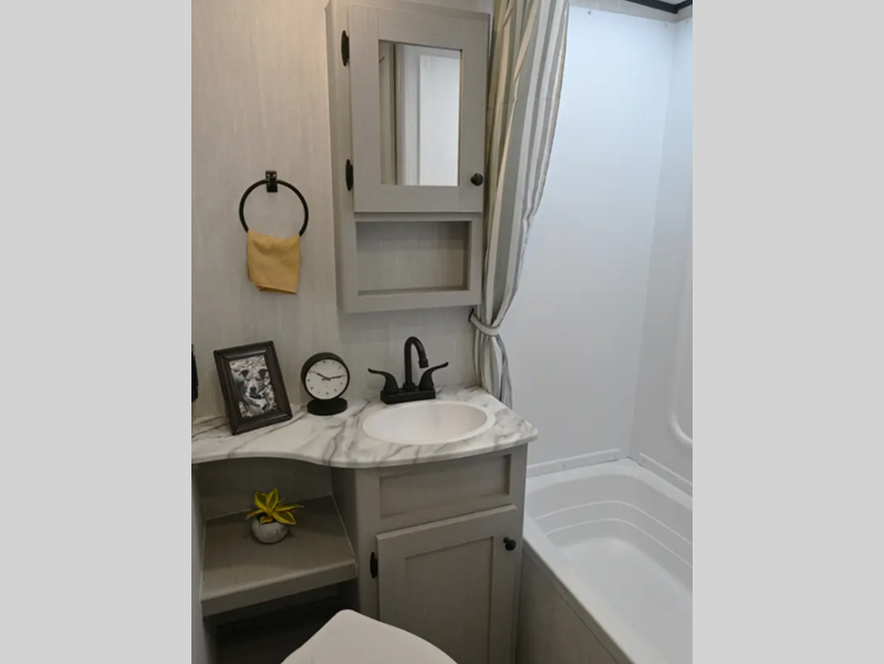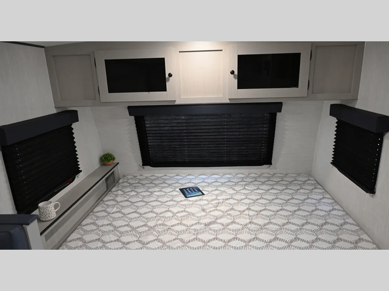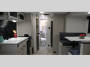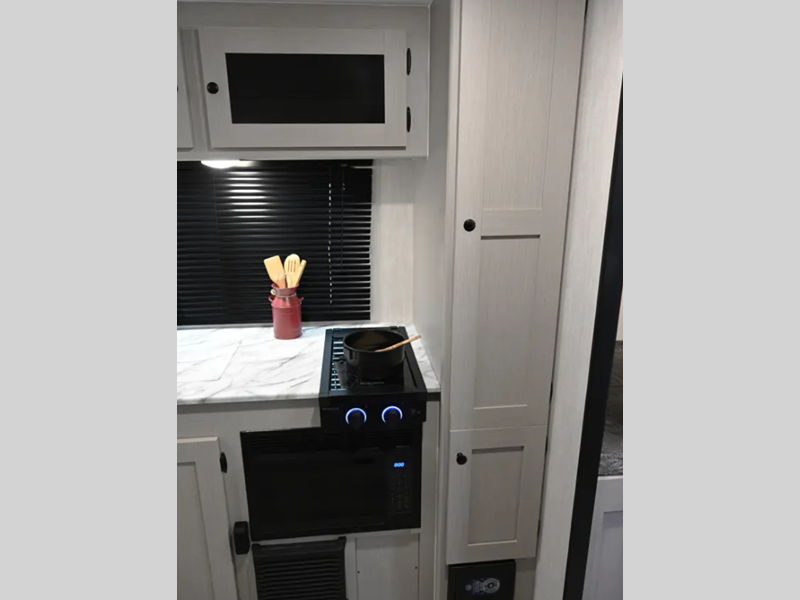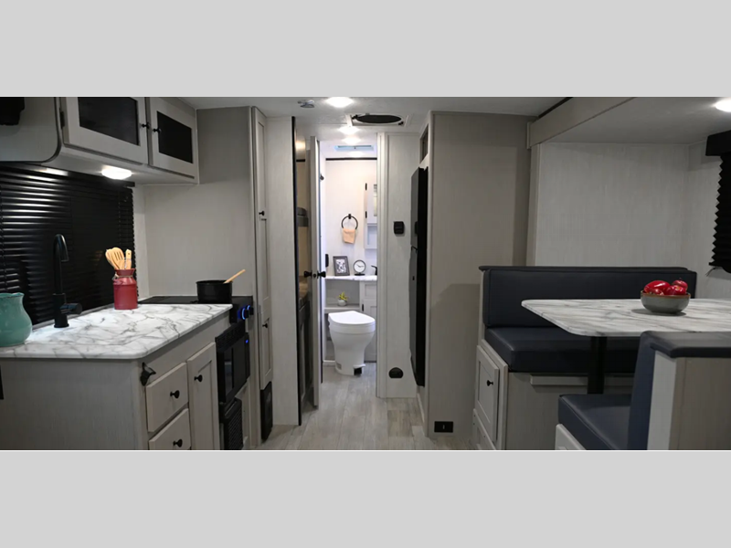 You will have more interior space with a booth dinette slide in this travel trailer! The chef will love cooking indoors with the two burner cooktop, microwave, and 8 cu. ft. 12V refrigerator, as well as outdoors with the exterior camp kitchen. Start each morning feeling clean and refreshed after sleeping on the front queen bed with a headboard and showering in the tub/shower inside the rear corner bathroom, plus the bathroom has a wardrobe to keep your towels close. The kids will love sleeping on the rear corner set of 30" x 74" bunk beds too!