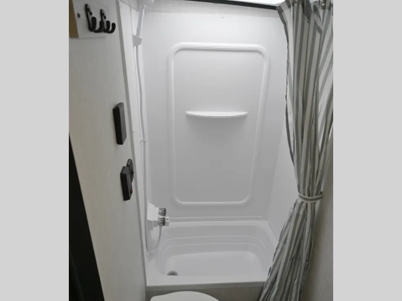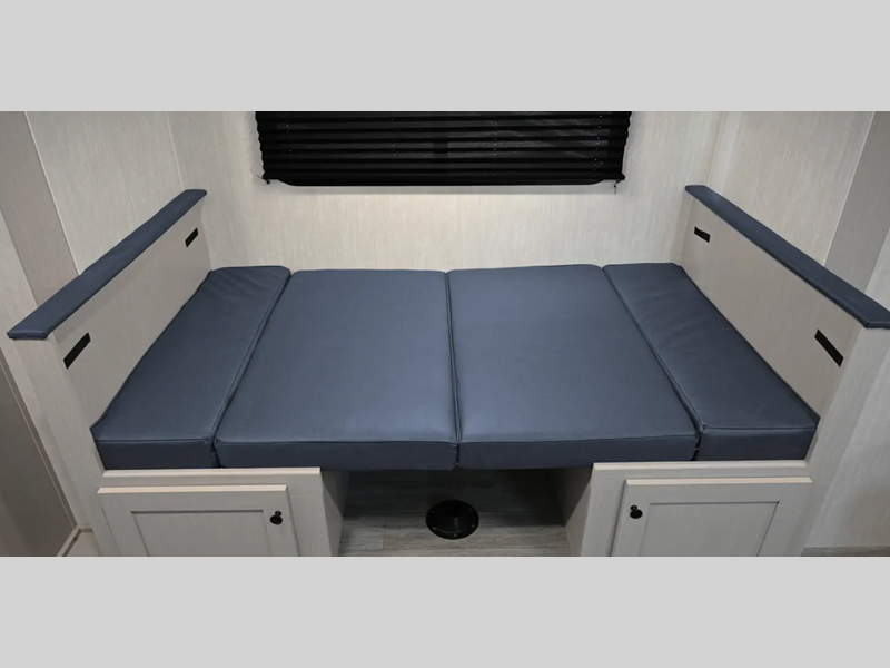 You and a few friends or family members can camp comfortably in this travel trailer! It features a front queen bed with wardrobes on either side to keep your clothes out of the way or you can switch it out for the optional Murphy bed for more versatility. Two others can sleep on the rear corner upper double bed and lower flip up double bed. After you have fried up some eggs on the two burner cooktop and heated up a piece of banana bread in the microwave, you can head to the booth dinette slide to enjoy it. There is even a pantry to store your coffee grounds and snacks. Now that your bellies are full, you can freshen up in the rear corner bathroom with the tub/shower.