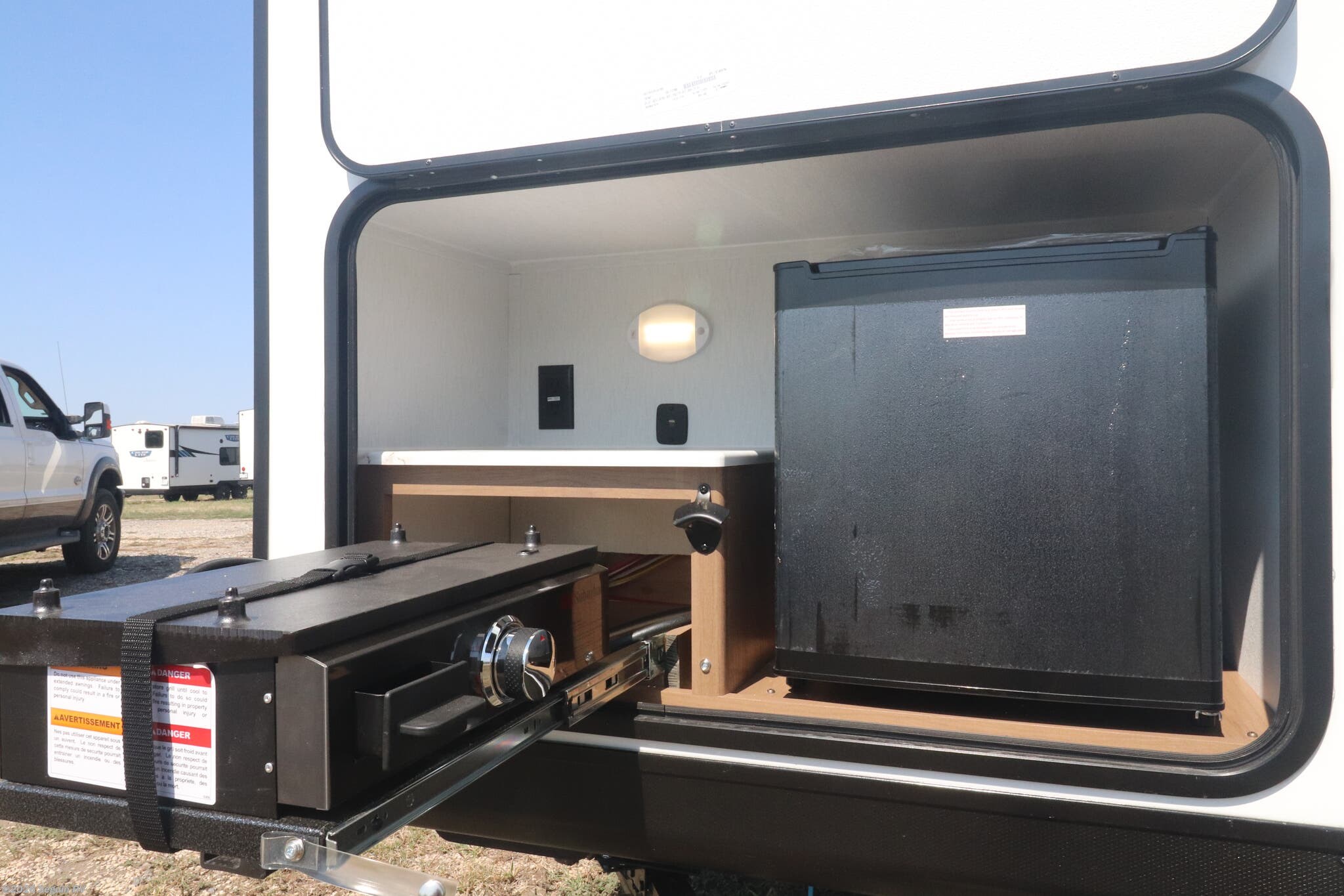 Awning, Black Tank Flush, Detachable, Fiberglass Sidewalls, Griddle, Ladder, Outside Kitchen, Power Awning, Power Roof Vent, Roof Vent, Skylight, Stabilizer Jacks -