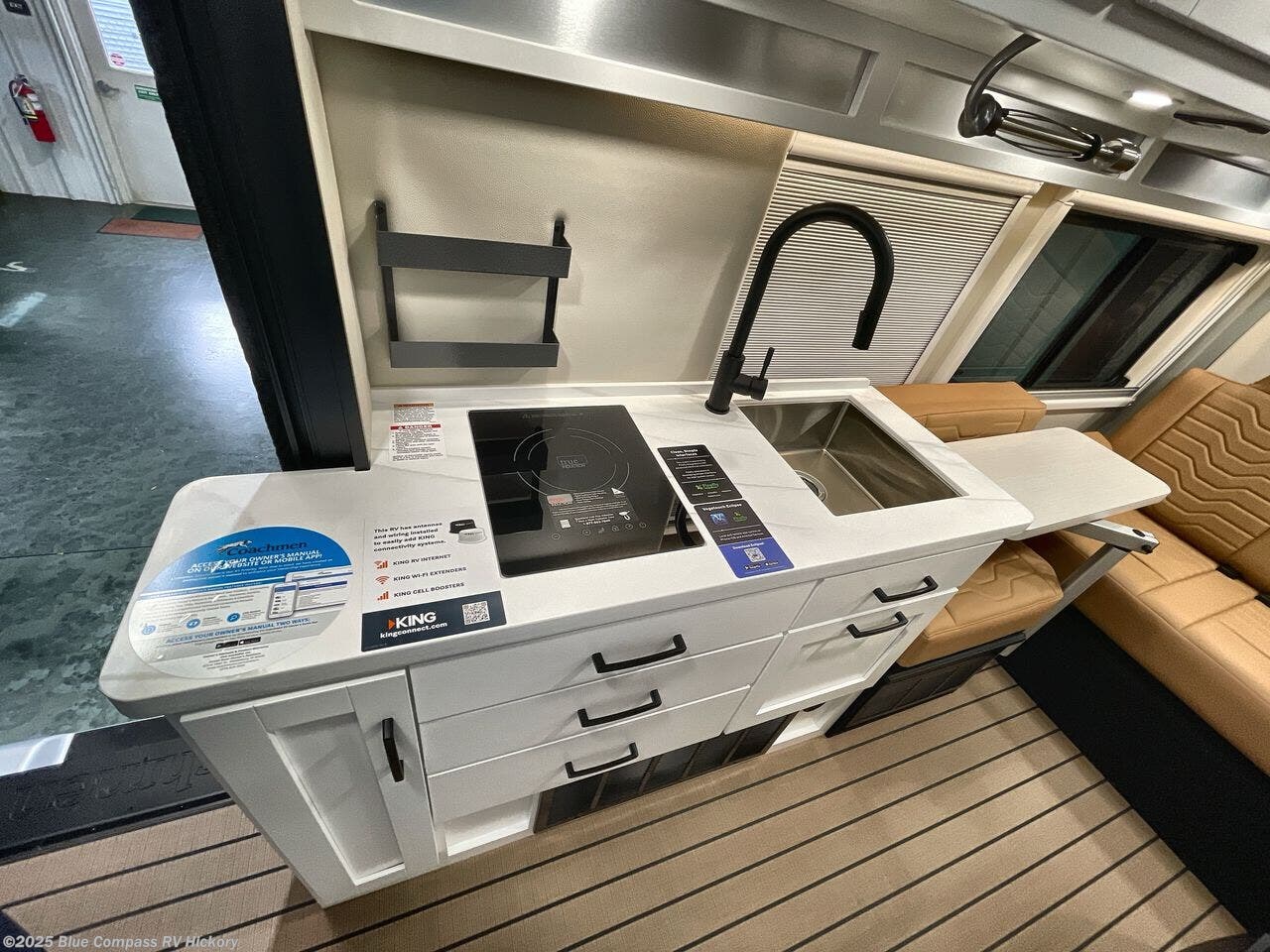 This all-wheel drive coach is perfect for trips near and far. Once you park, you can swivel the captain's seats around to enjoy lunch at the removeable table, and you can freshen up in the convenient wet bath before heading out to stretch your legs. There is an induction cooktop, a round sink, plus a Nova Kool compressor refrigerator for your perishables. The two jump seats and rear power sofa will convert to a comfortable bed at night, and the lagun table in between will allow you to play a game of cards before bed. And don't worry about storage space since this model includes overhead compartments and a wardrobe to keep your clothes wrinkle-free!