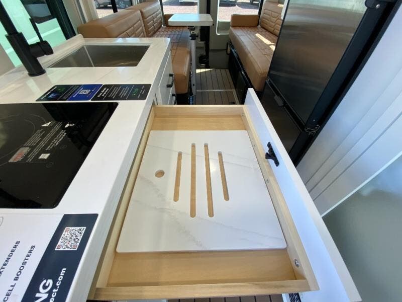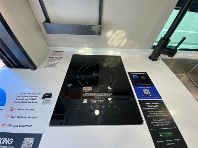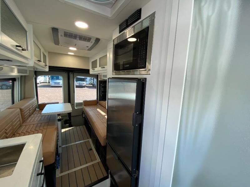 Plan out your trips in this versatile coach with luxury features. Since it is all-wheel drive you can go off the beaten path when the adventure calls for it, and the rear pull-down screen will allow you to let fresh air in when you park. There are two 23" x 76" sofas that will convert to a 68" x 76" bed when you're ready for some shut-eye, or you may just make day trips with friends since there are six seatbelts included. This Beyond galley includes an induction cooktop, a microwave oven, plus a Nova Kool compressor refrigerator, and the wet bath on board will allow you to stay clean throughout your many excursions.