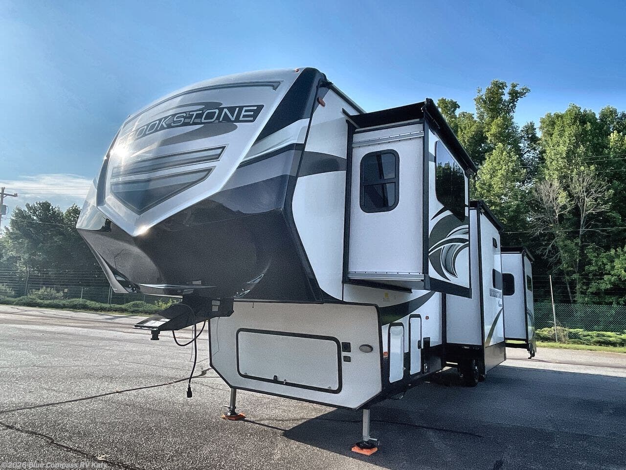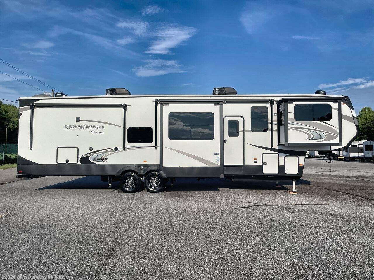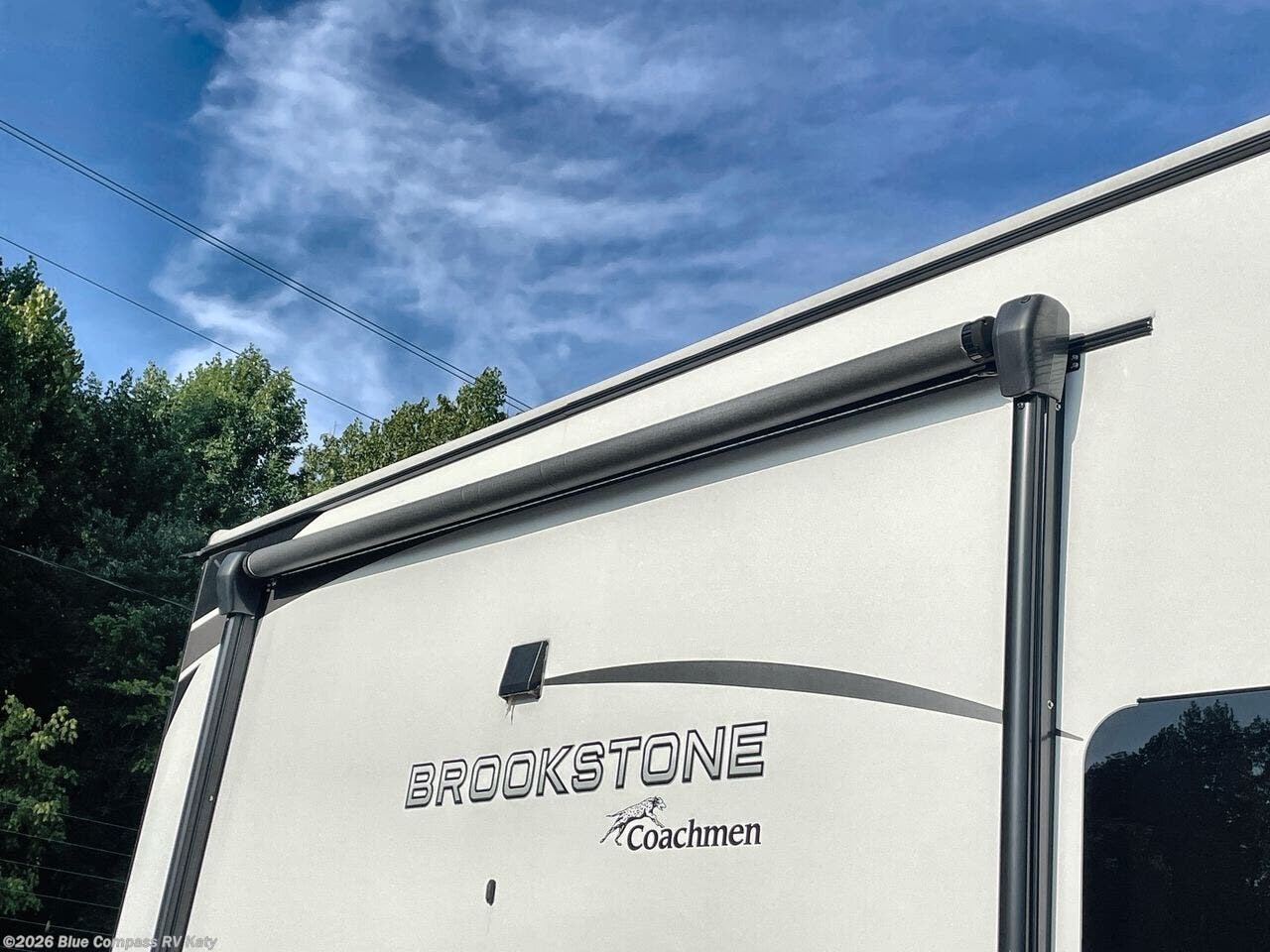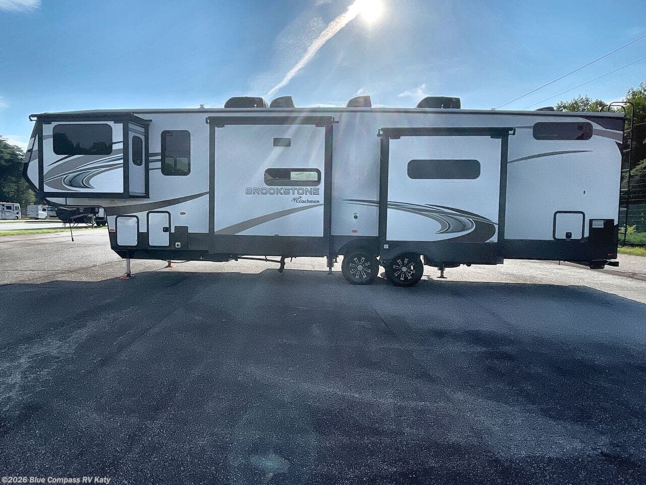 he Brookstone fifth wheels by Coachmen are coming to you with wide-body comfort, home-like amenities, and unique designs for a truly luxurious RV. The Weather Shield+ consists of a 6X double Azdel aluminum cage sidewall system, a Radiant Pro weather barrier system and more, all built to keep you in your fifth wheel comfortable and capable in varying weather. Head inside to find solid surface countertops in the kitchen, an 4K Smart LED TV in the living room, slow rise blackout roller night shades, and the list of comforts goes on! The Brookstone also includes 6-point electric auto-leveling, four step MORryde StepAbove main entry, an electric awning with LED lights, and many more exterior conveniences!