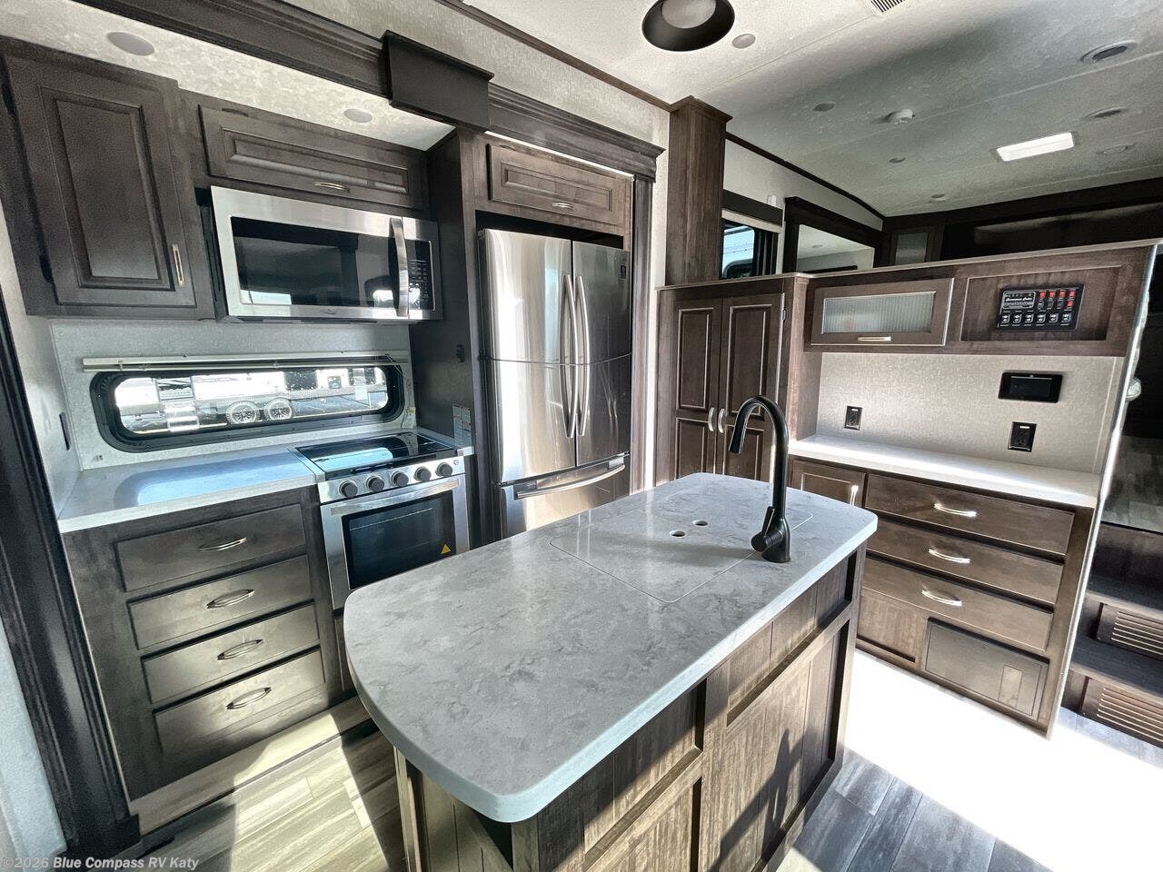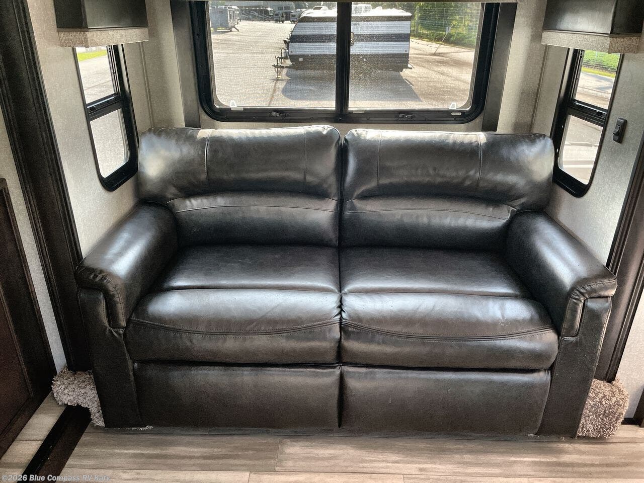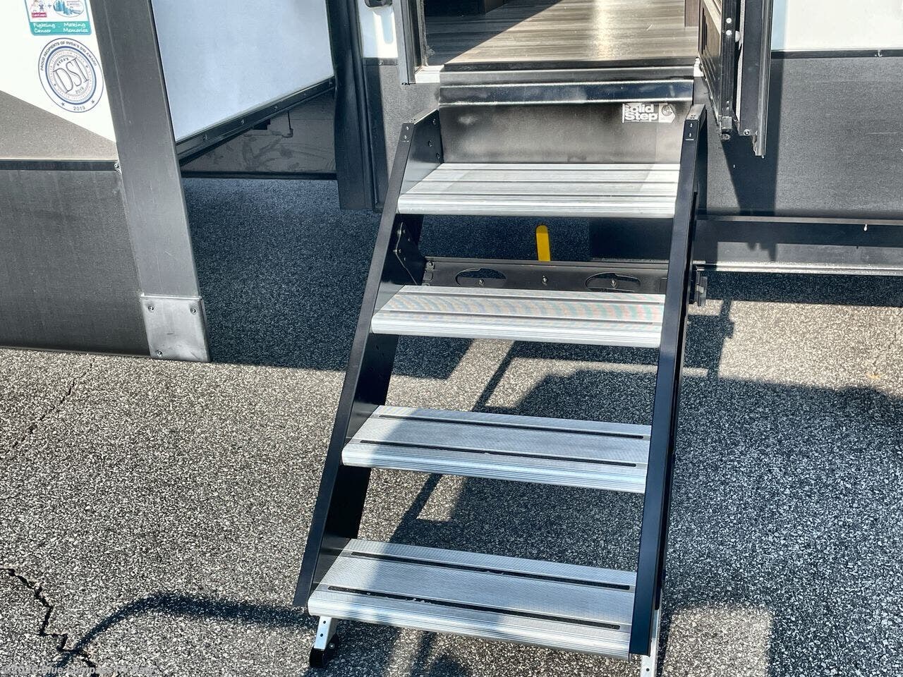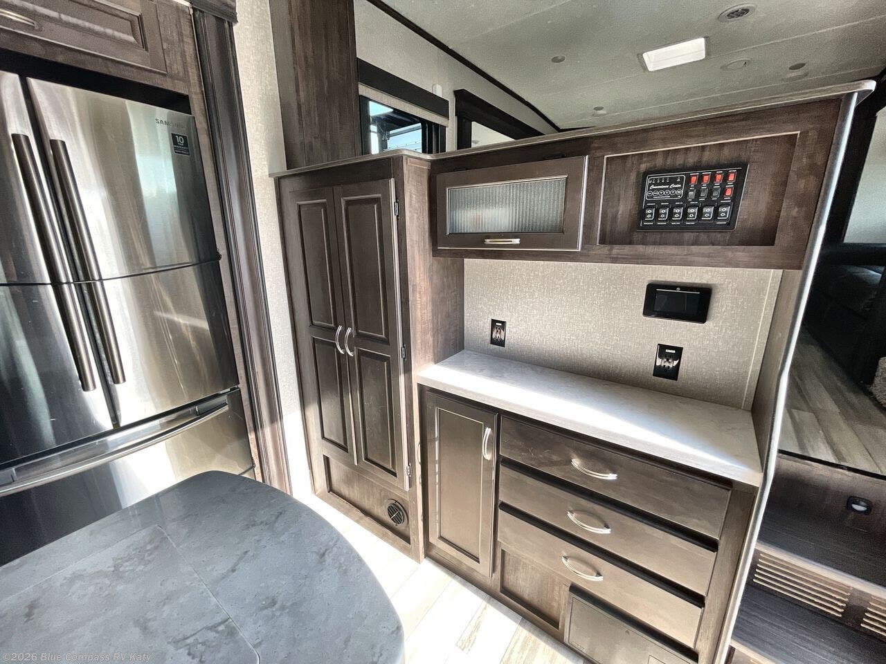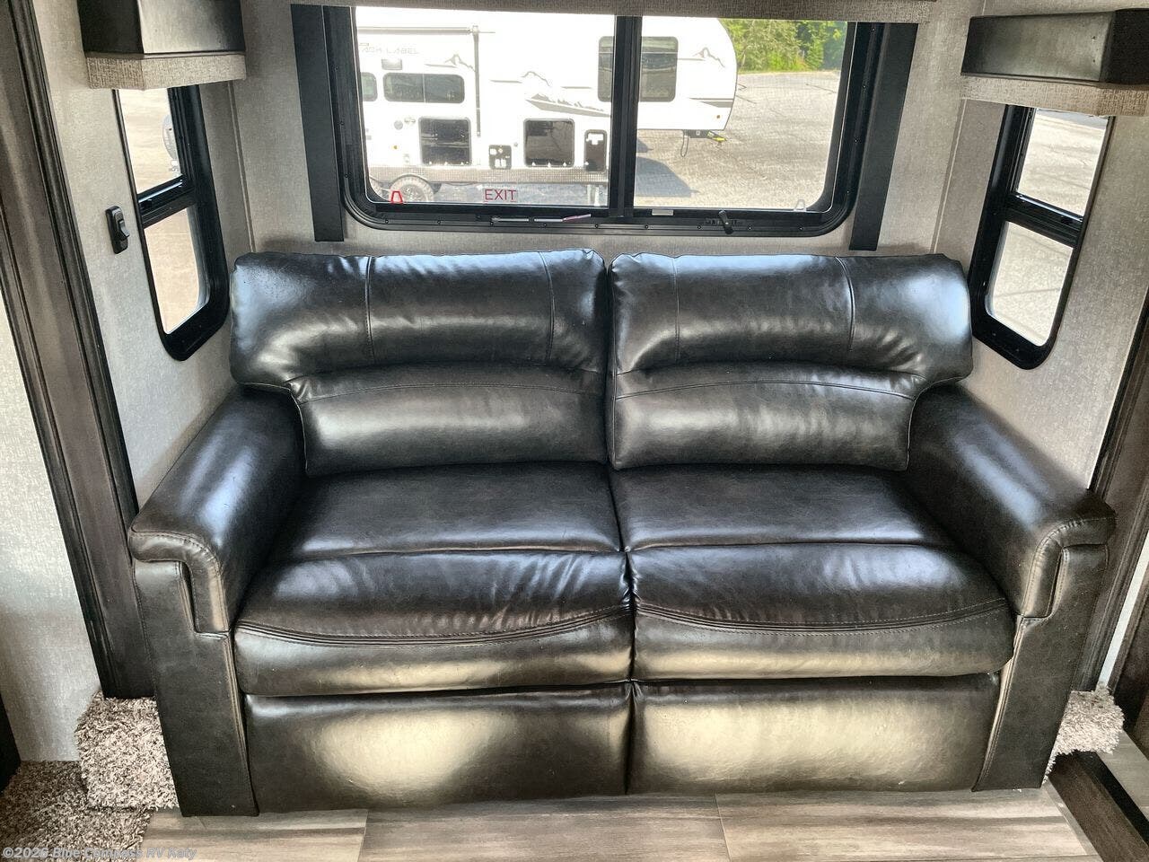 If you're looking for a luxury fifth wheel with more space and a larger sleeping capacity, you've found it! There are an impressive five slides, including dual opposing slides in the front living area and kitchen so you can really stretch out. Everyone will love to gather in the front living area on the two tri-fold sofas and theatre seating, and this room can become your guests' bedroom at night. The little ones will love to play a game at the free-standing table while the chef cooks dinner on the residential cooktop with a stainless steel oven. You'll also find a pantry here for dry goods and a 12V refrigerator for perishables. The feature that really stands out in this model is the master suite, take a look! A king bed slide and you'll have a dresser and a wardrobe for your clothes, plus access to the full bathroom. The spacious full rear bath includes a large shower with a seat, a large dual sink vanity, and a wardrobe with washer and dryer prep. And we didn't even mention the outside refrigerator that will be perfect for cold drinks under the 14' power awning!