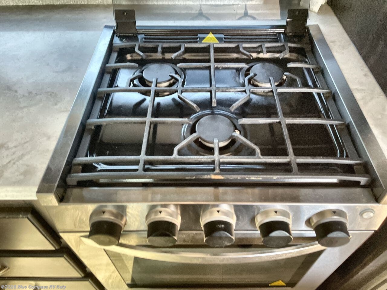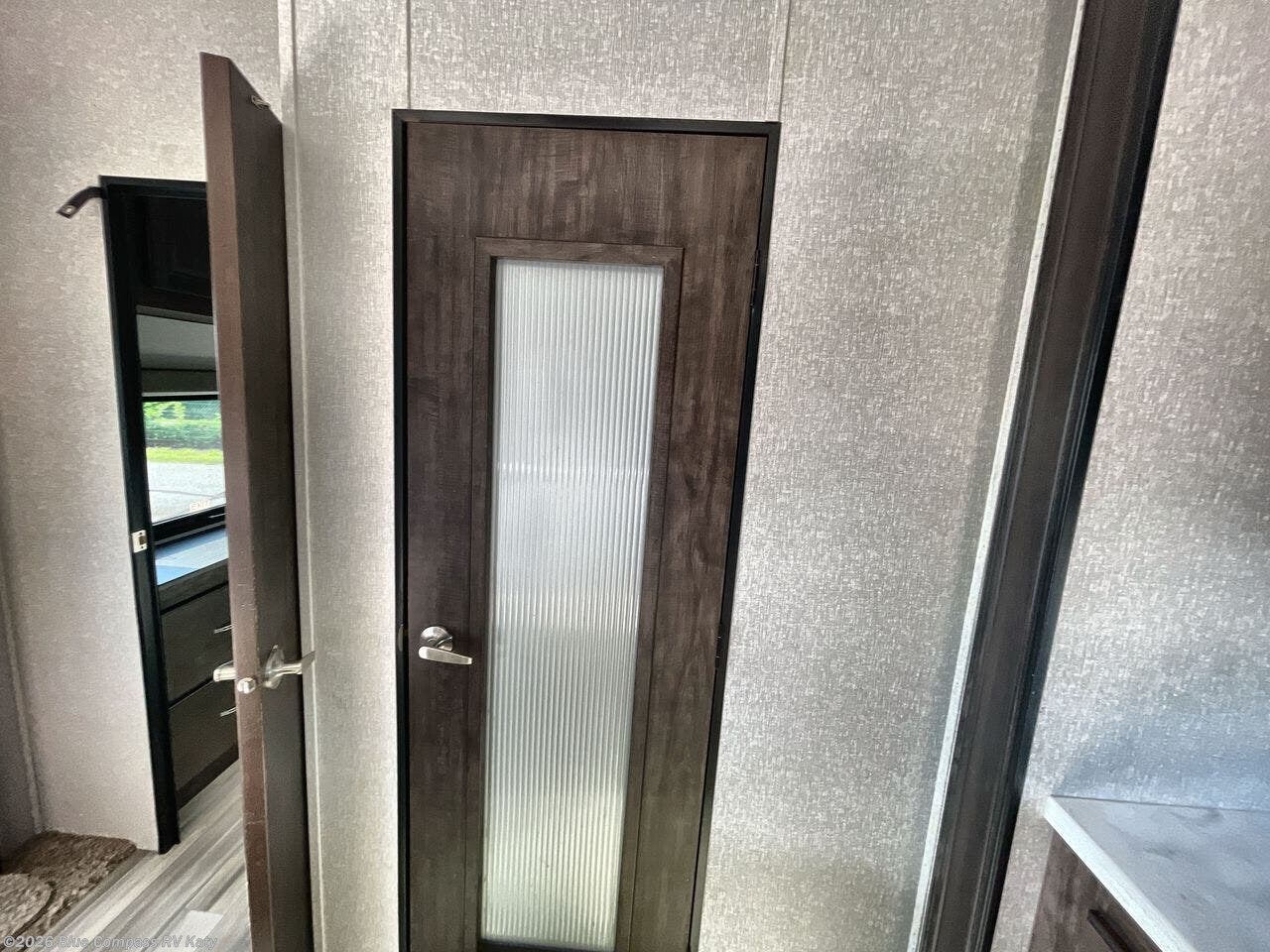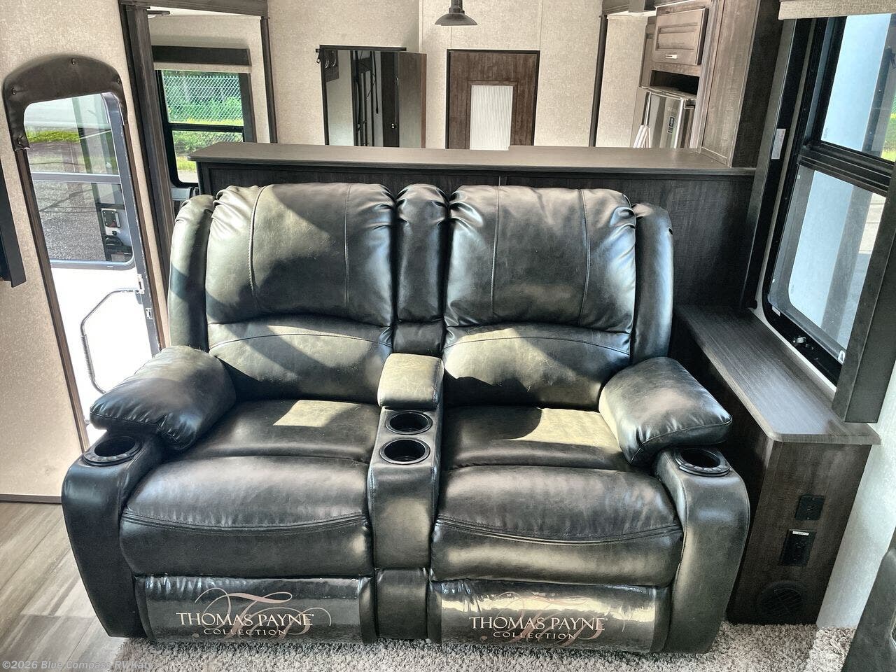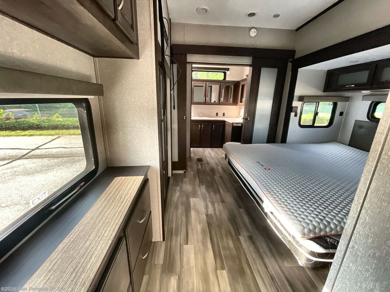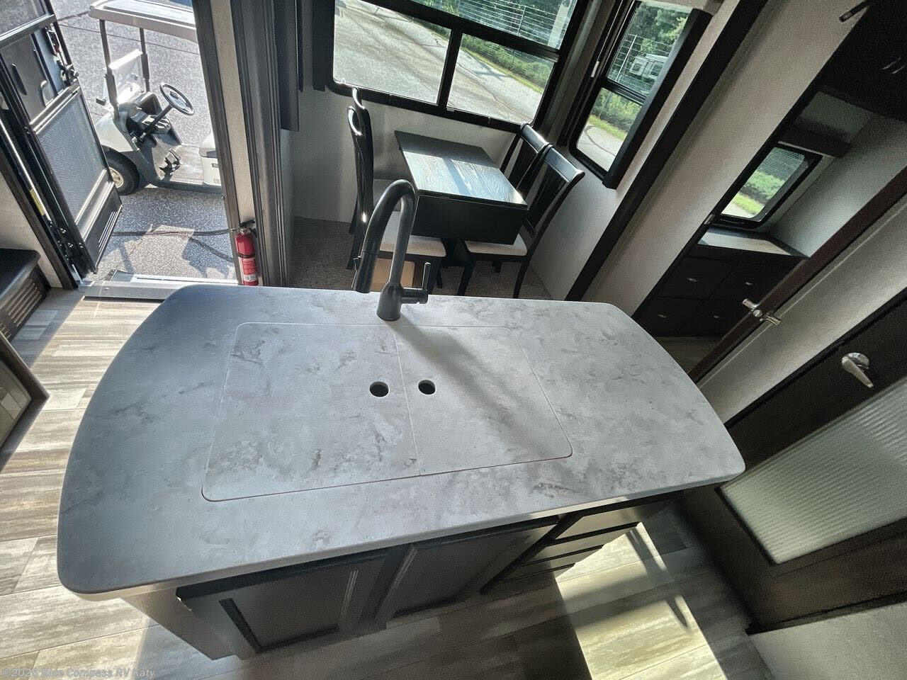If you're looking for a luxury fifth wheel with more space and a larger sleeping capacity, you've found it! There are an impressive five slides, including dual opposing slides in the front living area and kitchen so you can really stretch out. Everyone will love to gather in the front living area on the two tri-fold sofas and theatre seating, and this room can become your guests' bedroom at night. The little ones will love to play a game at the free-standing table while the chef cooks dinner on the residential cooktop with a stainless steel oven. You'll also find a pantry here for dry goods and a 12V refrigerator for perishables. The feature that really stands out in this model is the master suite, take a look! A king bed slide and you'll have a dresser and a wardrobe for your clothes, plus access to the full bathroom. The spacious full rear bath includes a large shower with a seat, a large dual sink vanity, and a wardrobe with washer and dryer prep. And we didn't even mention the outside refrigerator that will be perfect for cold drinks under the 14' power awning!