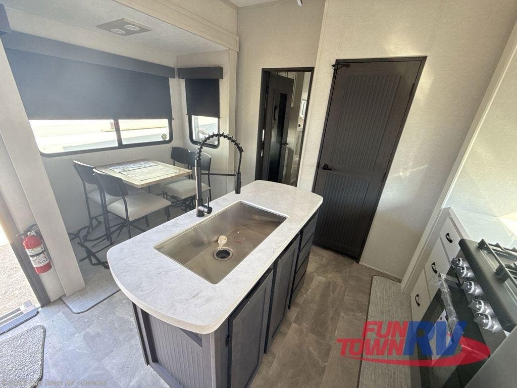 If you're looking for a luxury fifth wheel with more space and a larger sleeping capacity, you've found it! There are an impressive five slides, including dual opposing slides in the front living area and kitchen so you can really stretch out. Everyone will love to gather in the front living area on the two tri-fold sofas and theatre seating, and this room can become your guests' bedroom at night. The little ones will love to play a game at the free-standing table while the chef cooks dinner on the residential cooktop with a stainless steel oven. You'll also find a pantry here for dry goods and a 12V refrigerator for perishables. The feature that really stands out in this model is the master suite, take a look! A king bed slide and you'll have a dresser and a wardrobe for your clothes, plus access to the full bathroom. The spacious full rear bath includes a large shower with a seat, a large dual sink vanity, and a wardrobe with washer and dryer prep. And we didn't even mention the outside refrigerator that will be perfect for cold drinks under the 14' power awning!