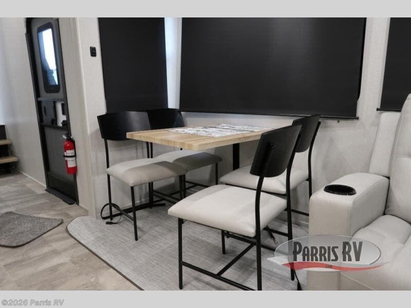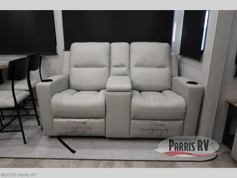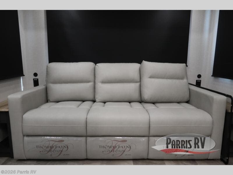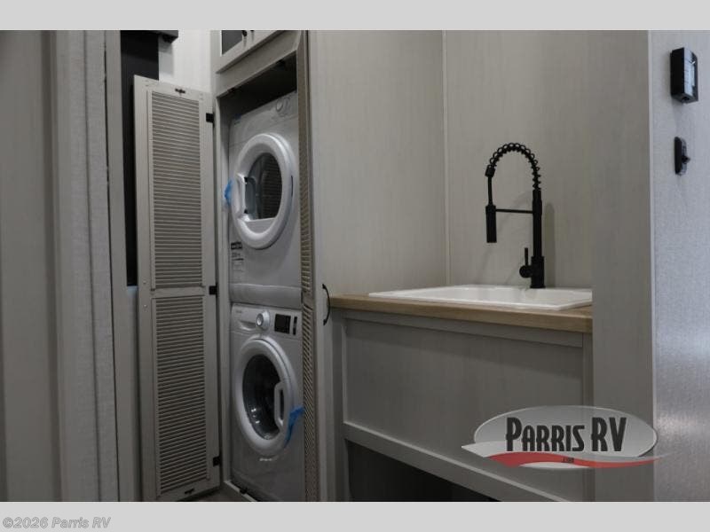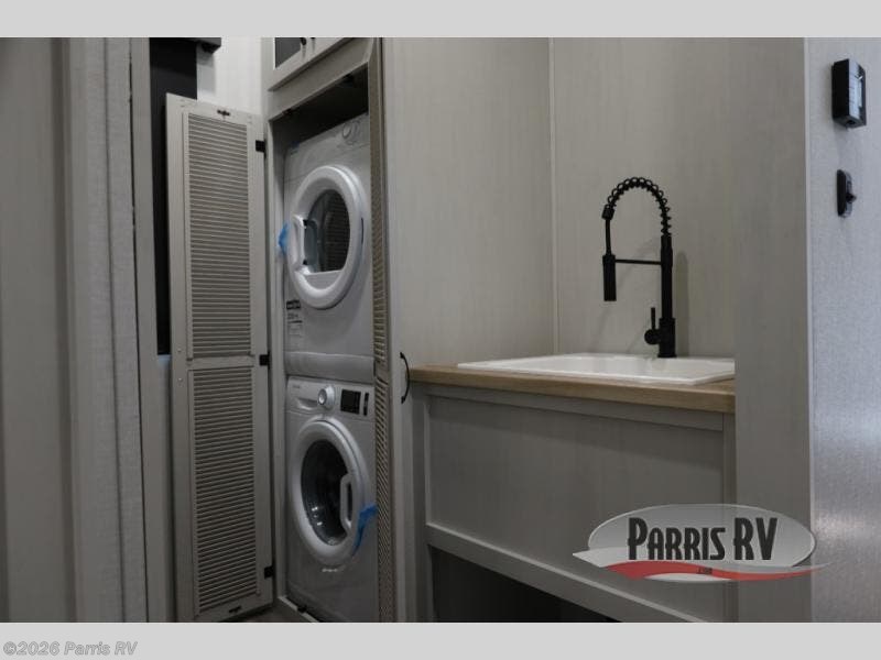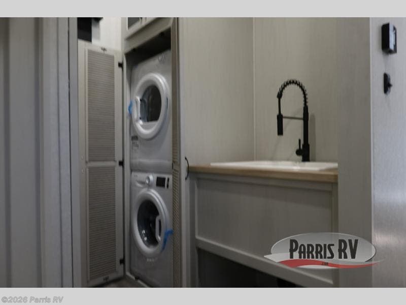 The rear living room is the perfect place to unwind, featuring a 78” trifold sofa, theater seating, overhead cabinets, and an entertainment center. Whether you're watching a movie, reading a book, or simply enjoying the company of loved ones, this room has everything you need to relax and recharge. The spacious kitchen is fitted with a kitchen island, refrigerator, microwave, free-standing table, hutch, and overhead cabinets. Perfect for preparing your favorite meals and enjoy with family. With a convenient coat bench, desk with flip-up storage, washer, and dryer, you'll have everything you need to stay organized and comfortable on the go. The full bathroom is an enormous oasis with a linen closet for added convenience. Also with a front bedroom featuring a king bed, dresser, shelves, and wardrobe, you'll have the perfect place to rest and recharge after a long day of adventure, also plenty of space for storing all your belongings and staying organized on the road.