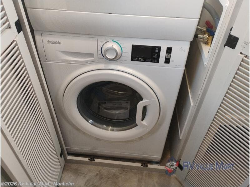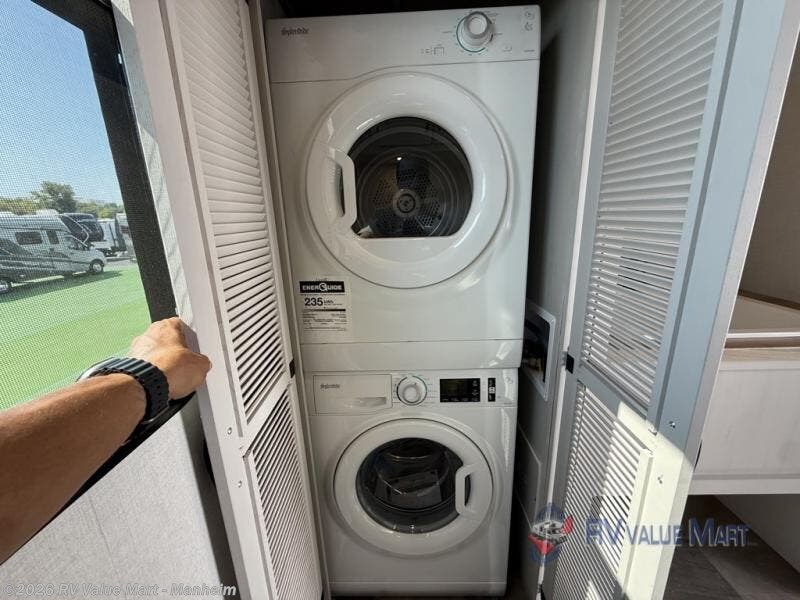 The rear living room is the perfect place to unwind, featuring a 78” trifold sofa, theater seating, overhead cabinets, and an entertainment center. Whether you're watching a movie, reading a book, or simply enjoying the company of loved ones, this room has everything you need to relax and recharge. The spacious kitchen is fitted with a kitchen island, refrigerator, microwave, free-standing table, hutch, and overhead cabinets. Perfect for preparing your favorite meals and enjoy with family. With a convenient coat bench, desk with flip-up storage, washer, and dryer, you'll have everything you need to stay organized and comfortable on the go. The full bathroom is an enormous oasis with a linen closet for added convenience. Also with a front bedroom featuring a king bed, dresser, shelves, and wardrobe, you'll have the perfect place to rest and recharge after a long day of adventure, also plenty of space for storing all your belongings and staying organized on the road.