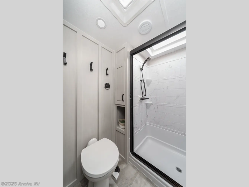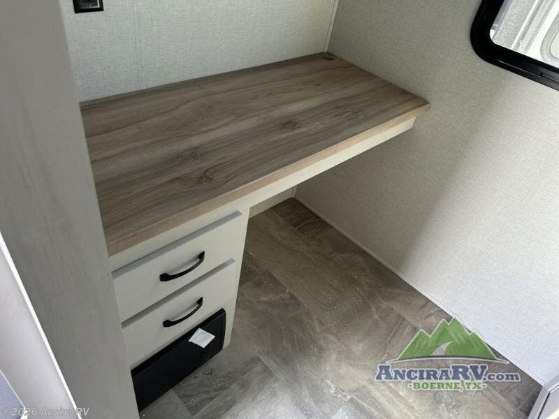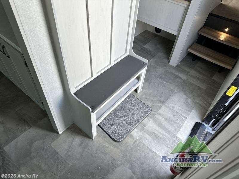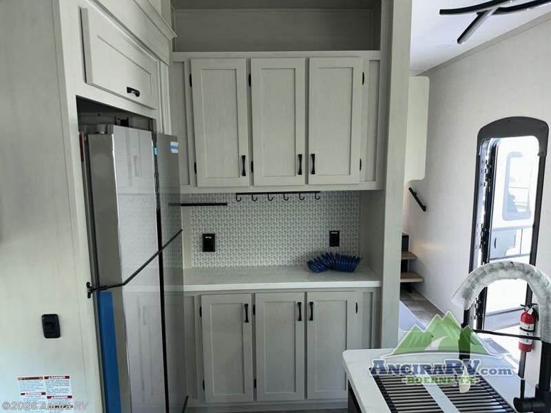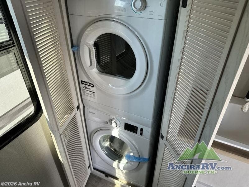 The rear living room is the perfect place to unwind, featuring a 78” trifold sofa, theater seating, overhead cabinets, and an entertainment center. Whether you're watching a movie, reading a book, or simply enjoying the company of loved ones, this room has everything you need to relax and recharge. The spacious kitchen is fitted with a kitchen island, refrigerator, microwave, free-standing table, hutch, and overhead cabinets. Perfect for preparing your favorite meals and enjoy with family. With a convenient coat bench, desk with flip-up storage, washer, and dryer, you'll have everything you need to stay organized and comfortable on the go. The full bathroom is an enormous oasis with a linen closet for added convenience. Also with a front bedroom featuring a king bed, dresser, shelves, and wardrobe, you'll have the perfect place to rest and recharge after a long day of adventure, also plenty of space for storing all your belongings and staying organized on the road.